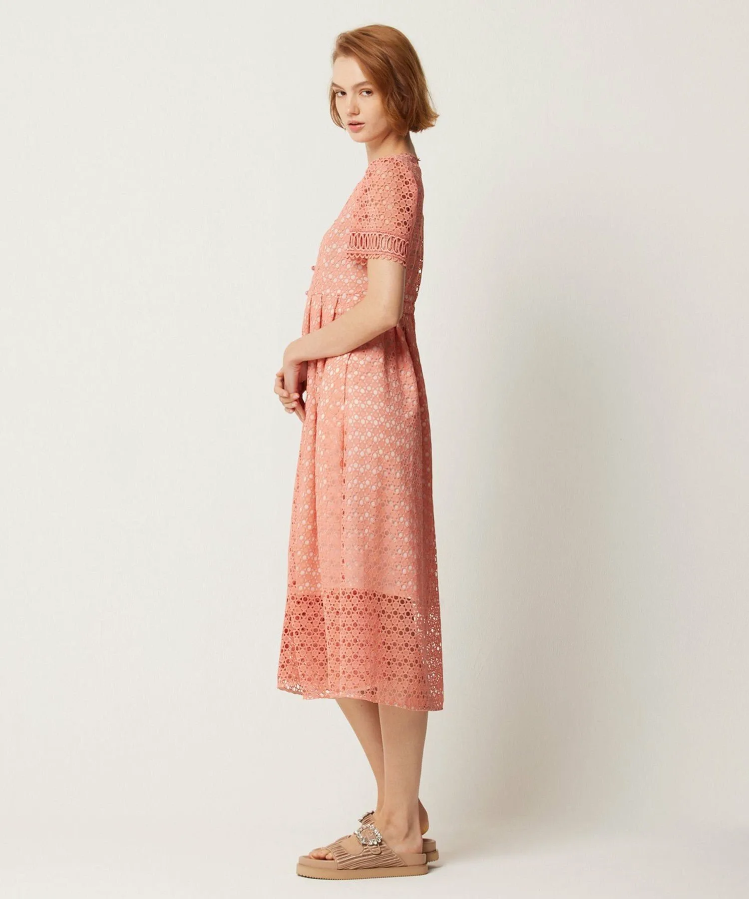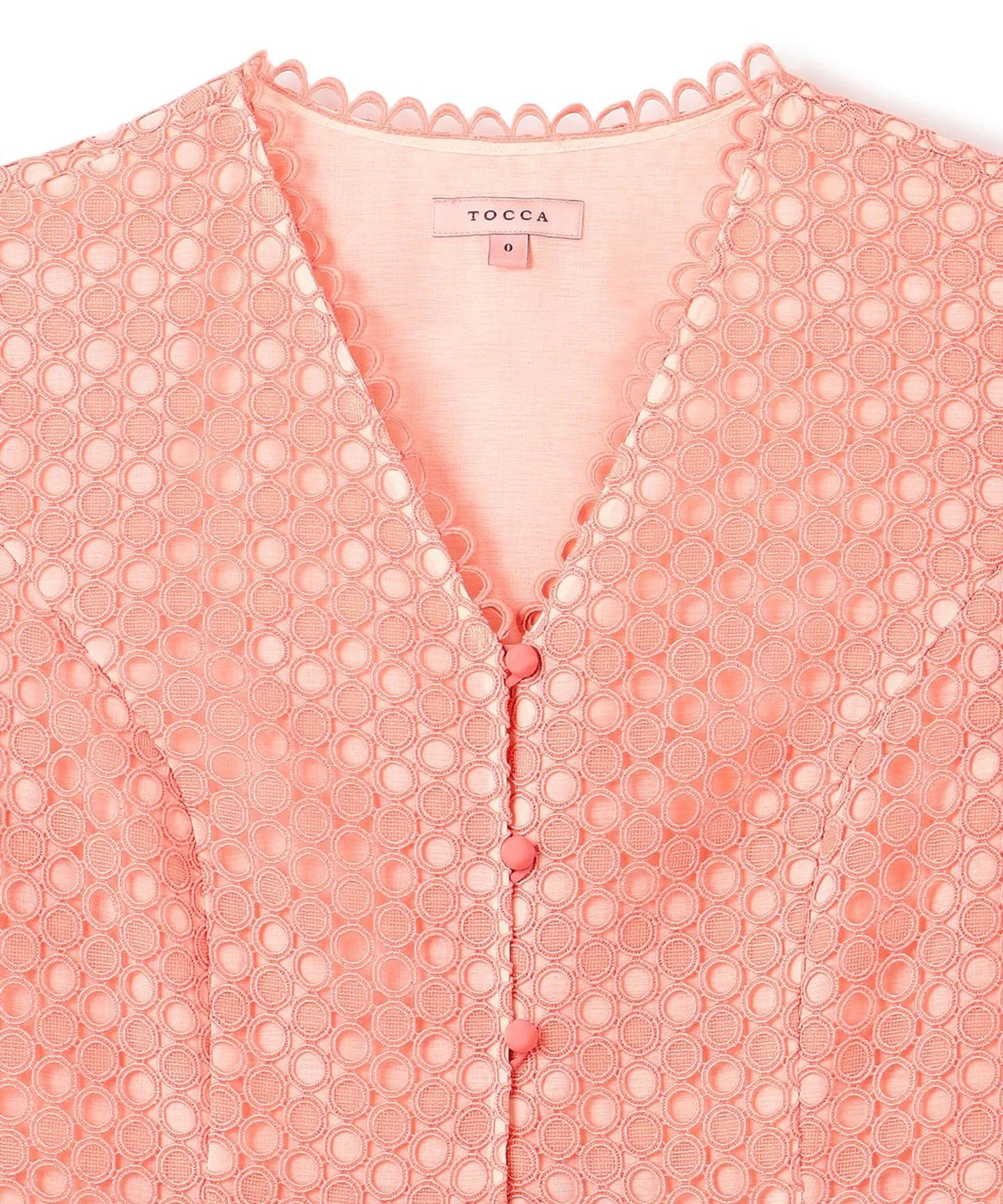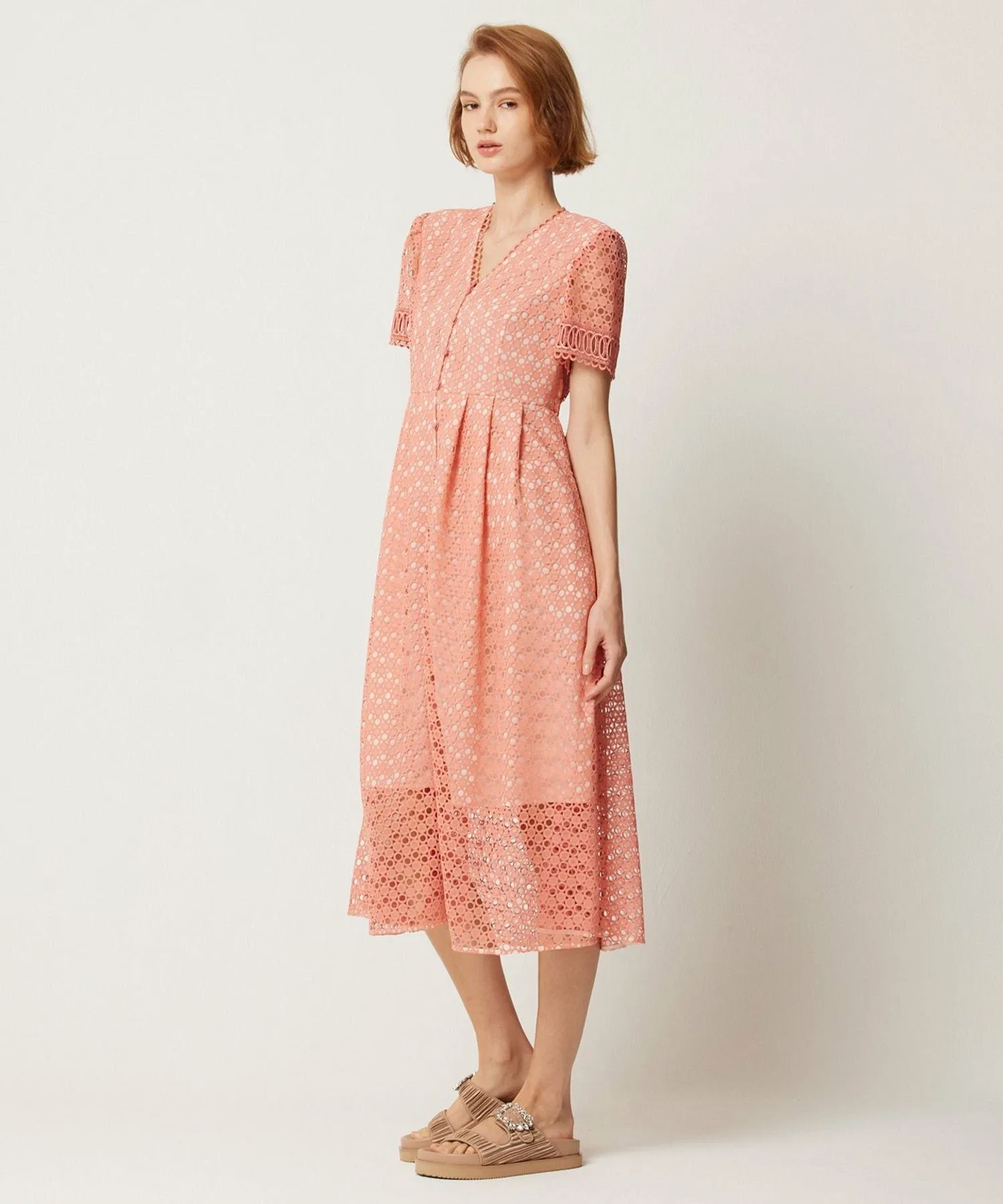 Для создания изысканного образа использованы три вида кружева. Кружевная отделка выполнена в виде четкого V-образного выреза для аккуратного декольте.