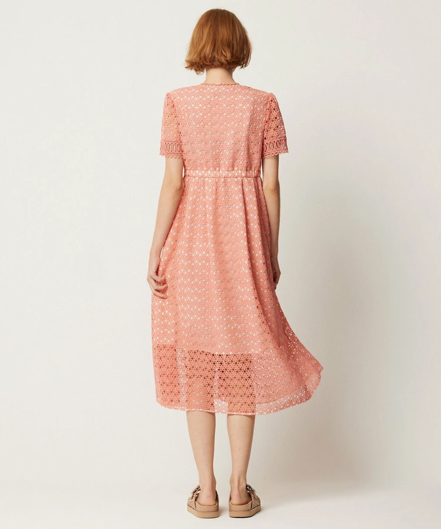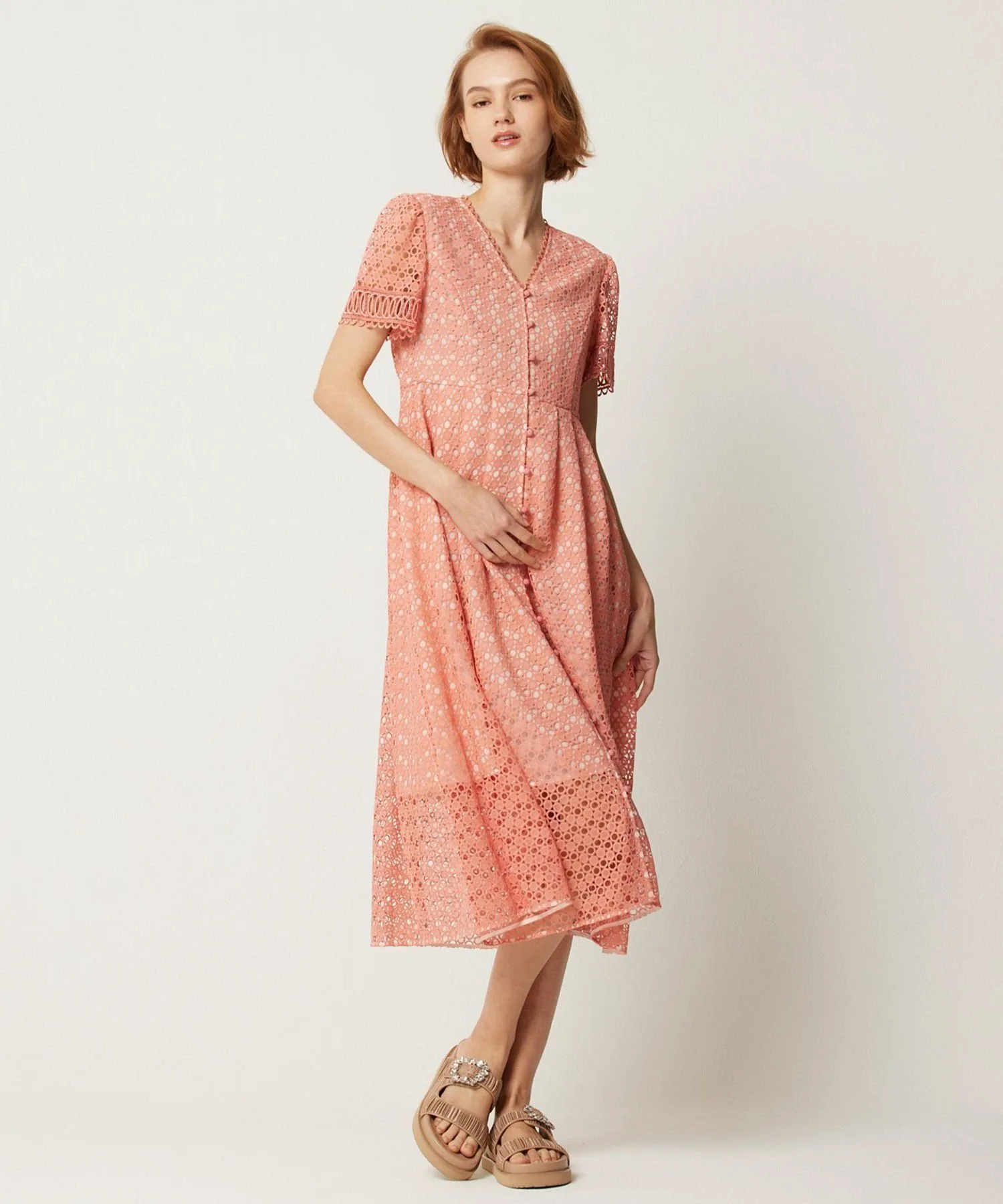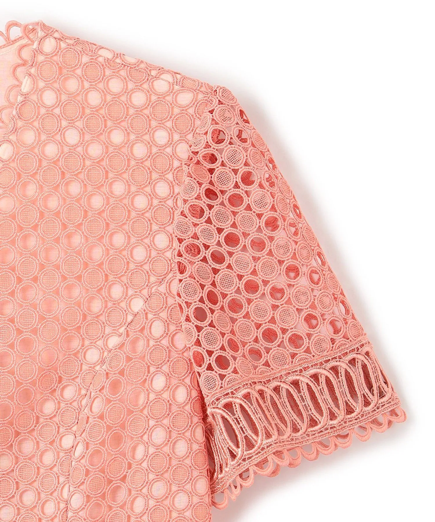 Для создания изысканного образа использованы три вида кружева. Кружевная отделка выполнена в виде четкого V-образного выреза для аккуратного декольте.