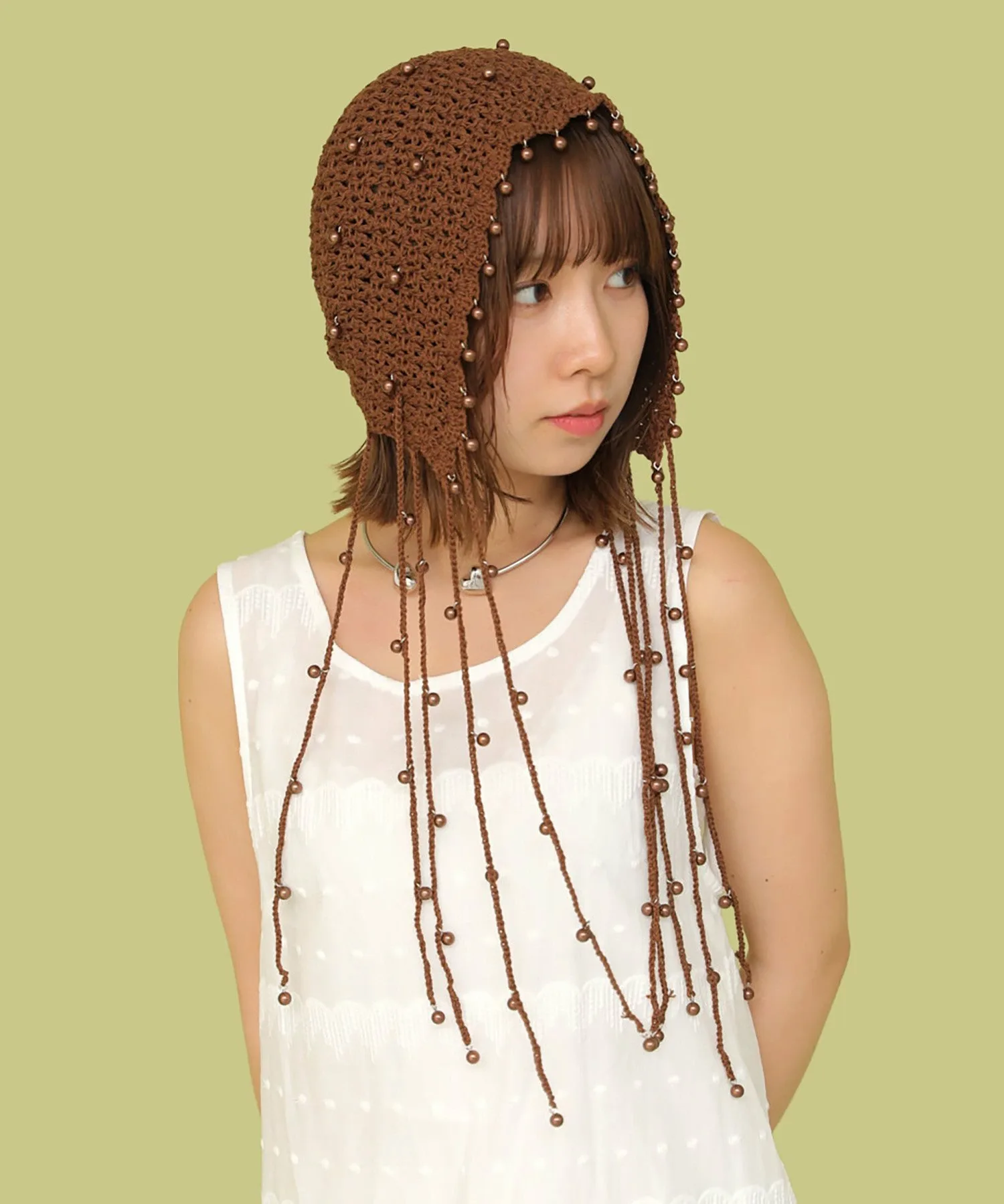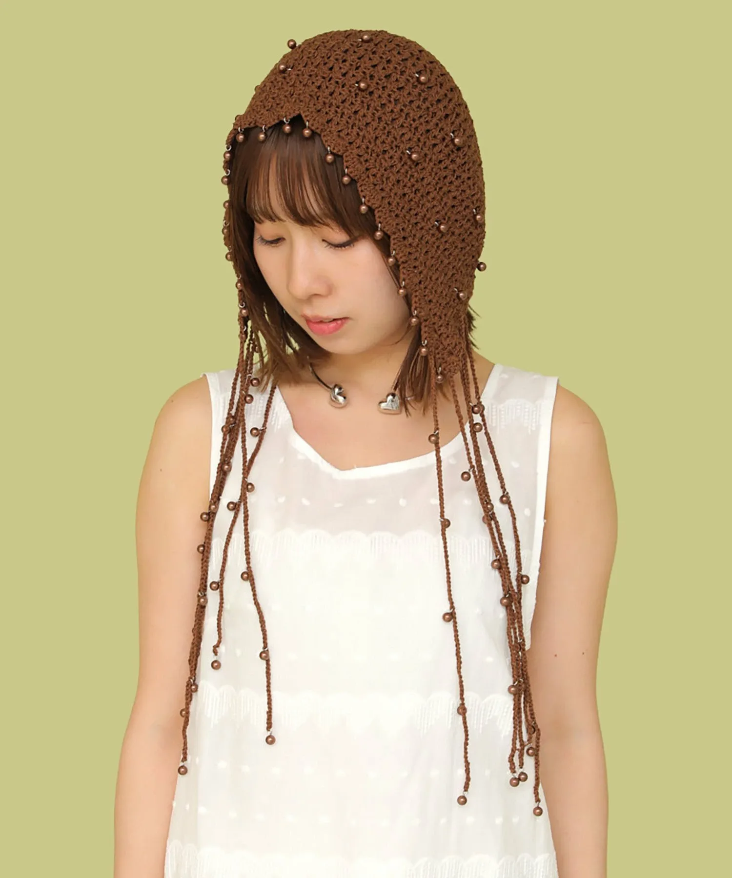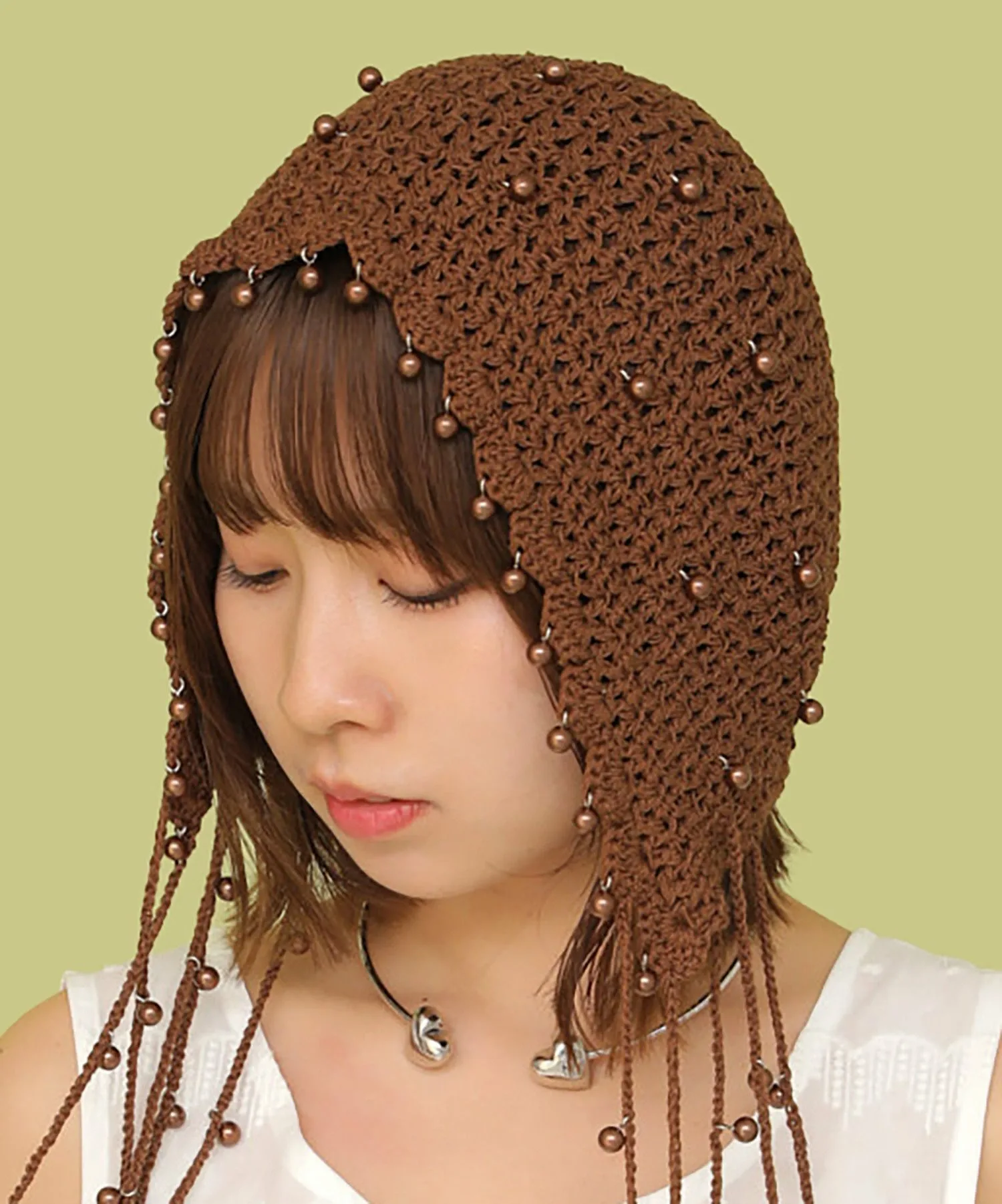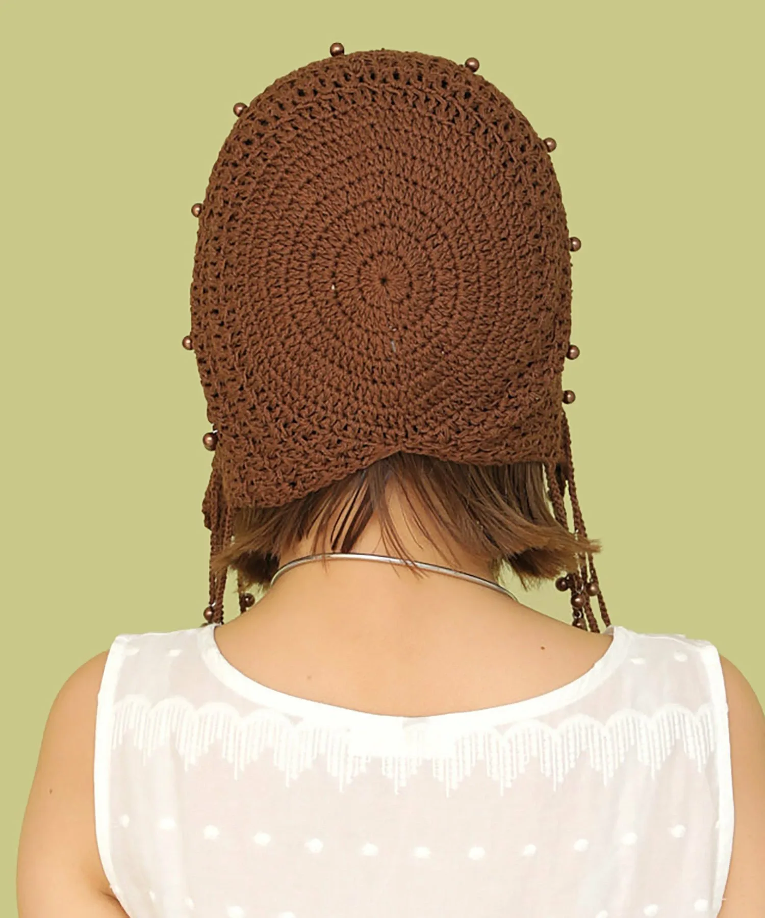 Головной убор, украшенный большим количеством жемчужных бусин.