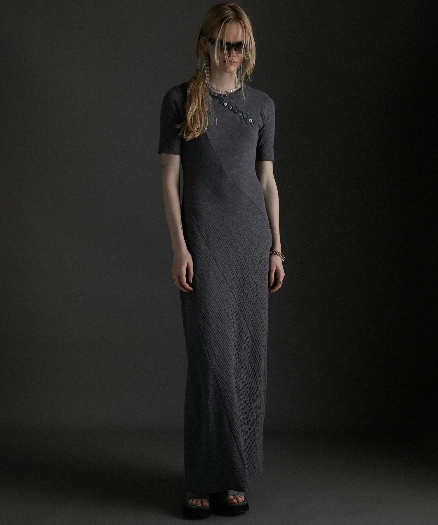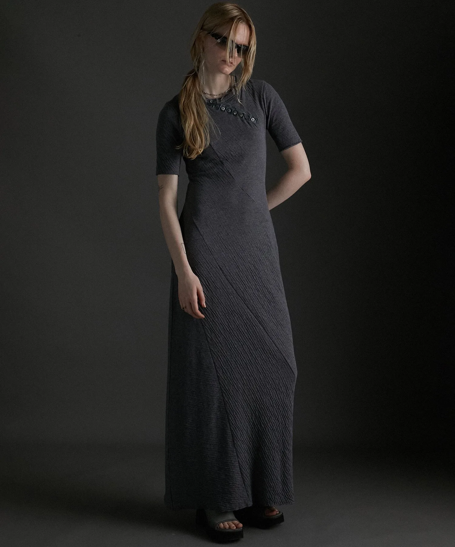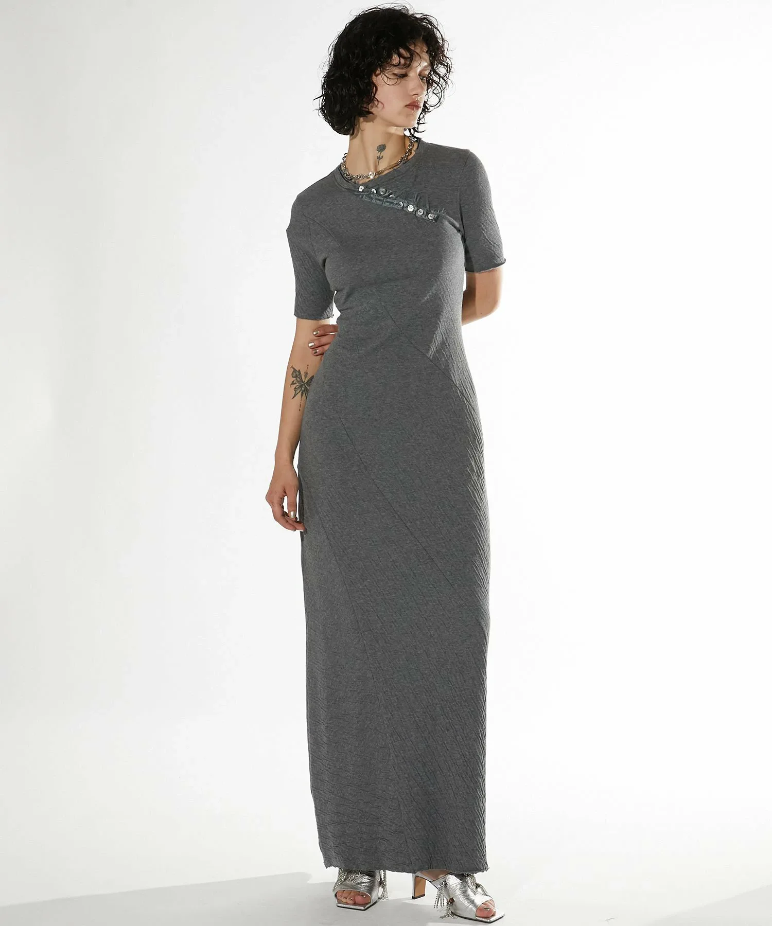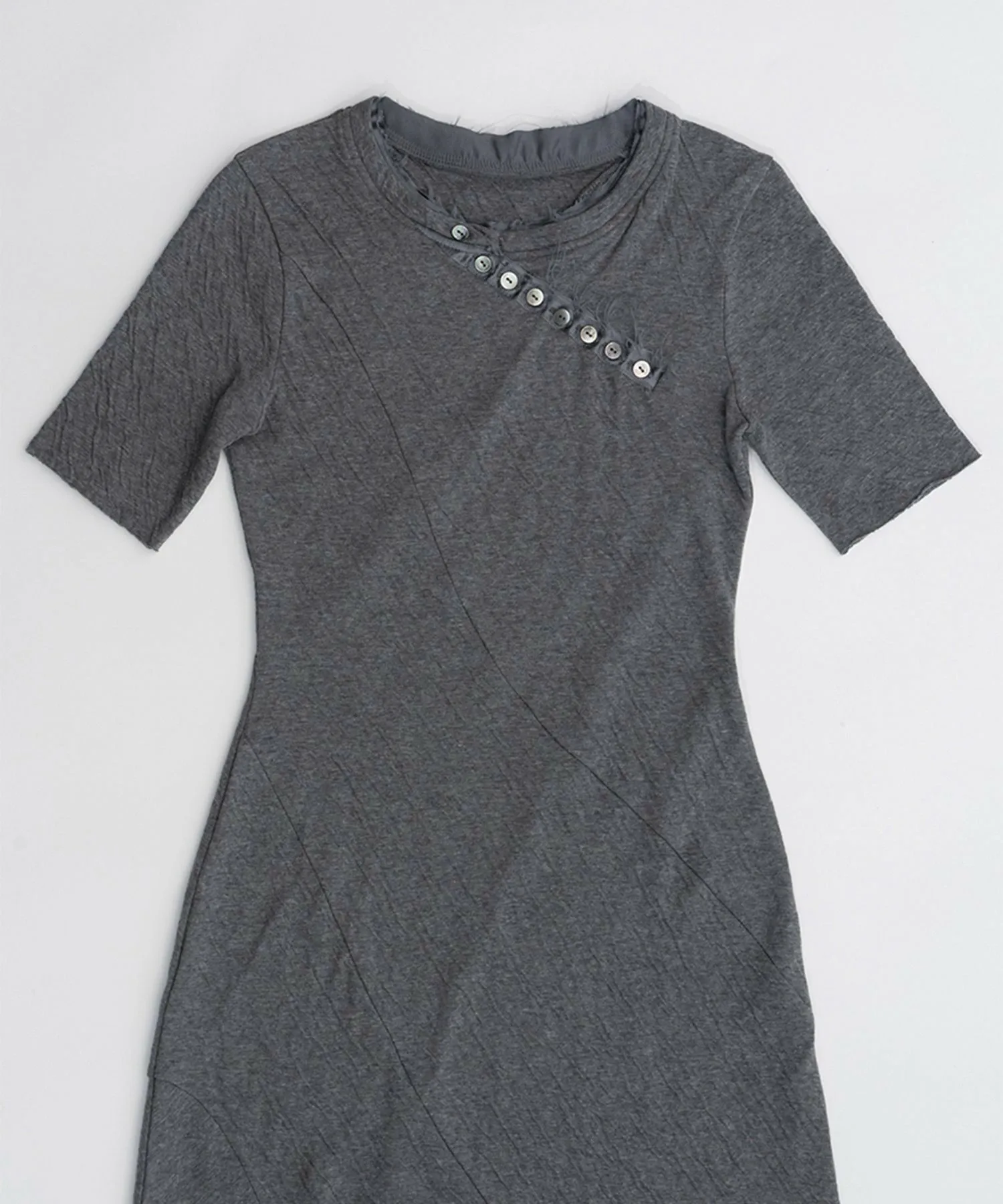 Диагональный вырез «хенли» в этом году в тренде, а облегающий силуэт добавляет изюминку платью, которое обычно носит повседневный характер.