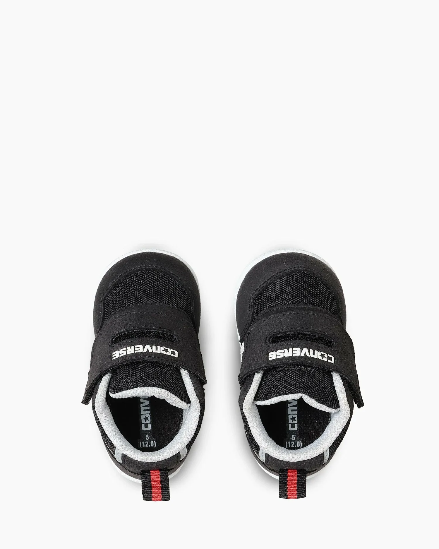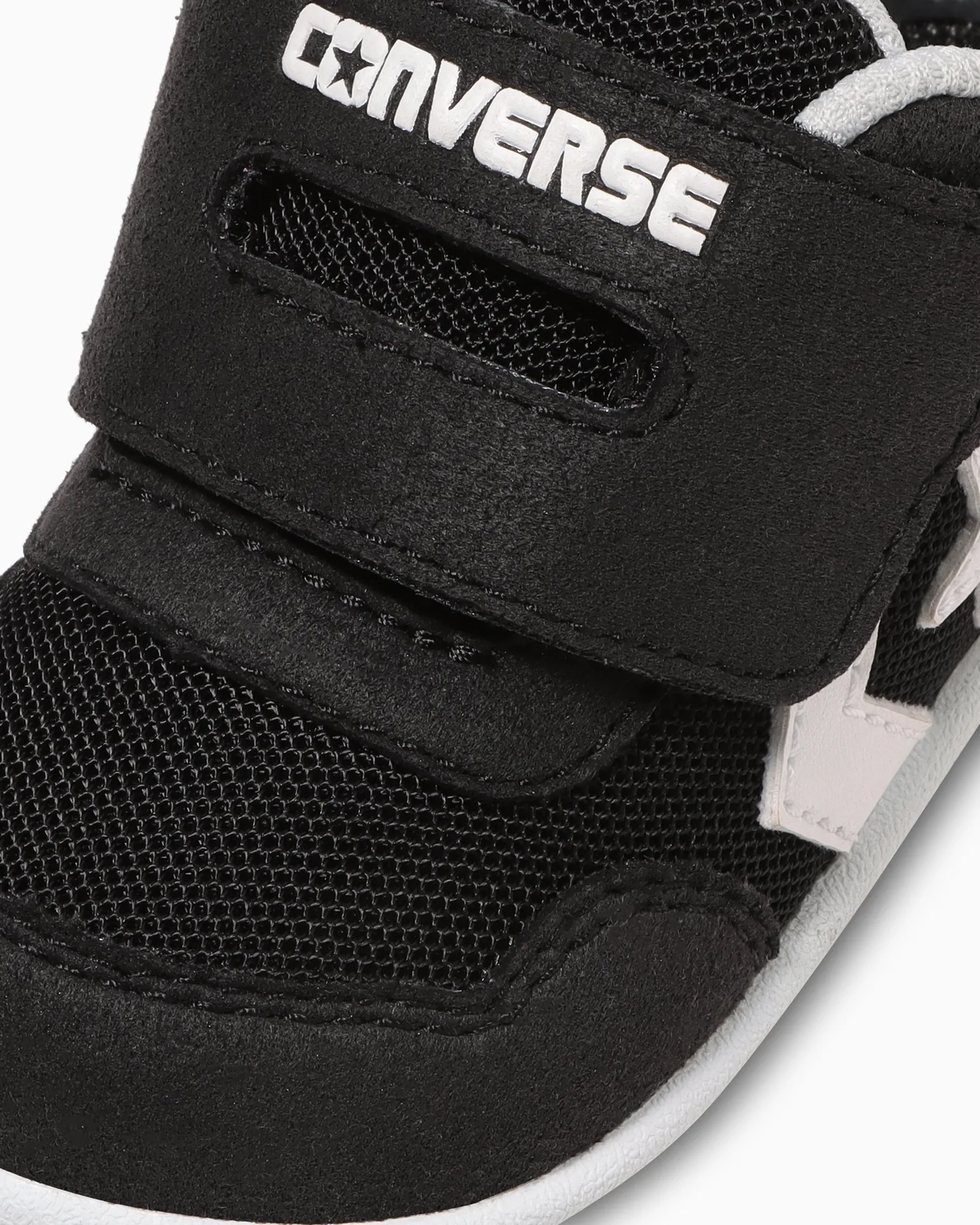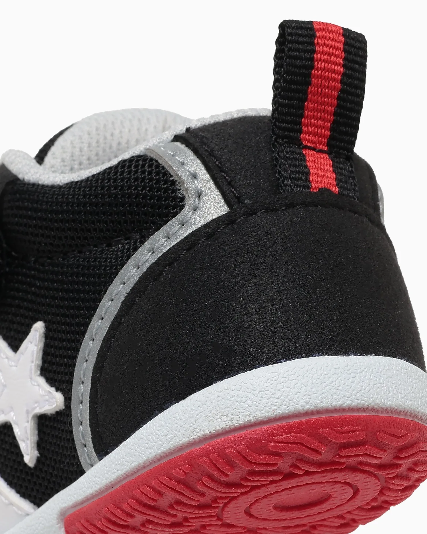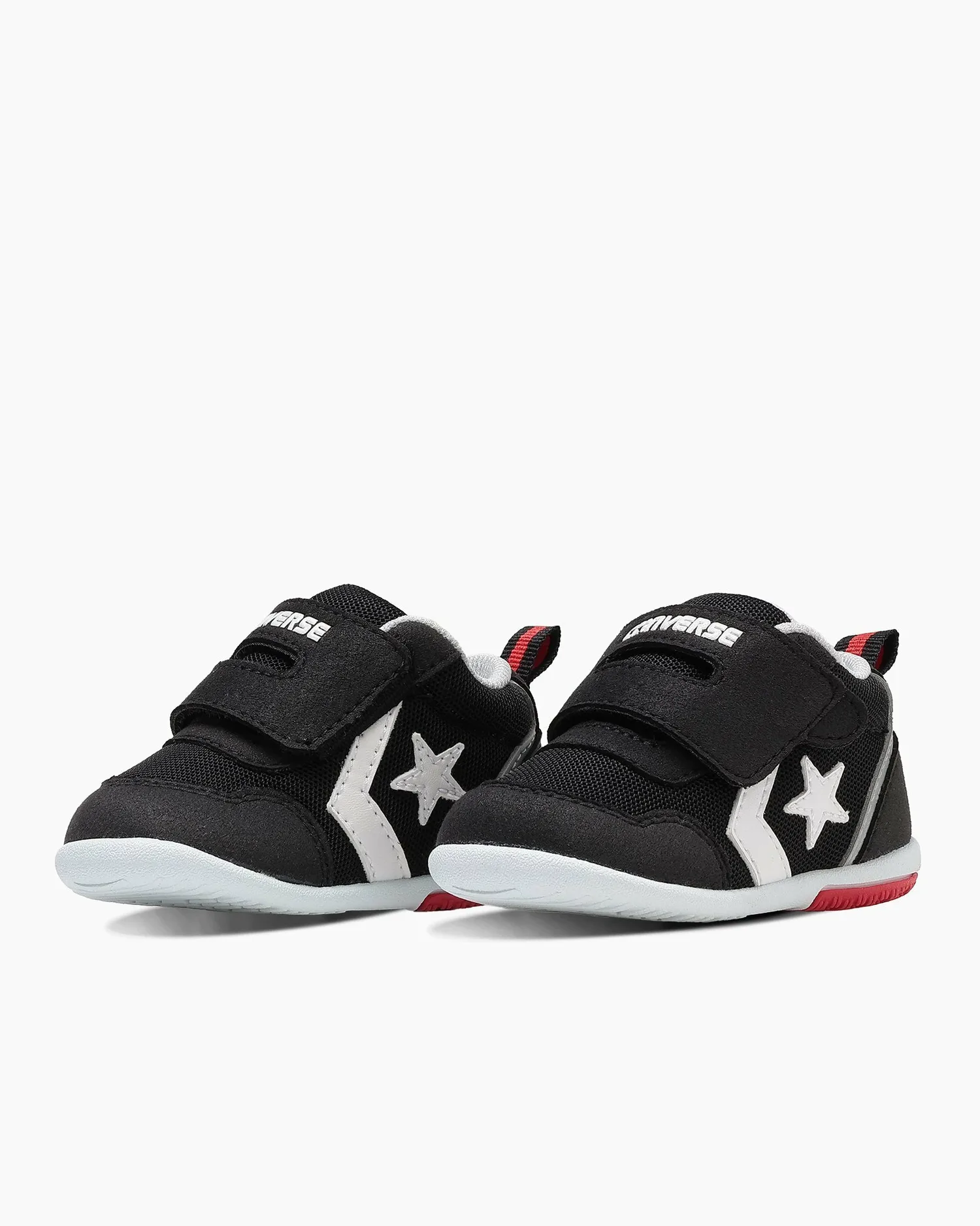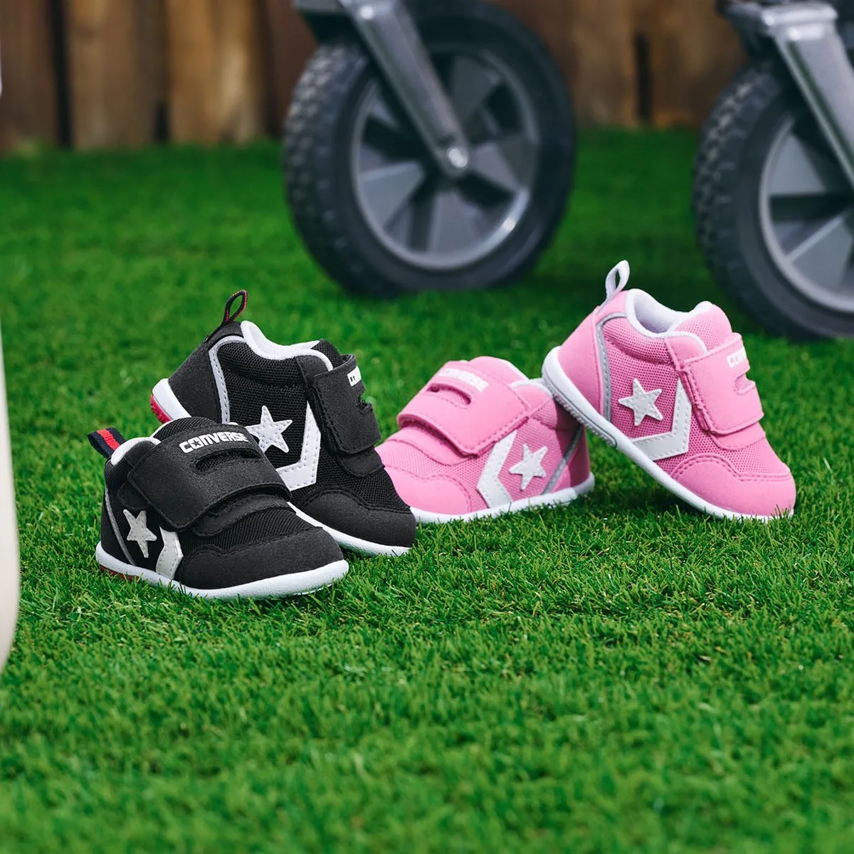 Доступны в двух цветах: черно-красный и розово-светло-серый, сочетающие в себе ретро-цвета беговых кроссовок, которые хорошо смотрятся с детской одеждой.
