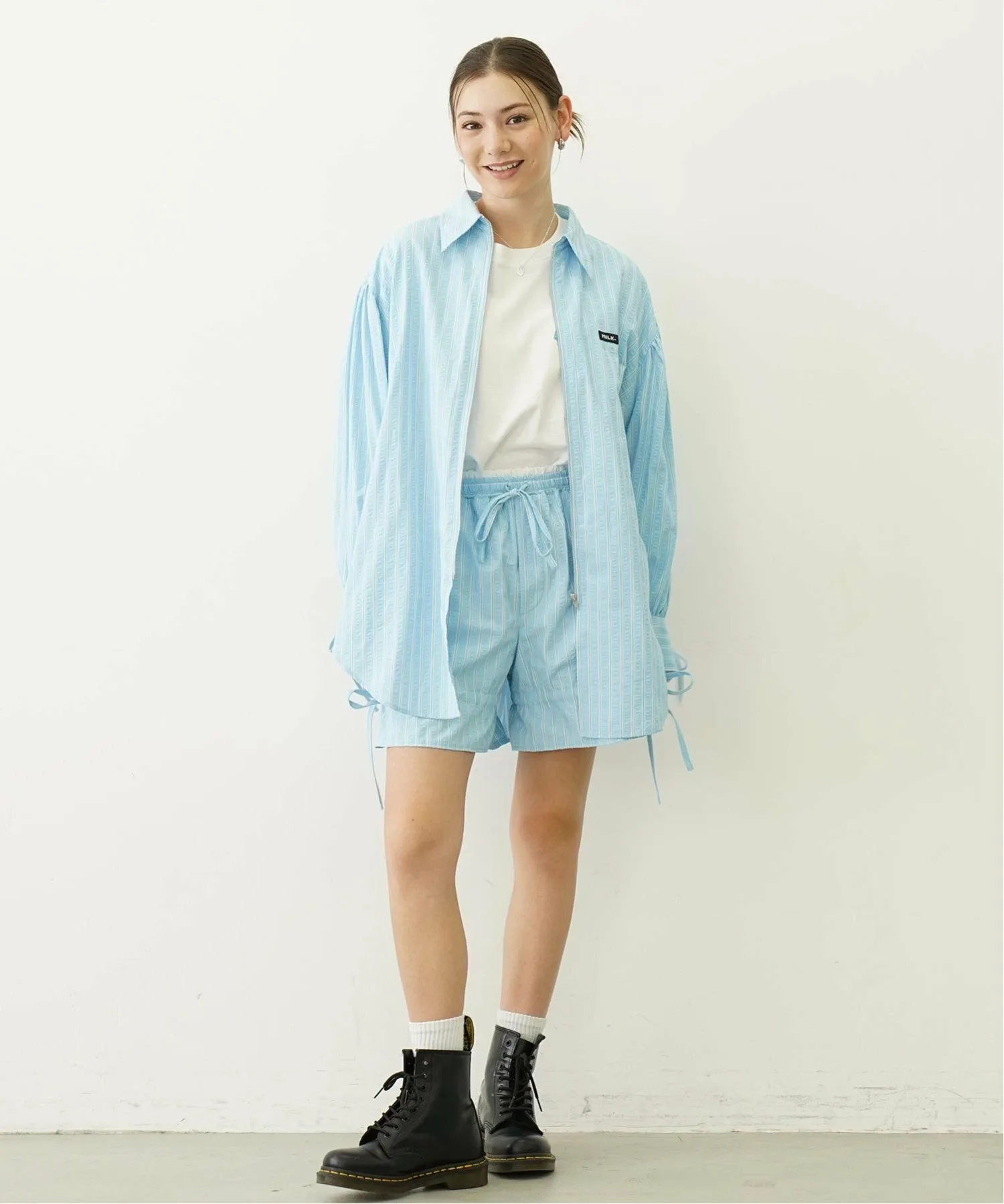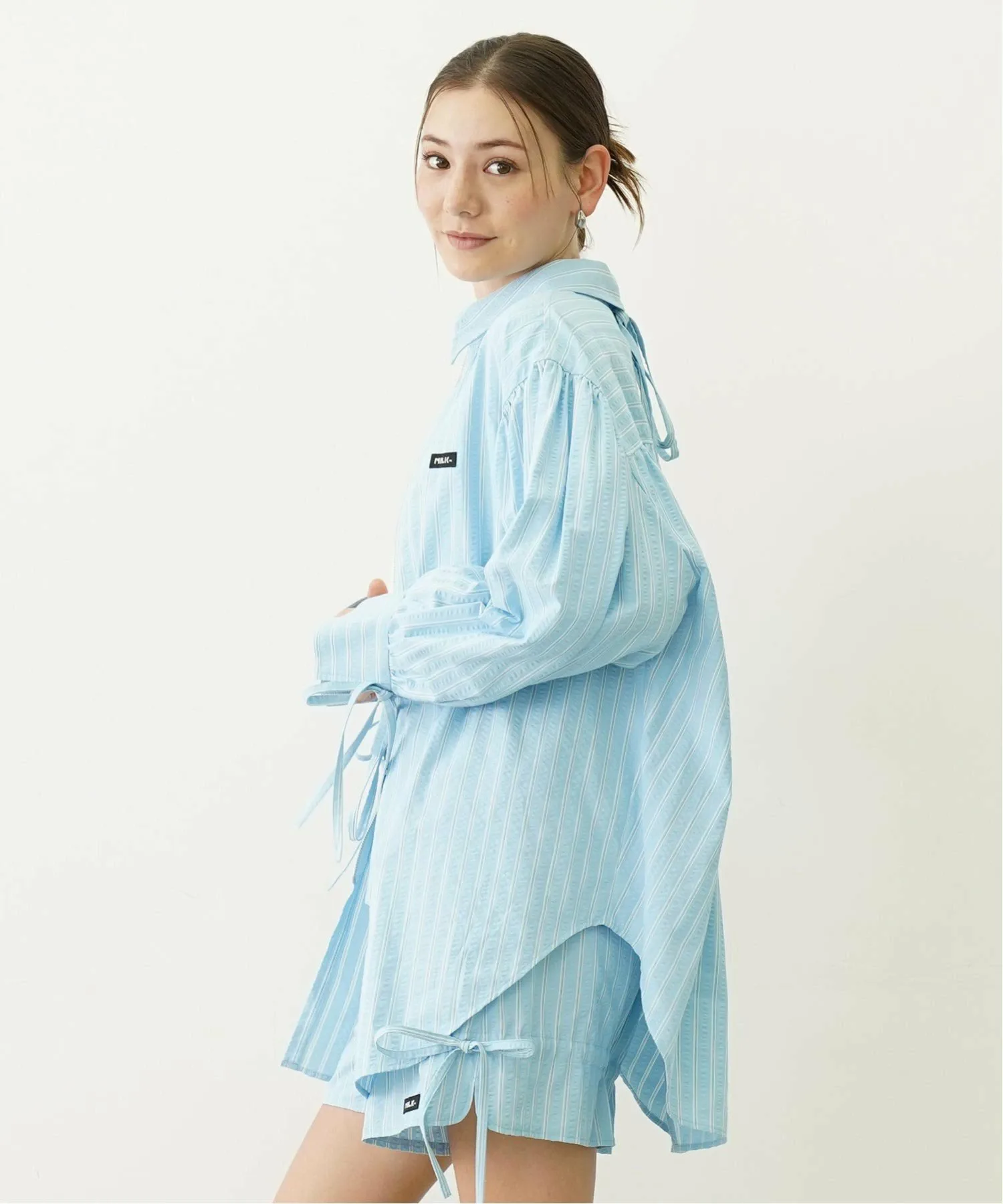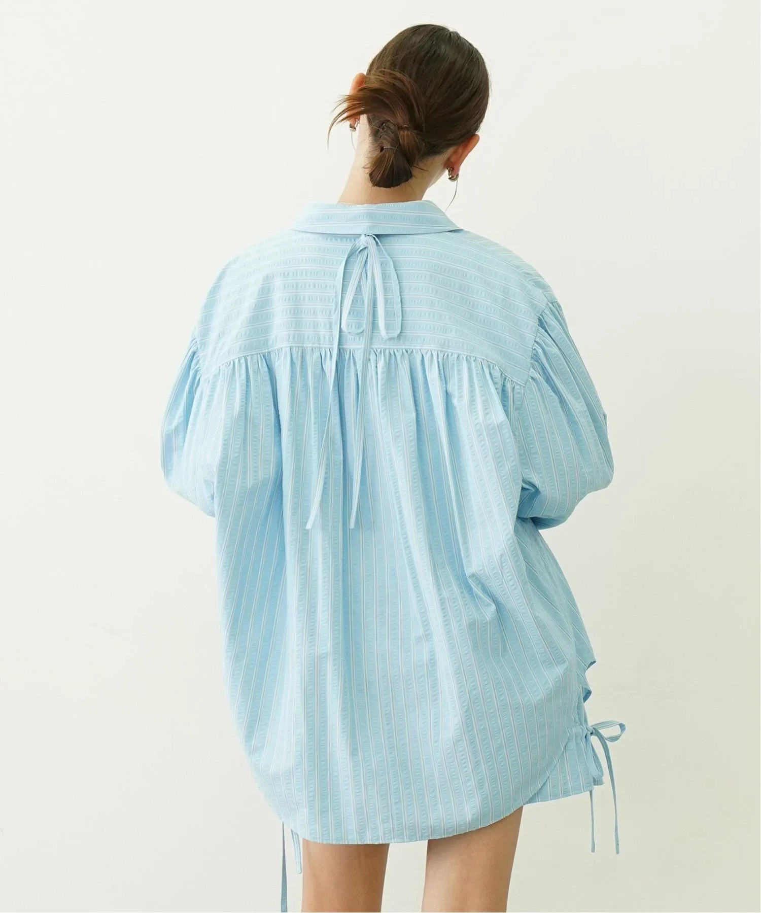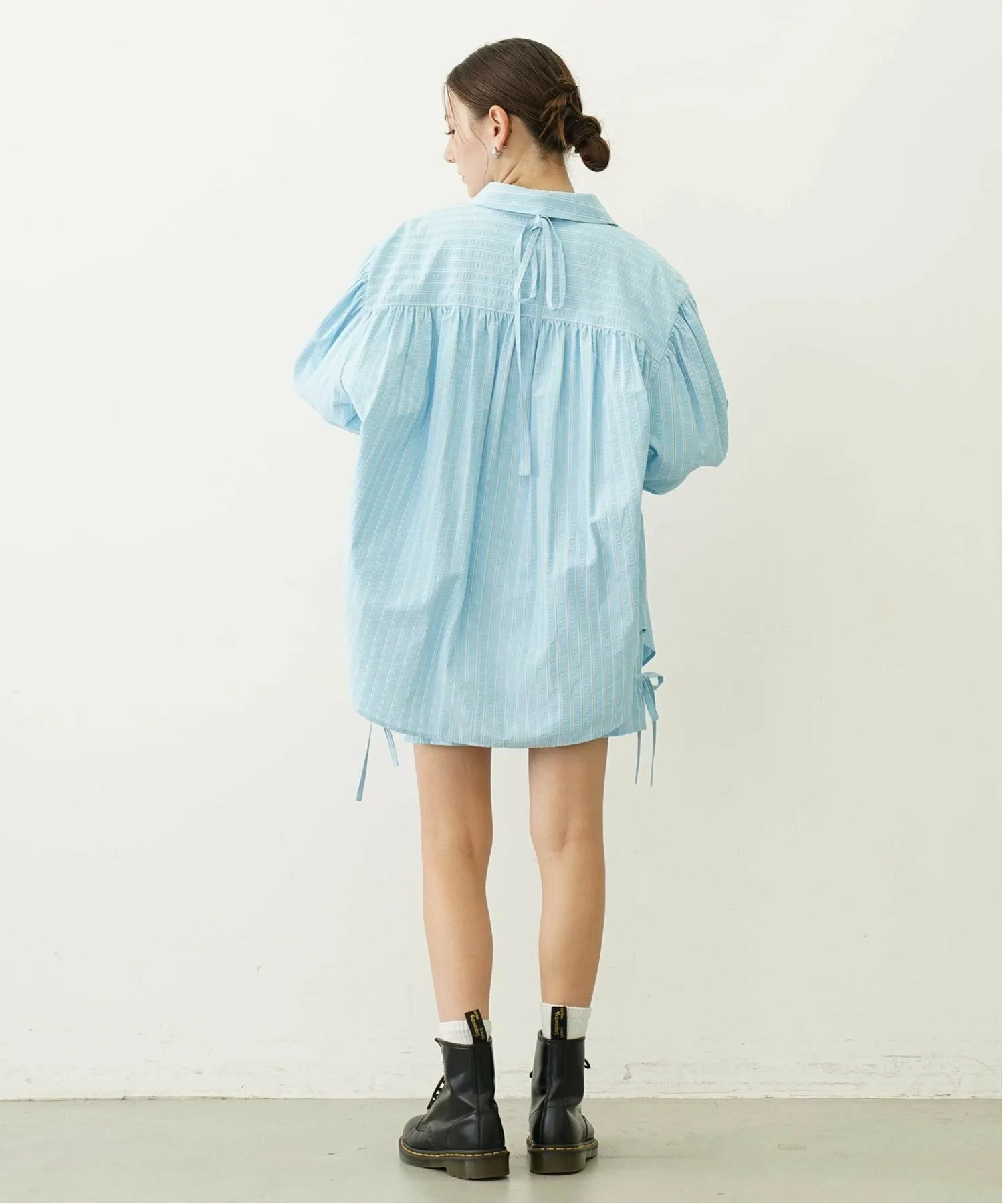 Ленточка на воротнике съемная, а свободный крой и приспущенные плечи создают расслабленный и стильный образ.