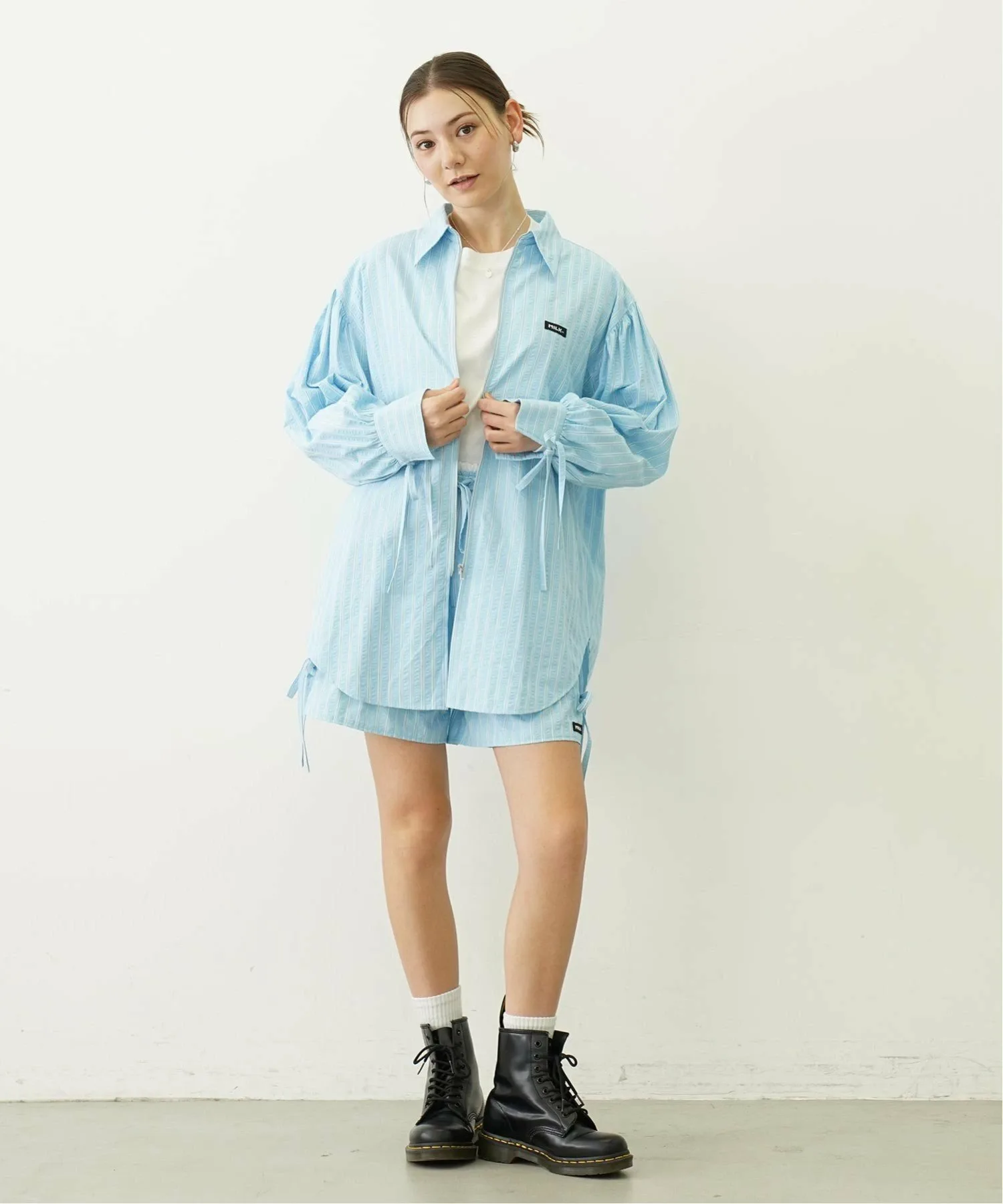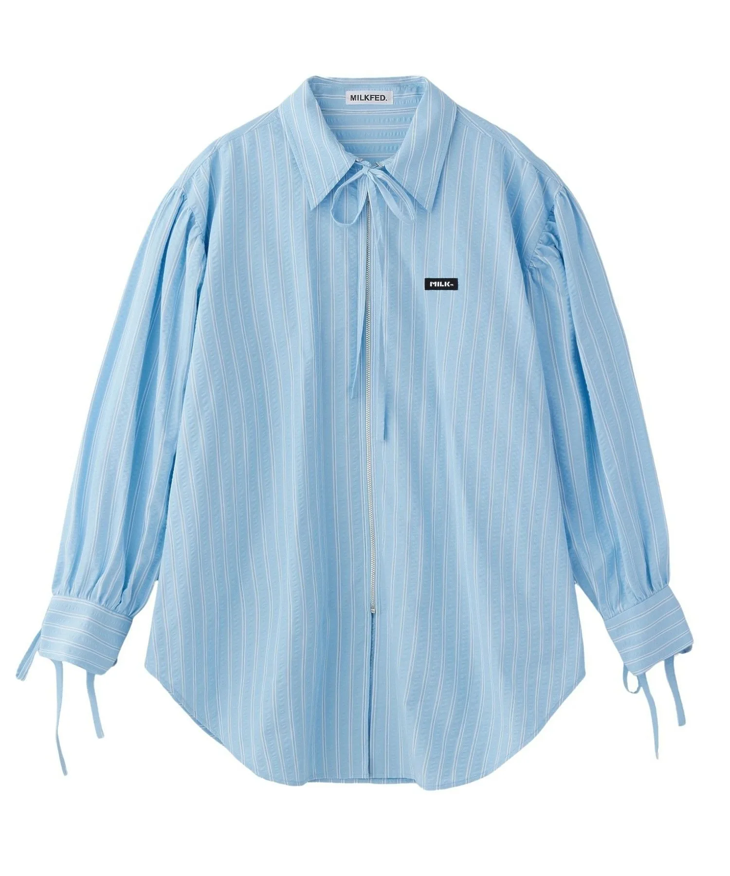 Рубашка на молнии с модными ленточками на манжетах и воротнике.