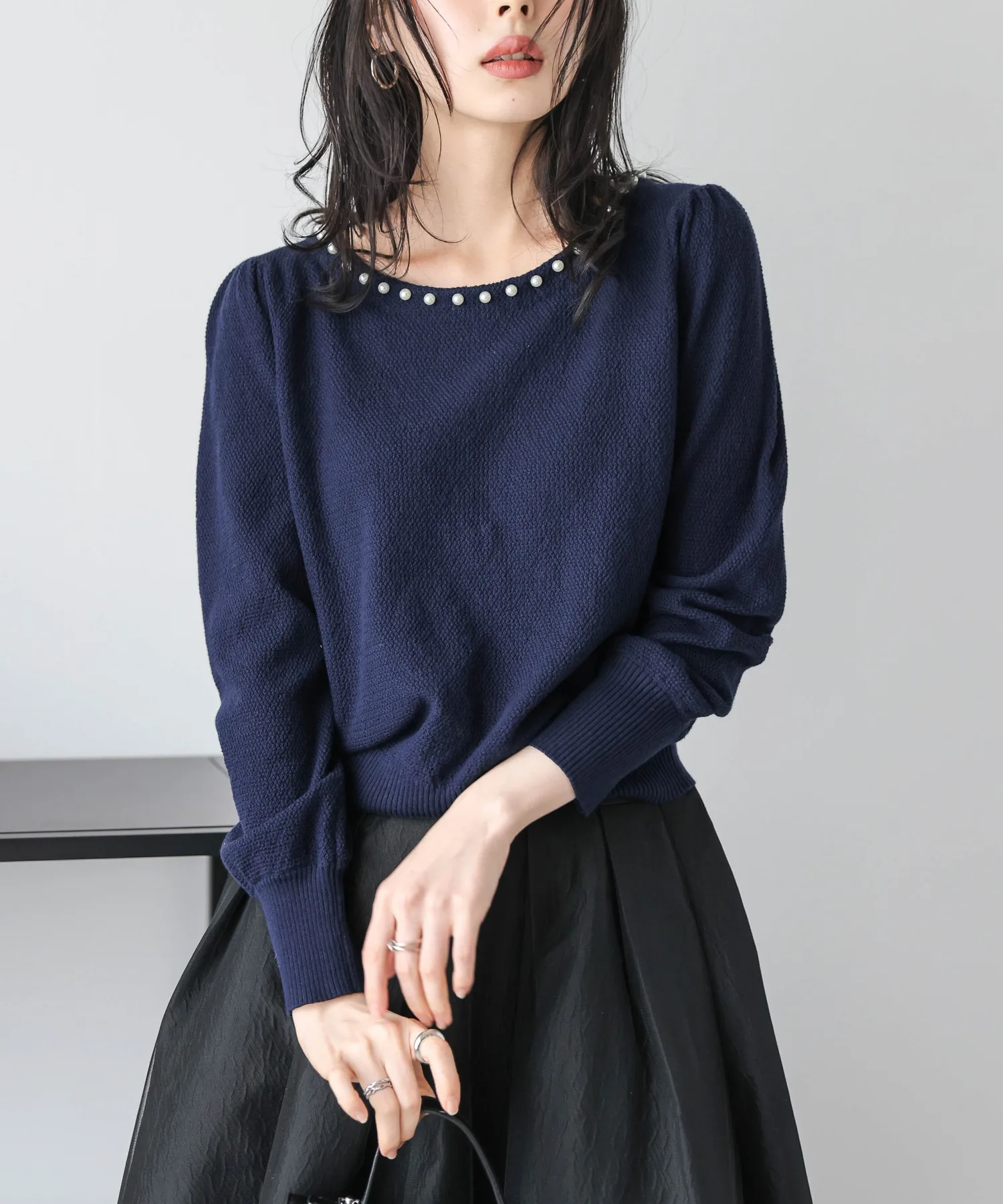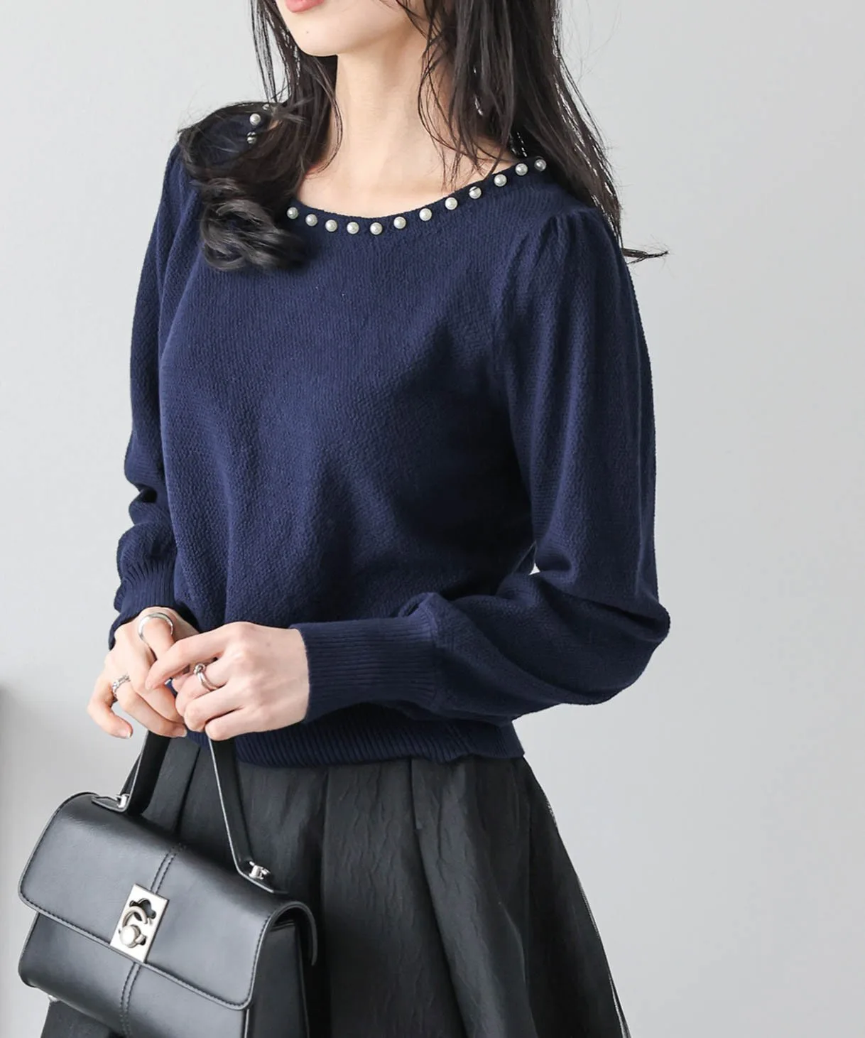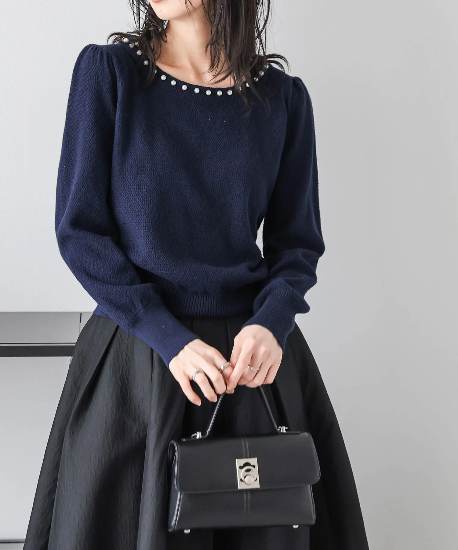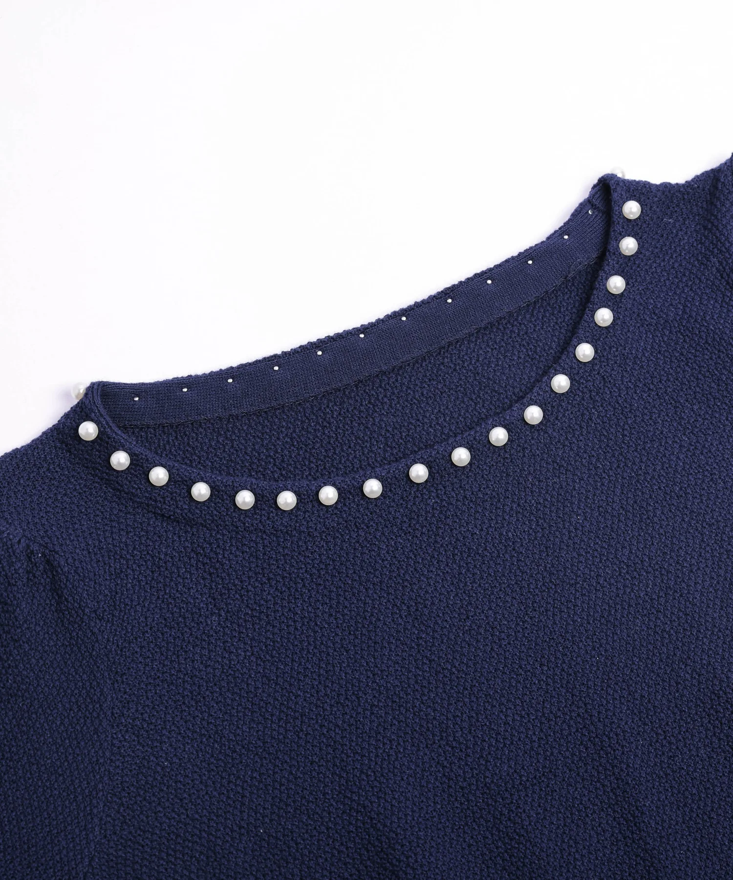 Жемчуг на вырезе добавляет гламура лицу и линии декольте. Аксессуары не требуются, и эта вещь позволяет легко создавать стильные образы даже в одиночку.