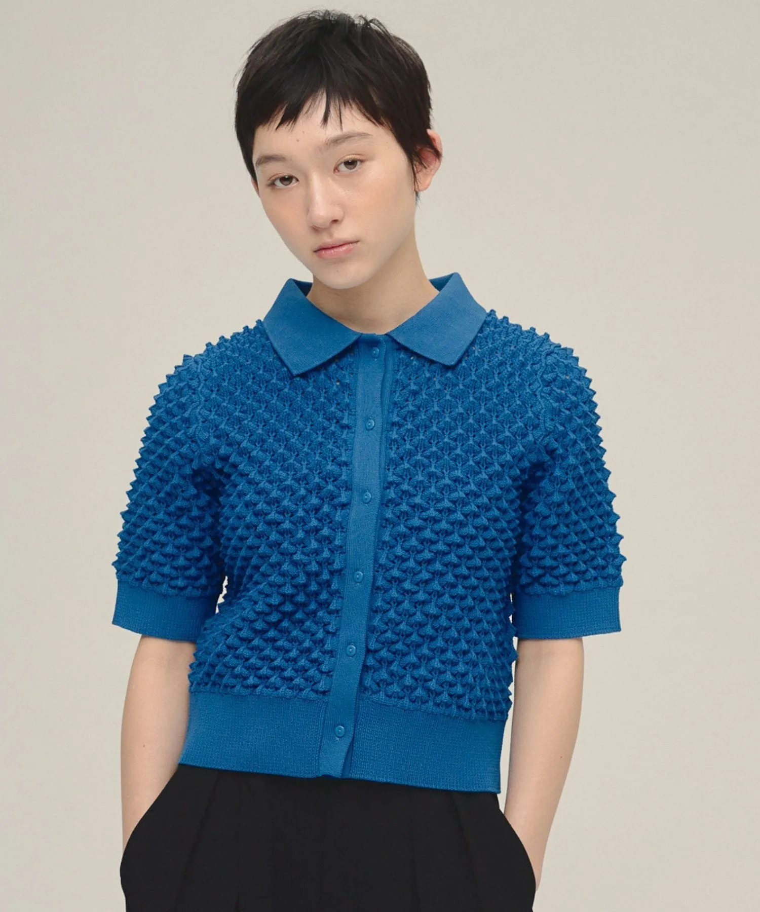 Кардиган-поло с привлекательным, свежим, объемным вязаным узором.