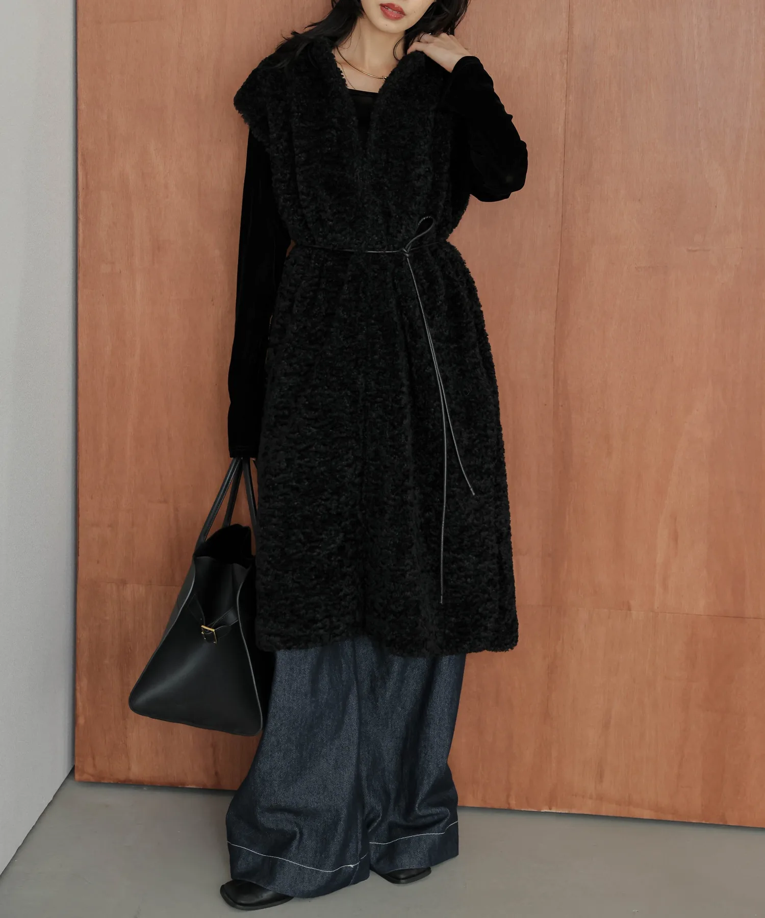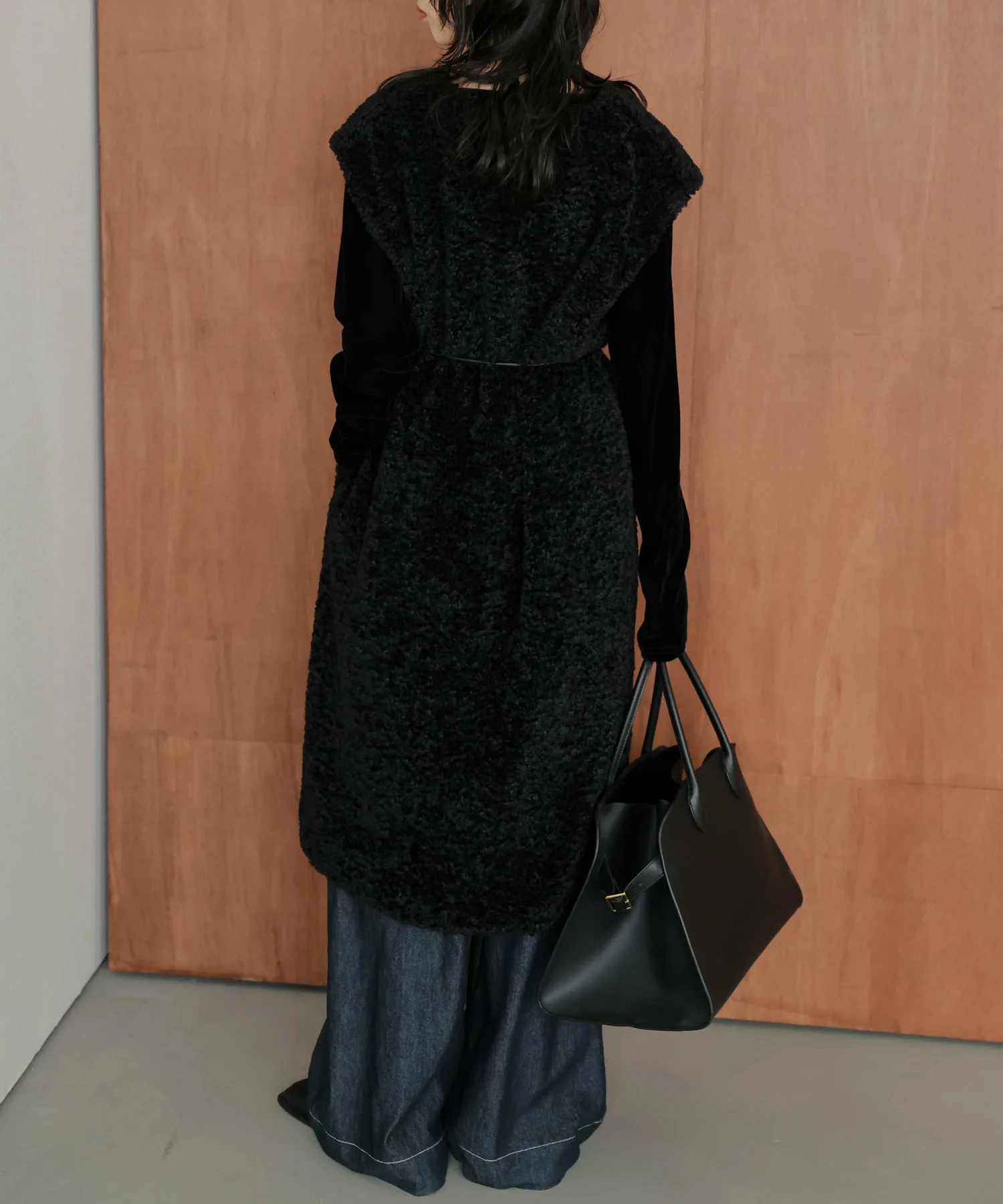 Длинный жилет из милого материала с эффектом боа, выполненный в современном стиле.