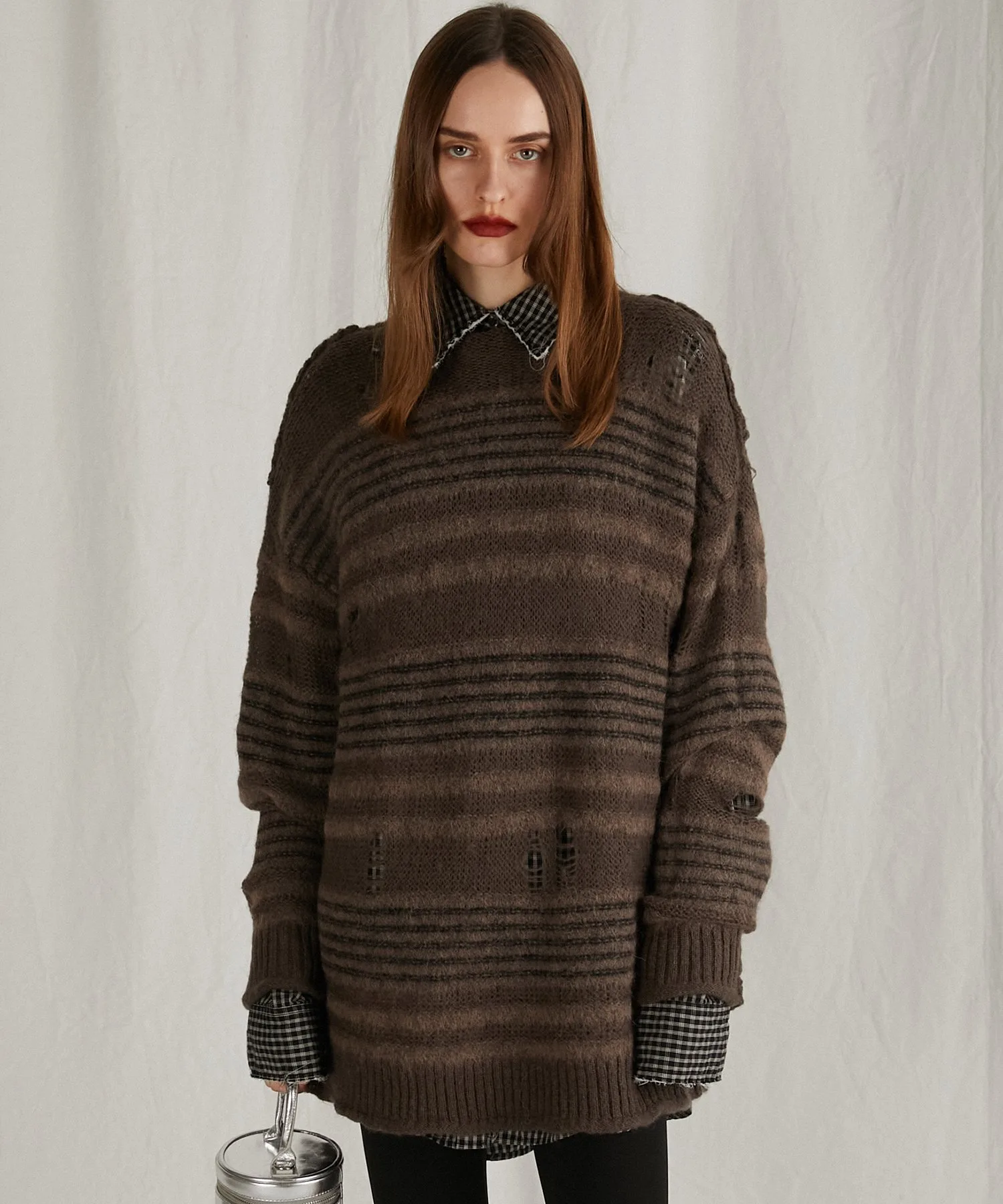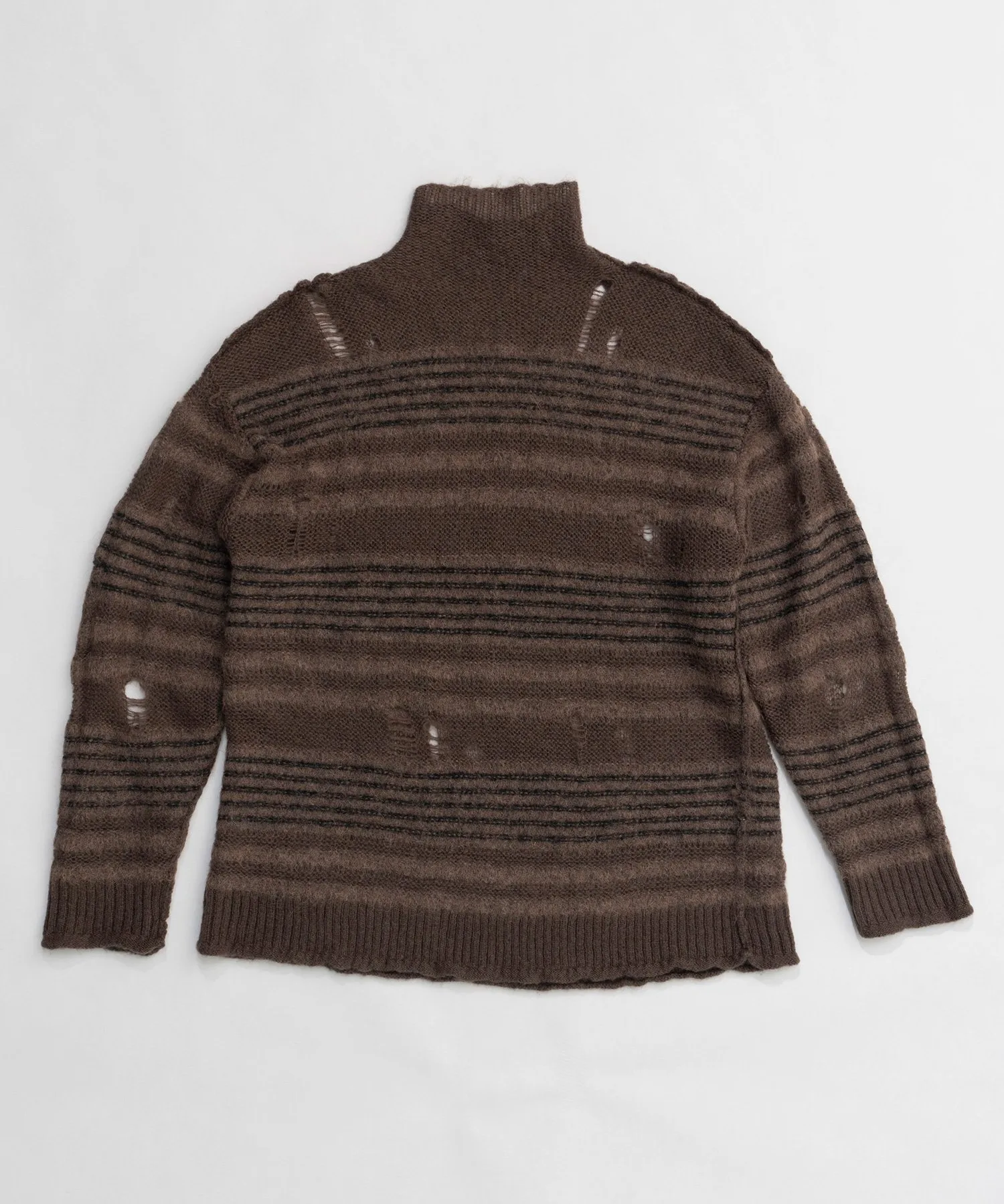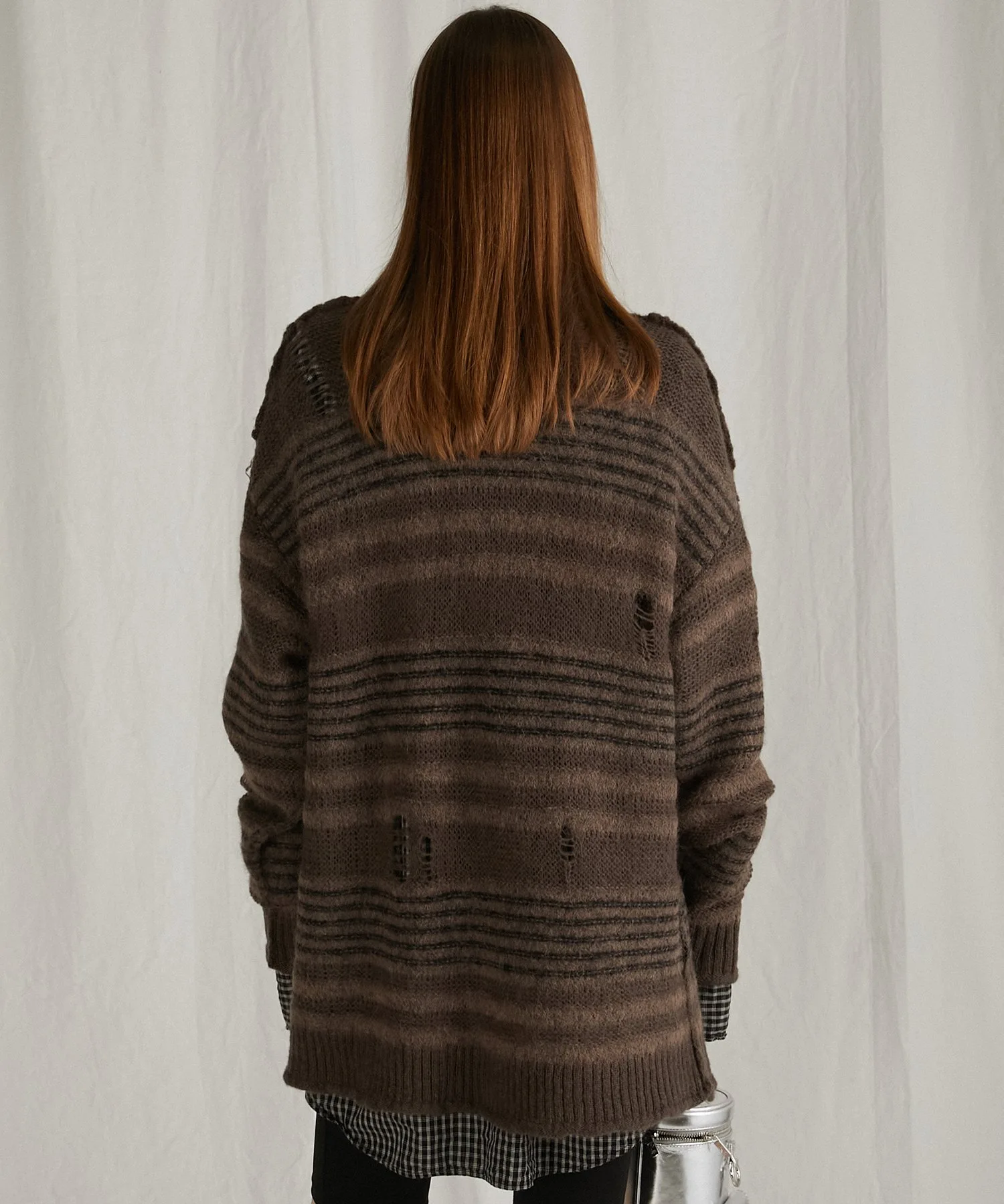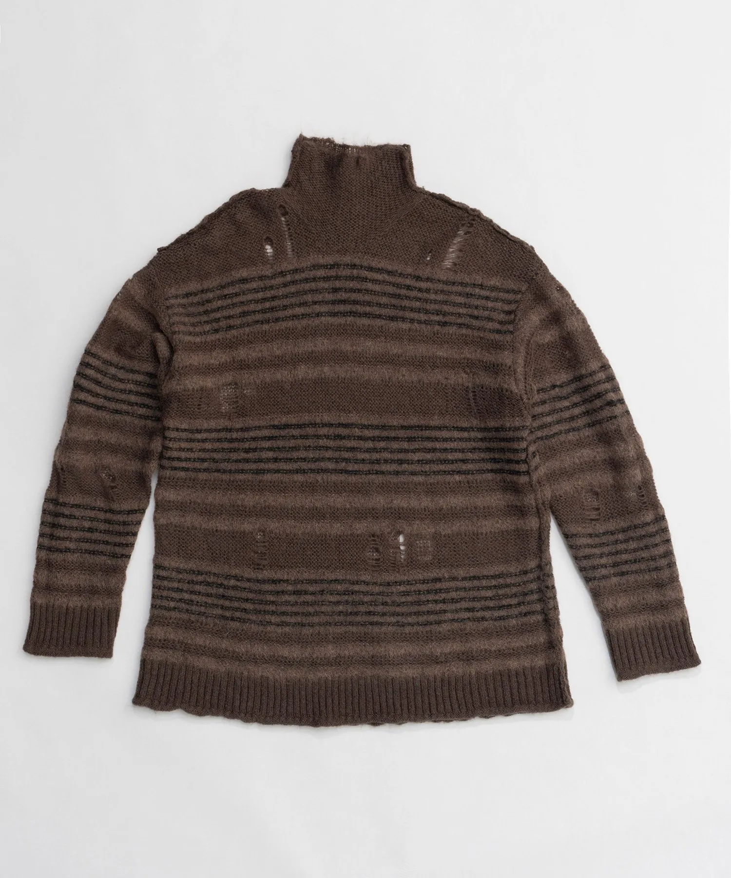 Ткань имеет контрастную поверхность: однотонная часть выполнена из мохерового трикотажа, а полосатая — из альпаки.