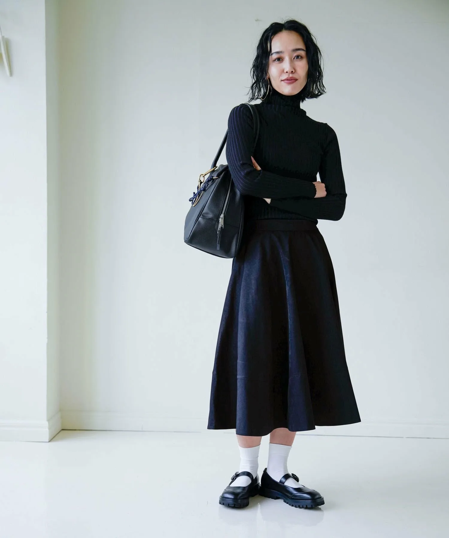 Хорошо сбалансированный образ в сочетании с облегающим трикотажным изделием, таким как [eL] 12G Just Right TurtleNeck, подчеркнет вашу женственность.