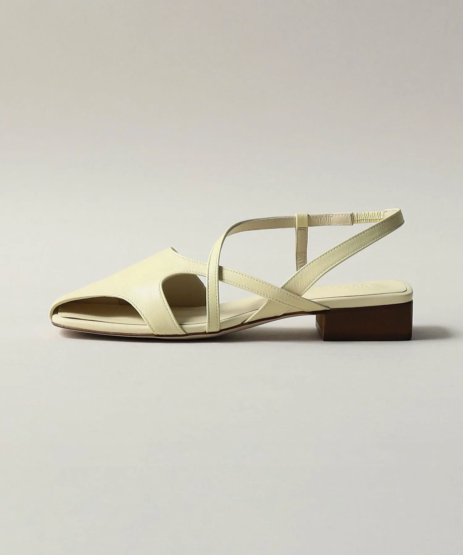Тонкий задний ремешок пересекает подъем стопы, а блочный каблук высотой 2,5 см создает эффектный образ.