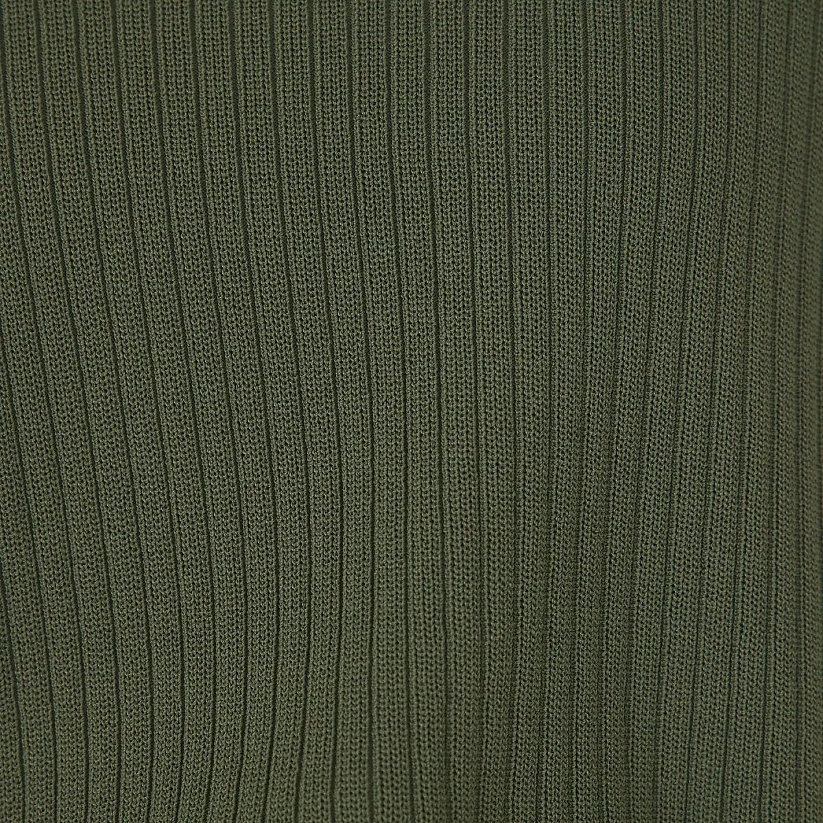 Вертикальная вязка создает четкий силуэт, не подчеркивая нежелательные линии тела.