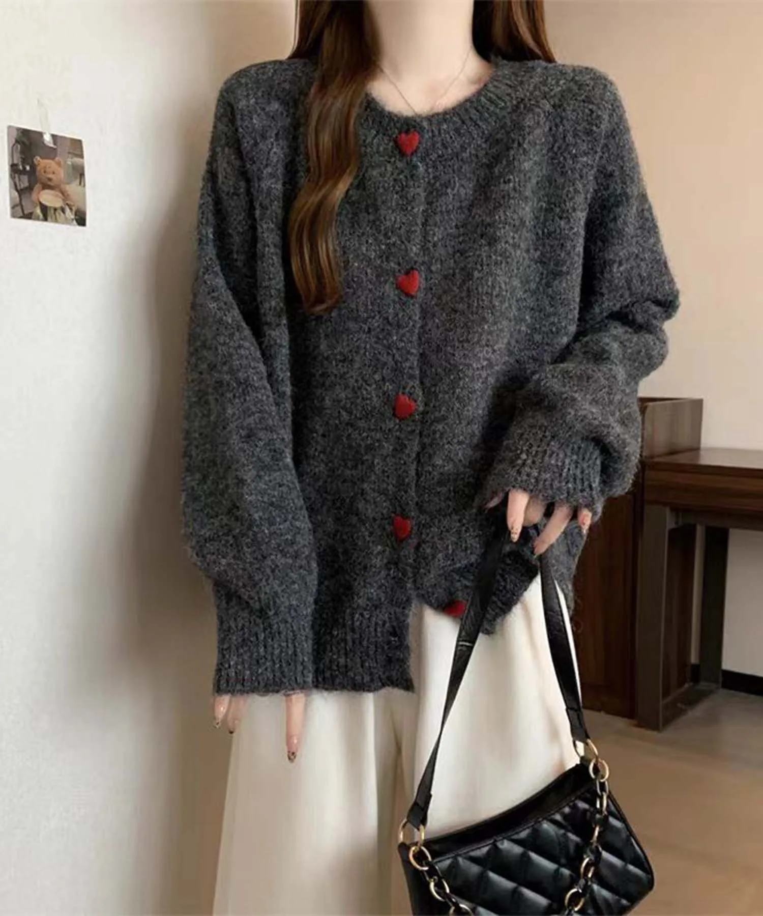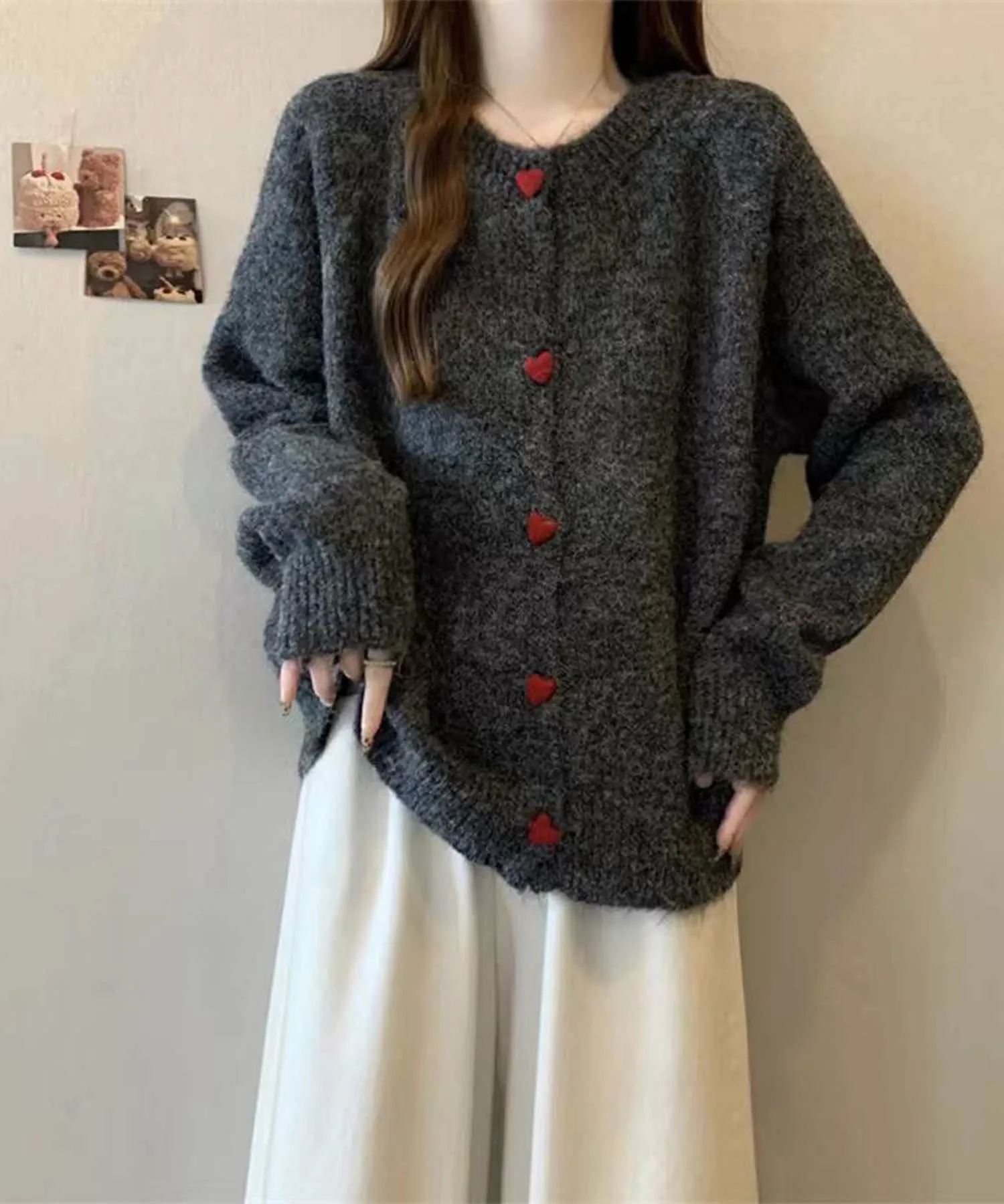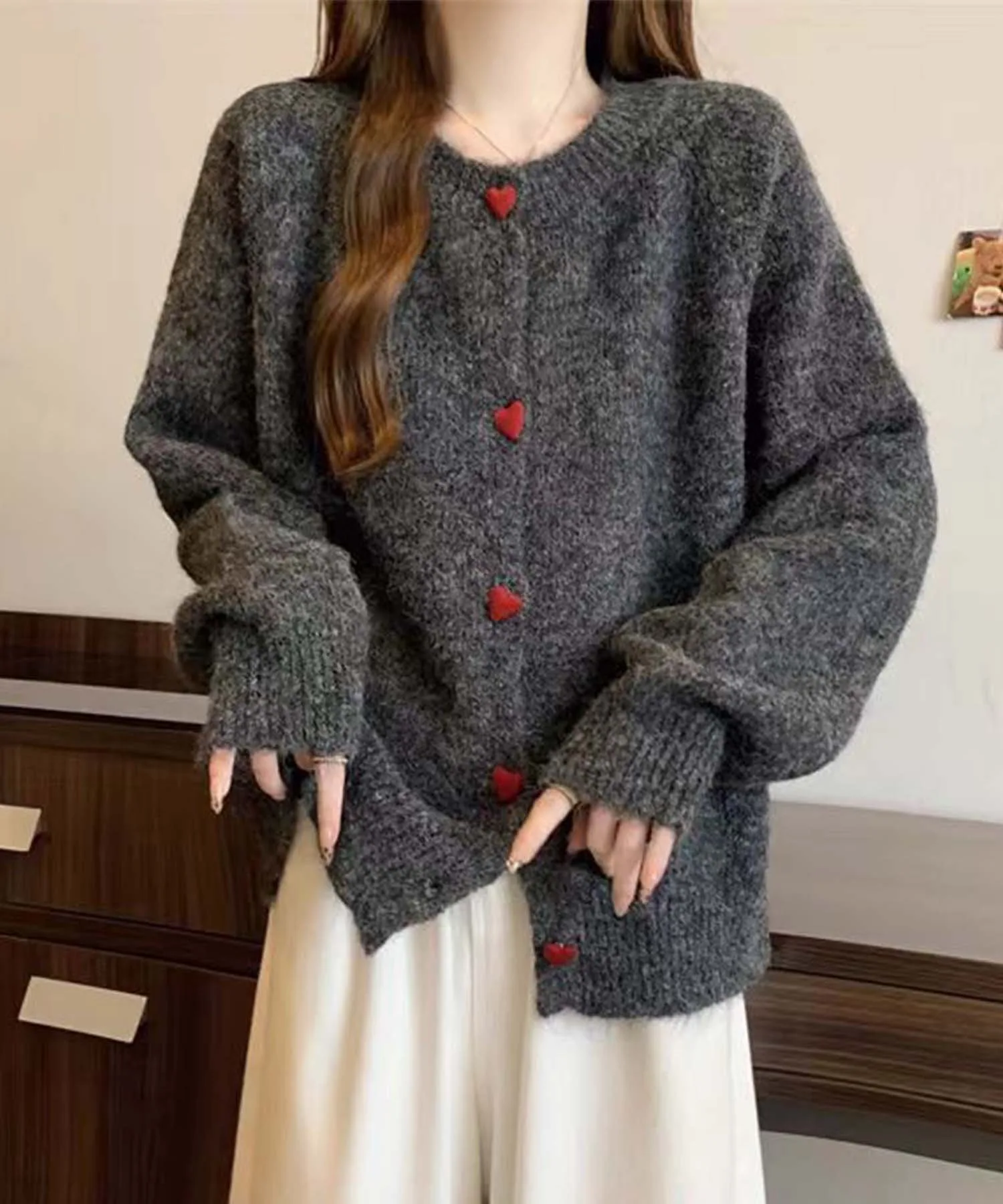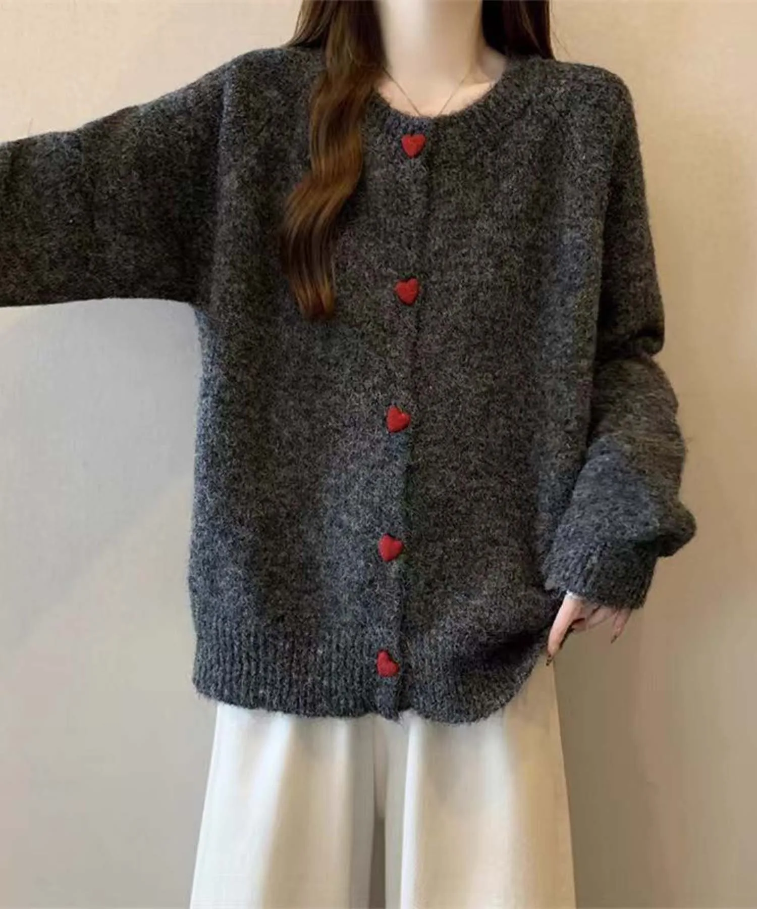 Этот пушистый кардиган изготовлен из мягкого, пушистого материала. Очаровательные красные пуговицы в форме сердечек украшают переднюю часть, добавляя милый акцент к простому дизайну. Естественная цветовая палитра создает нежную, мягкую атмосферу. Он теплый и приятный на ощупь, что делает его идеальной вещью для холодной осени и зимы. Он также мило смотрится в сочетании с повседневными джинсами или юбками, что делает его отличным вариантом для повседневной носки.
