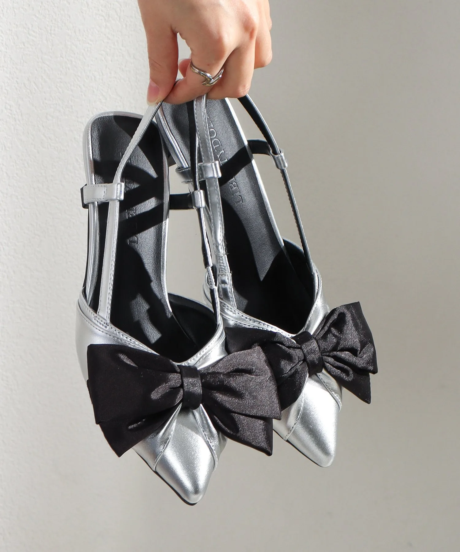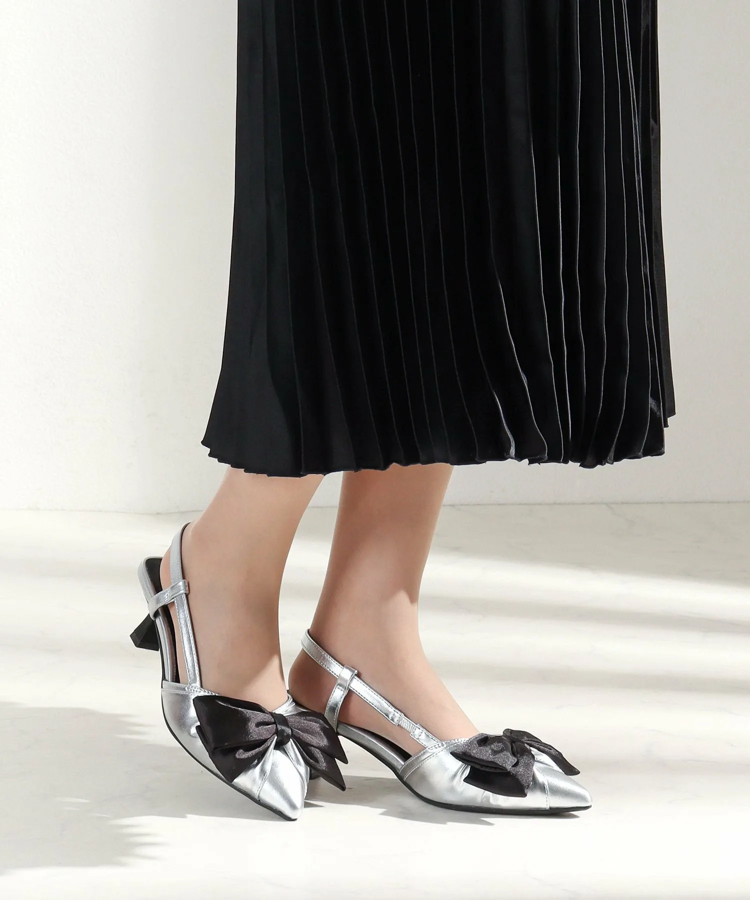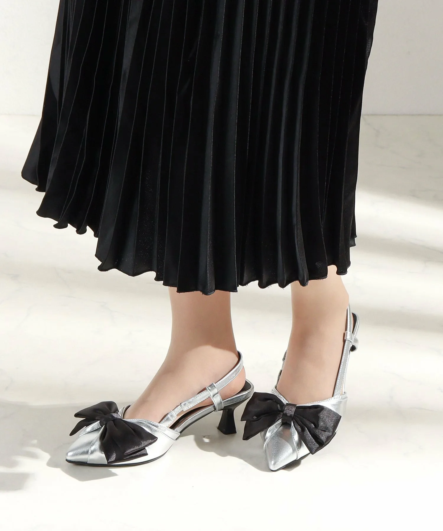 〈Атласная лента〉Крупный мотив атласной ленты создает романтическую атмосферу, начиная с ног.