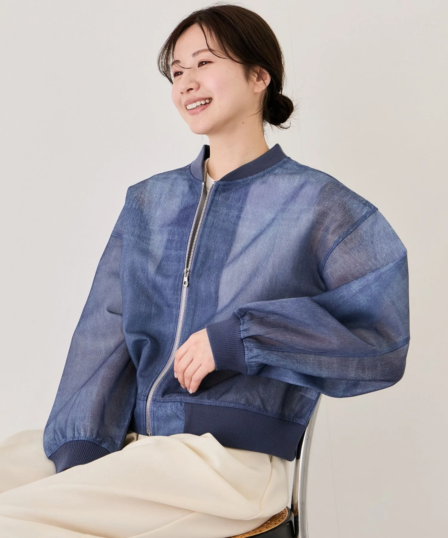 Текстура денима и ощущение легкости и прозрачности. Прозрачная блузон из денима, напоминающего картон, для городской моды. [Дизайн и силуэт]