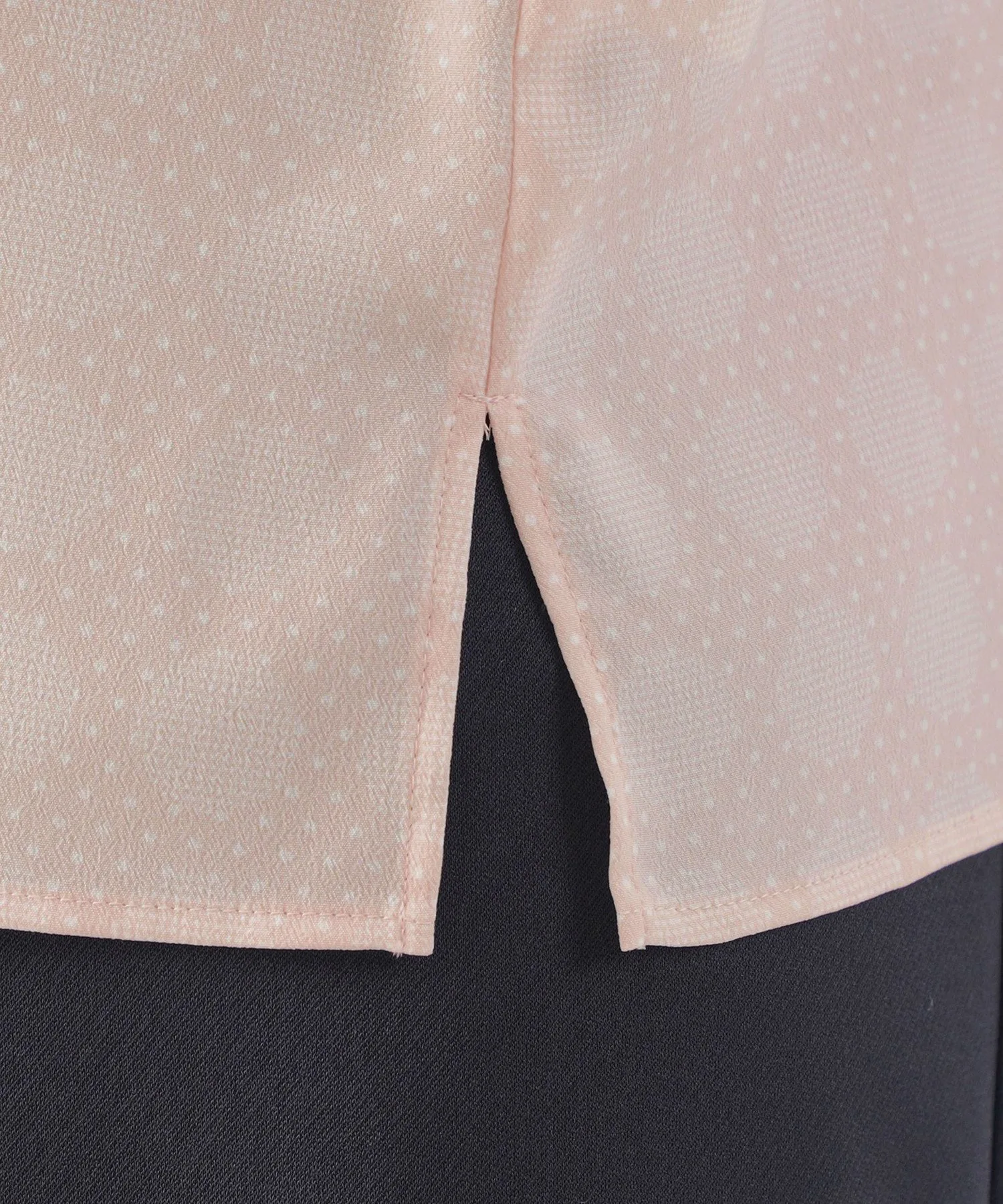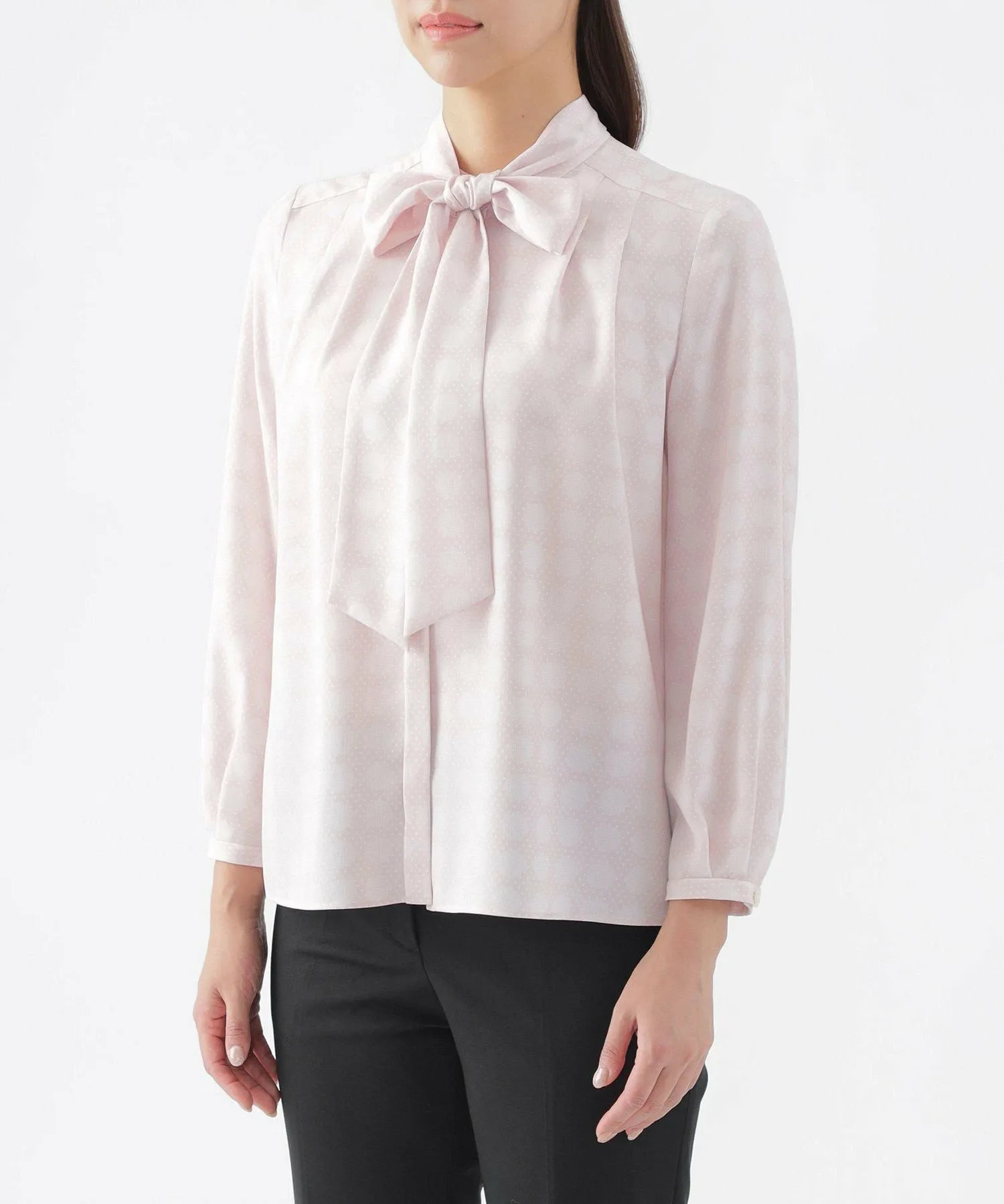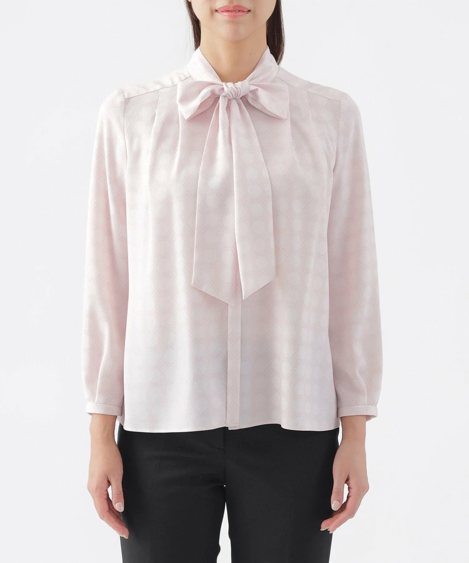 [L] [Можно стирать] Блузка с принтом в горошек. Этот товар большого размера. Блузка с воротником-стойкой имеет съемную ленту. Она доступна в двух цветах: кремовом и розовом, которые легко сочетаются и освежают лицо. Лента съемная, поэтому вы можете носить ее с бантом или без него, в зависимости от вашего наряда. Этот оригинальный принт в горошек выполнен из гладкой, комфортной саржевой ткани. Она хорошо драпируется, создавая красивый силуэт и удобную посадку. Принт представляет собой простой, но классический и элегантный узор в горошек, который создает ощущение глубины и объема. К проймам прикреплена антибактериальная и дезодорирующая лента. Крой разработан с учетом особенностей больших размеров, обеспечивая аккуратную посадку. Размер 44 примерно соответствует размеру 13, а размер 46 примерно соответствует размеру 15. Рекомендуемый сезон: все сезоны.