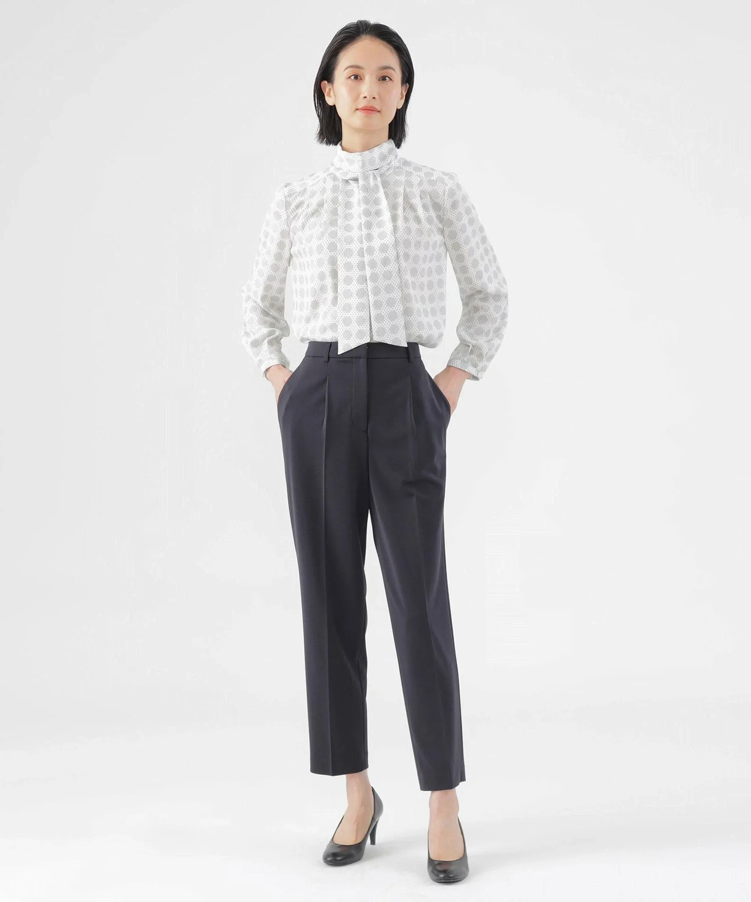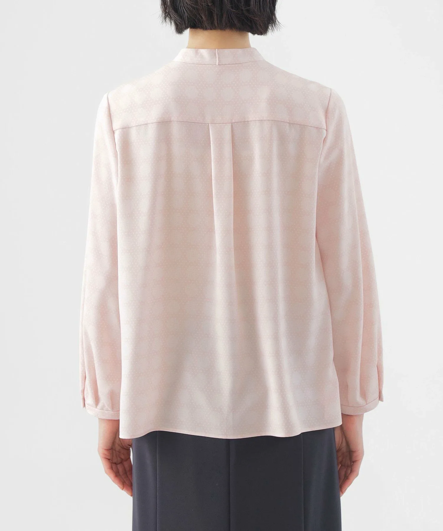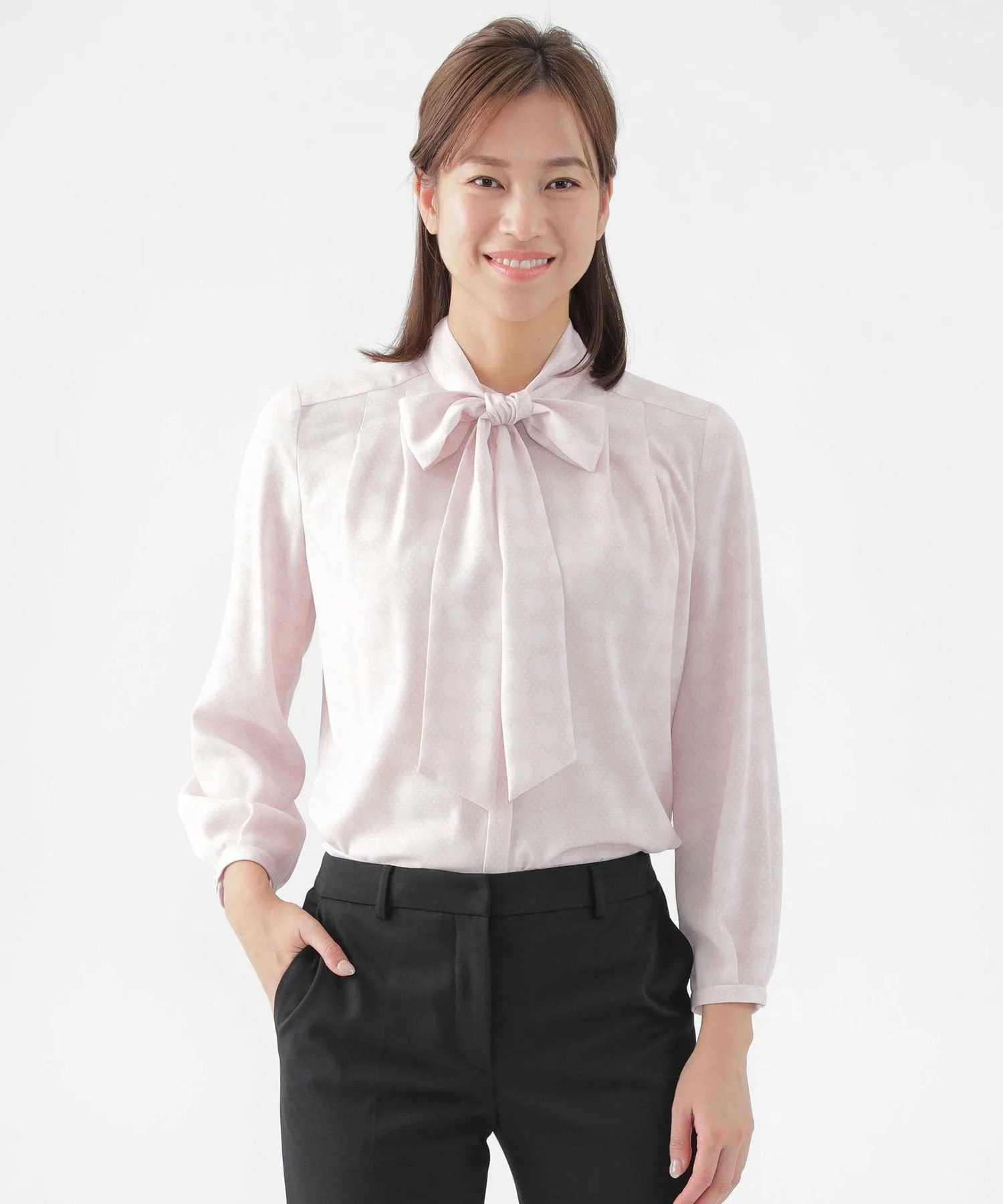 [L] [Можно стирать] Блузка с принтом в горошек. Этот товар большого размера. Блузка с воротником-стойкой имеет съемную ленту. Она доступна в двух цветах: кремовом и розовом, которые легко сочетаются и освежают лицо. Лента съемная, поэтому вы можете носить ее с бантом или без него, в зависимости от вашего наряда. Этот оригинальный принт в горошек выполнен из гладкой, комфортной саржевой ткани. Она хорошо драпируется, создавая красивый силуэт и удобную посадку. Принт представляет собой простой, но классический и элегантный узор в горошек, который создает ощущение глубины и объема. К проймам прикреплена антибактериальная и дезодорирующая лента. Крой разработан с учетом особенностей больших размеров, обеспечивая аккуратную посадку. Размер 44 примерно соответствует размеру 13, а размер 46 примерно соответствует размеру 15. Рекомендуемый сезон: все сезоны.