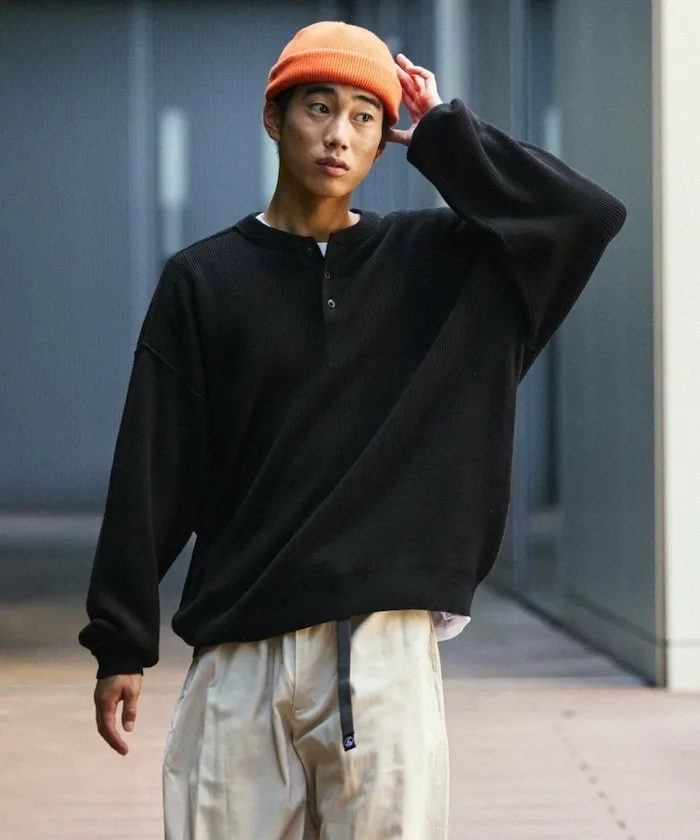 Свободный крой, одинарная ребристая вязка, соединительный узор, воротник хенли