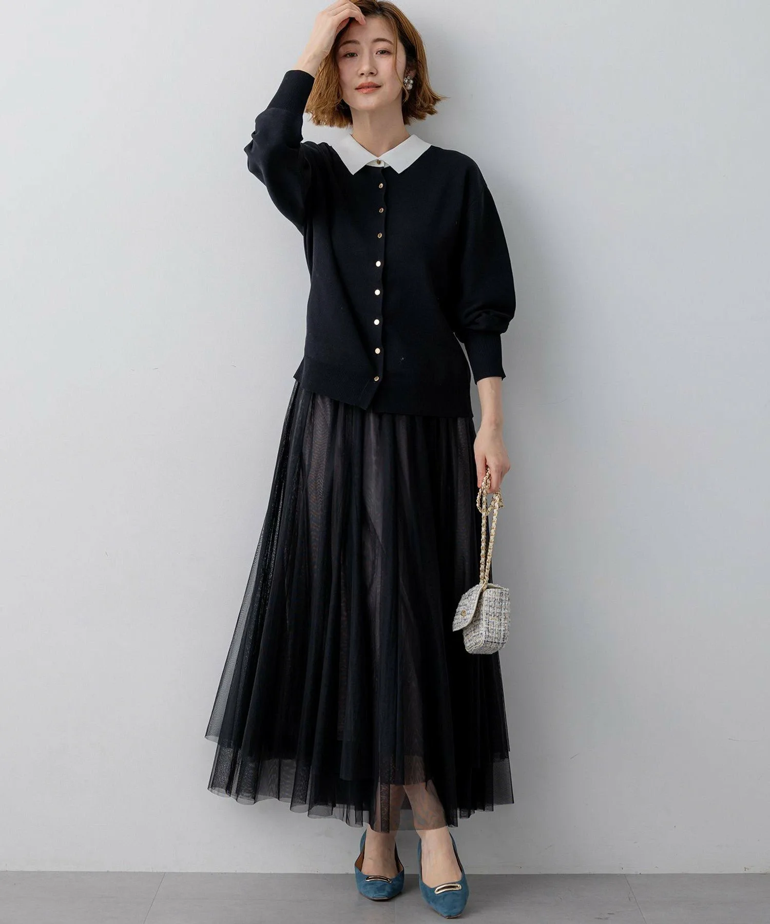 Этот пуловер с воротником выполнен из изысканной, плотной вязки и может носиться как спереди, так и сзади. Чистый, кремовый воротник освежает лицо и создает утонченный образ. Мягкие рукава-фонарики добавляют женственности, а едва заметные пуговицы с выгравированным логотипом бренда — акцент. Сочетайте его с простыми брюками или юбками для создания универсального образа, от офиса до повседневных прогулок. Наслаждайтесь разнообразием вариантов сочетания: от повседневной одежды с джинсами до элегантных брюк или юбок. Доступен в трех цветах: шикарный и универсальный черный (#005), изысканный и интеллектуальный темно-синий (#075) и темно-коричневый (#035) для утонченного и утонченного образа.