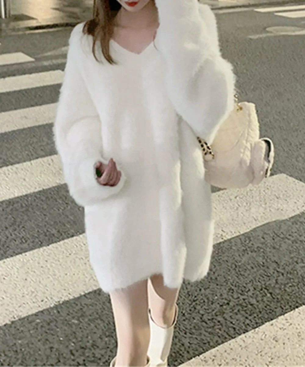 Однотонный свитер с V-образным вырезом, свободный, пушистый, универсальный, простой, повседневный, сексуальный и красивый.