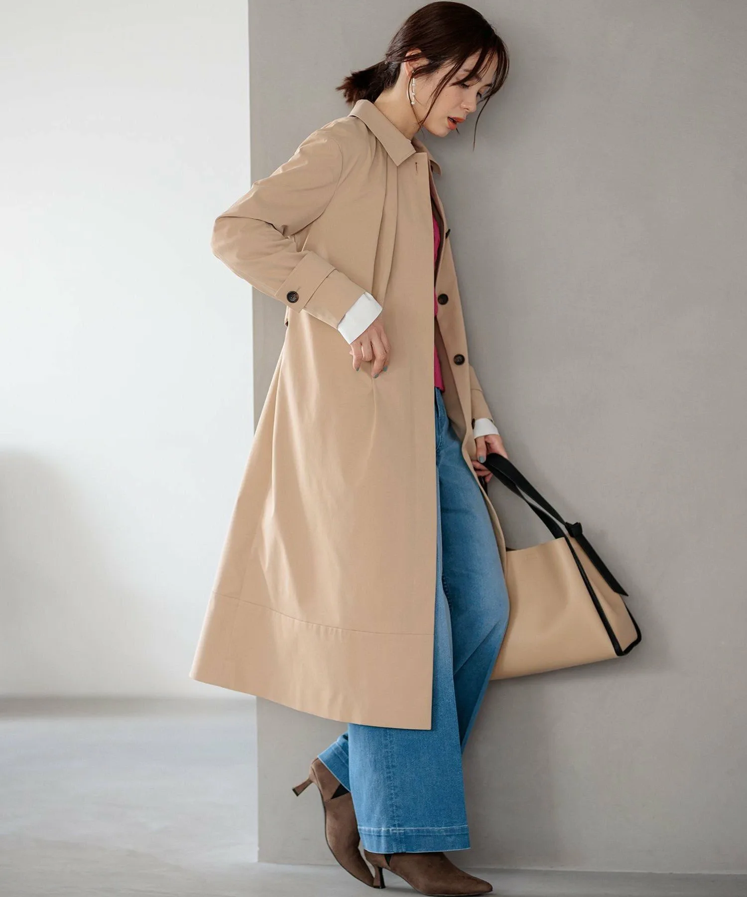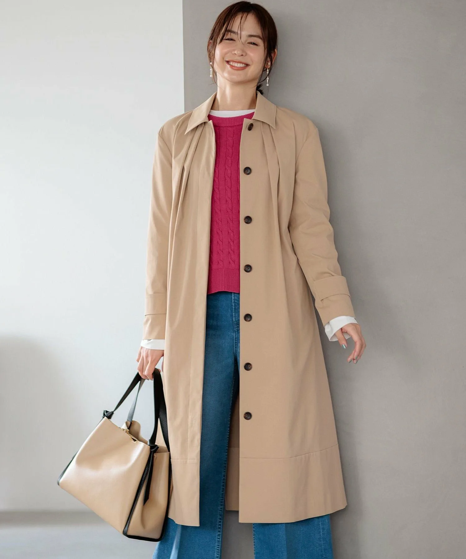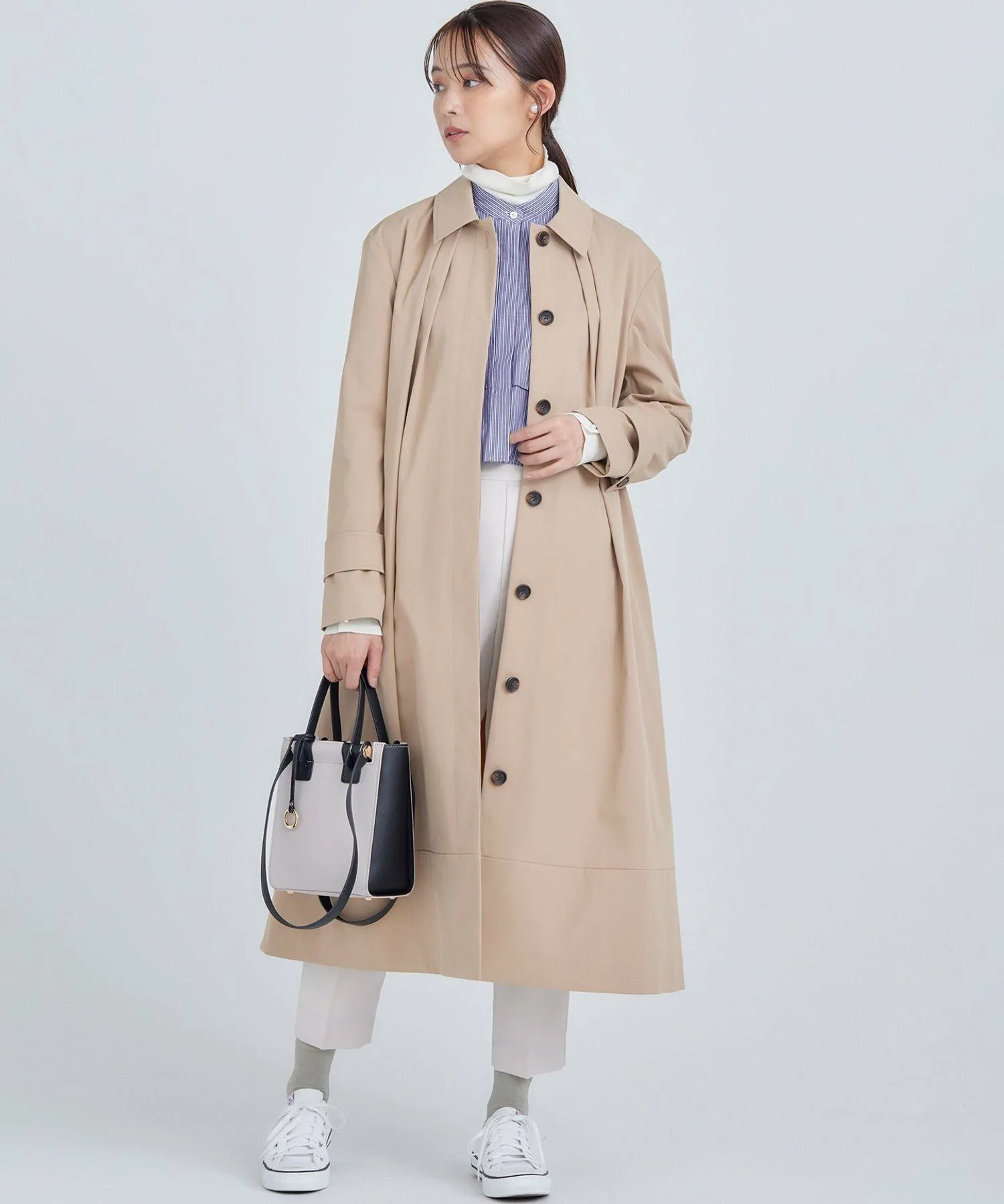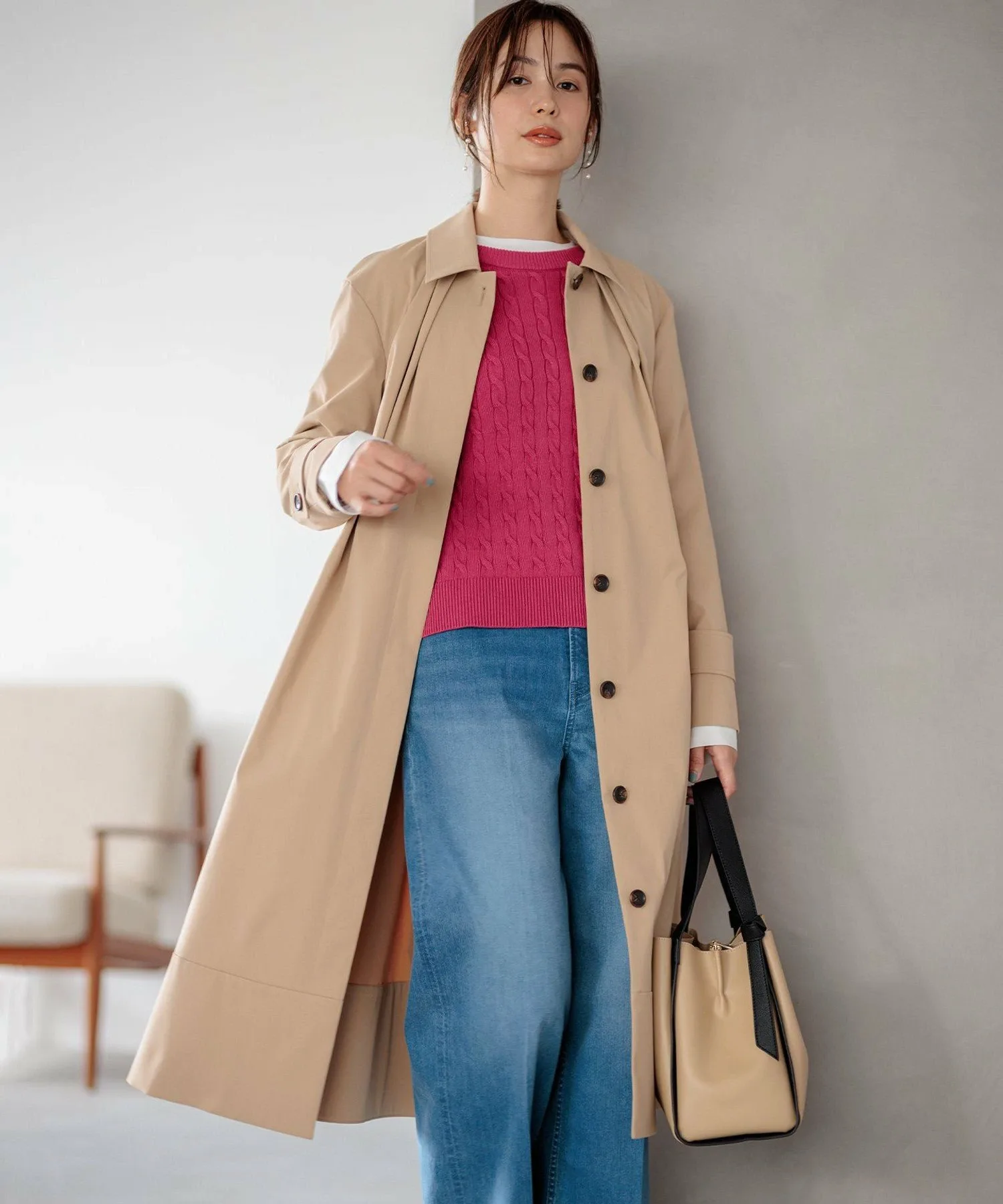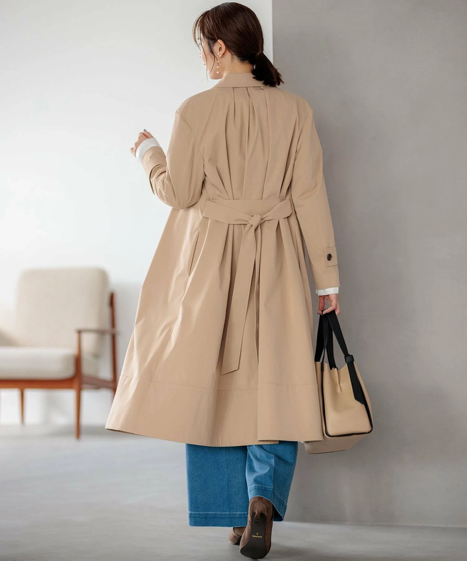 Дизайн: Современная интерпретация классического тренча. Трехмерная форма создает А-образный силуэт, слегка отходящий от тела, а большой воротник и складки на воротнике создают привлекательный силуэт вокруг лица. Свободный крой дополнен тщательно разработанными узорами и деталями, которые избегают громоздкости, создавая изысканный и сбалансированный вид. Его удобно накинуть поверх объемной блузки. Простой дизайн подчеркивает текстуру материала, создавая идеальный баланс между повседневным и нарядным стилем. Он отлично смотрится с расстегнутым спереди для повседневного образа или застегнутым на пуговицы и в сочетании с ботинками для более нарядного образа.
