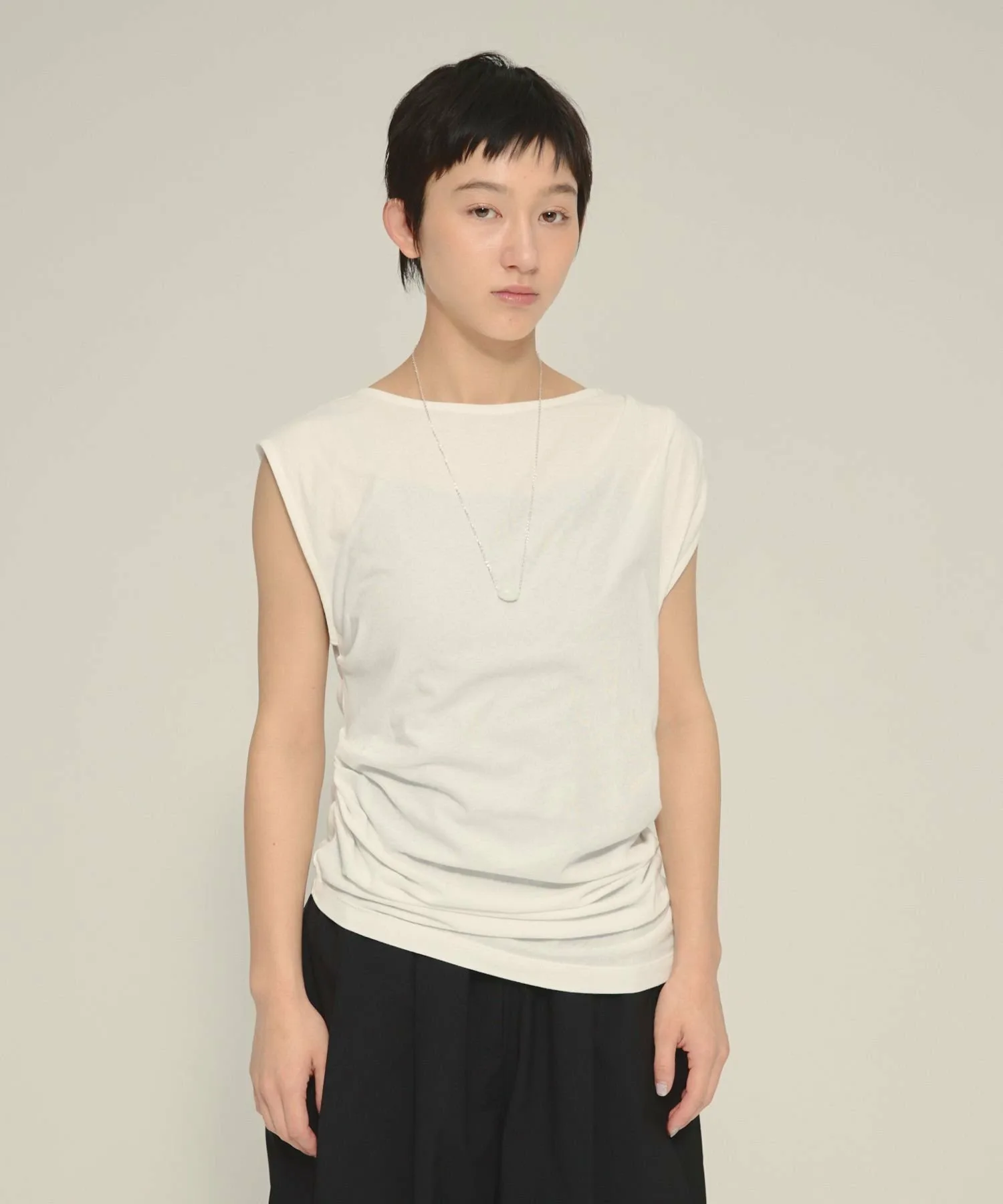 Случайные складки на плечах и по бокам создают асимметричные линии, формируя трехмерный силуэт.