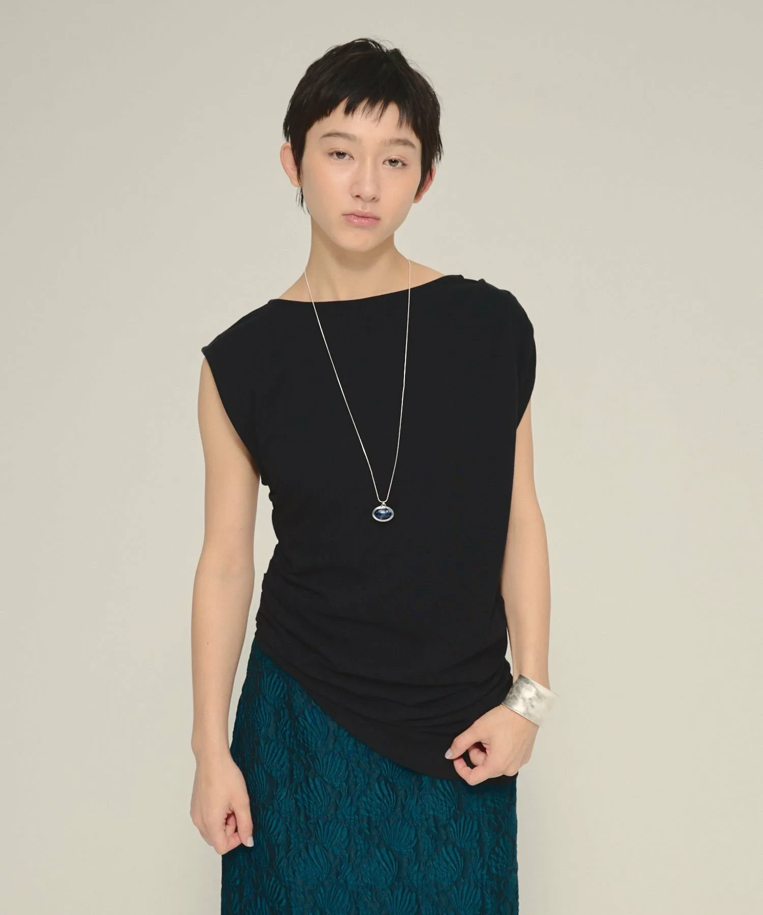 Случайные складки на плечах и по бокам создают асимметричные линии, формируя трехмерный силуэт.