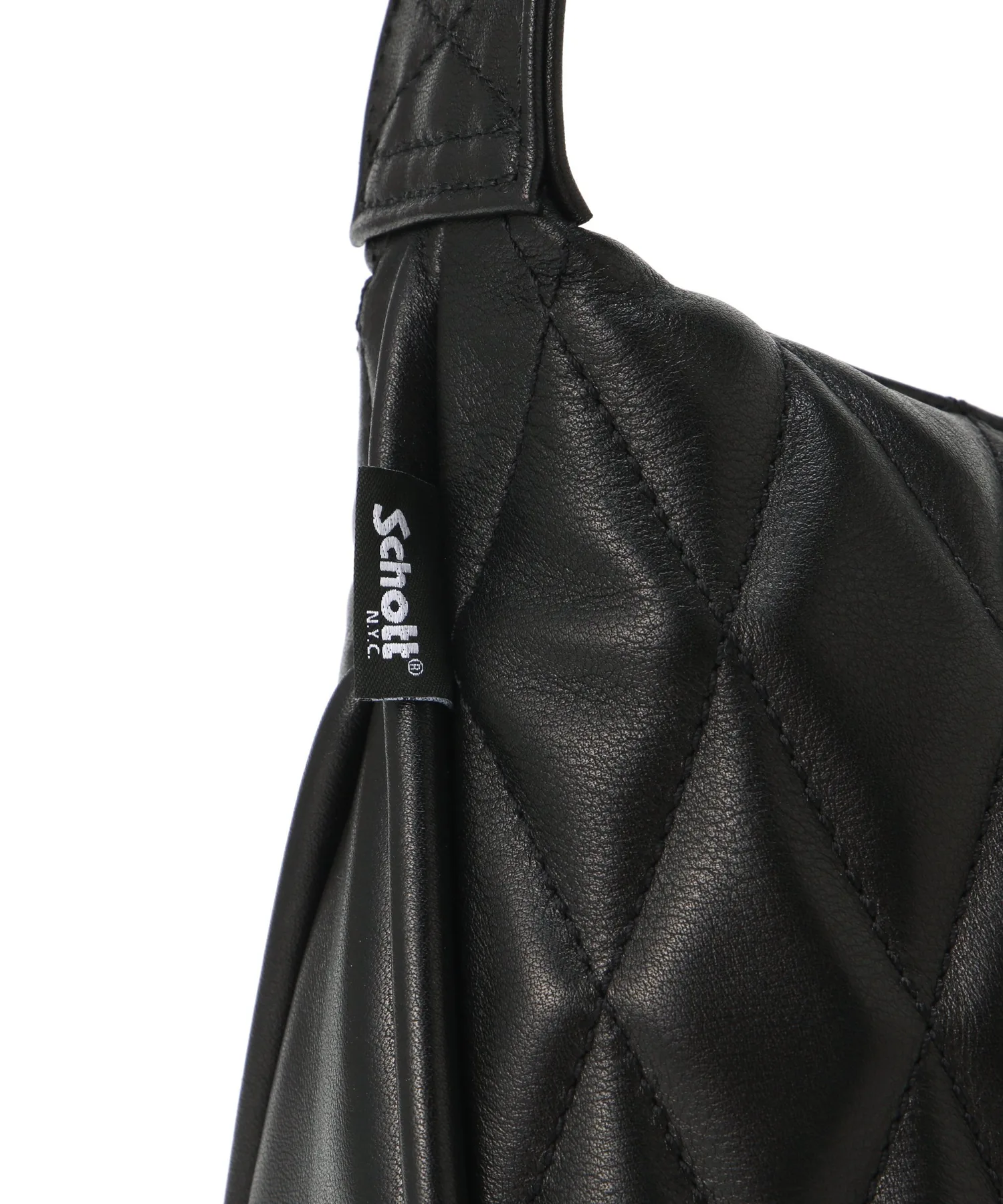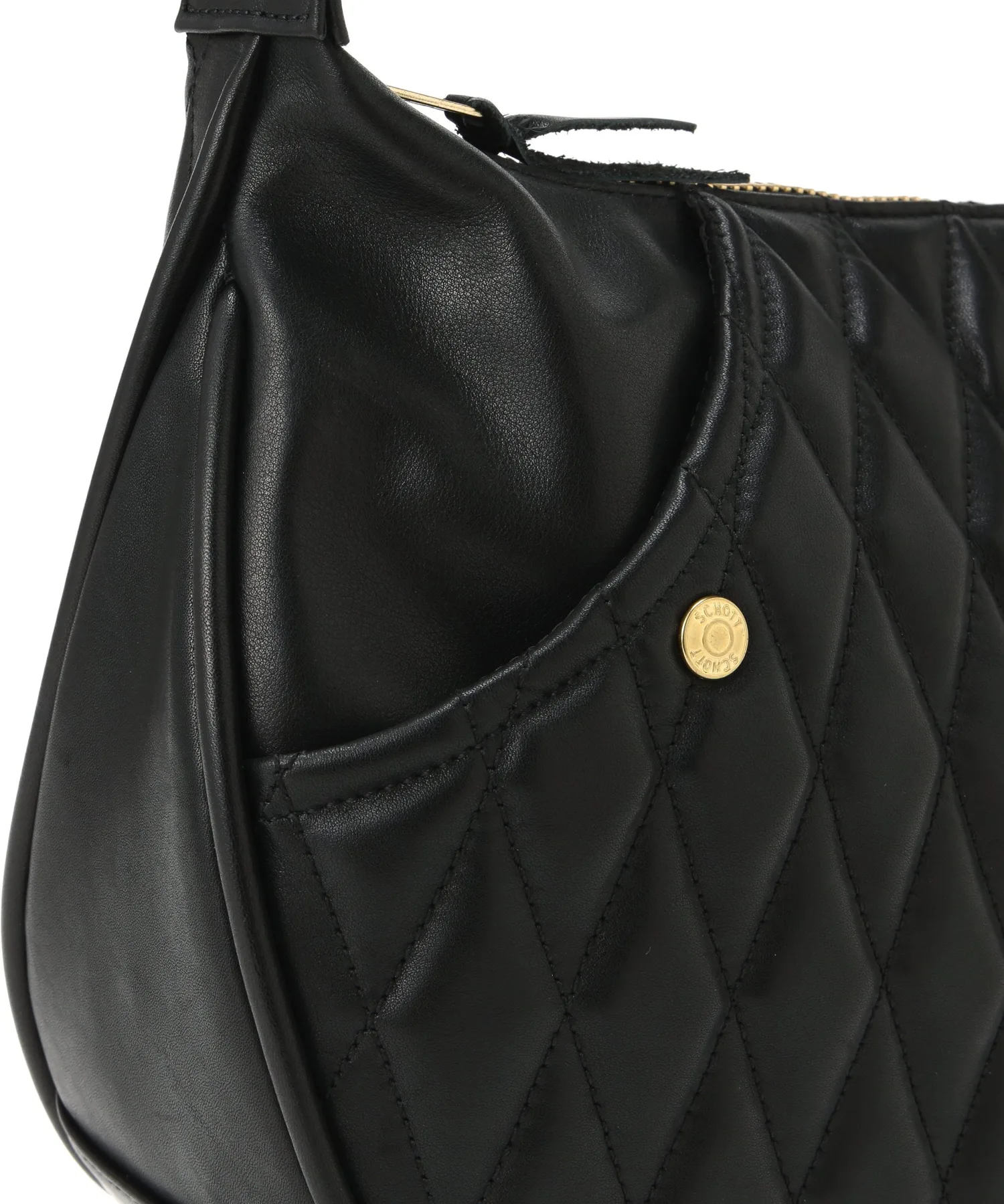 Эта стильная сумка через плечо украшена ромбовидной стежкой, напоминающей подкладку байкерских курток Schott.
