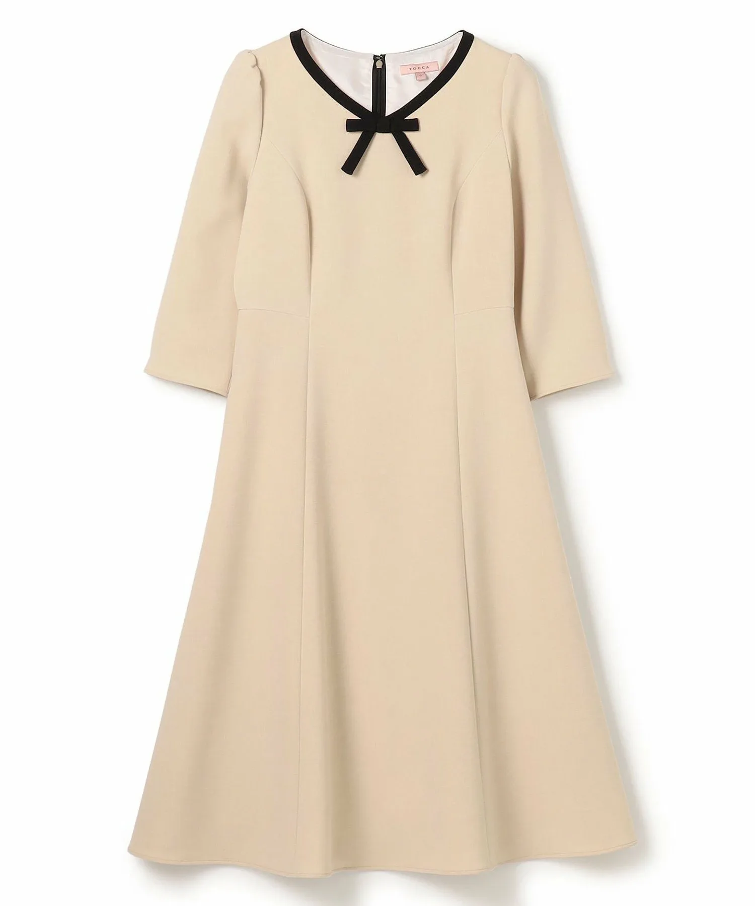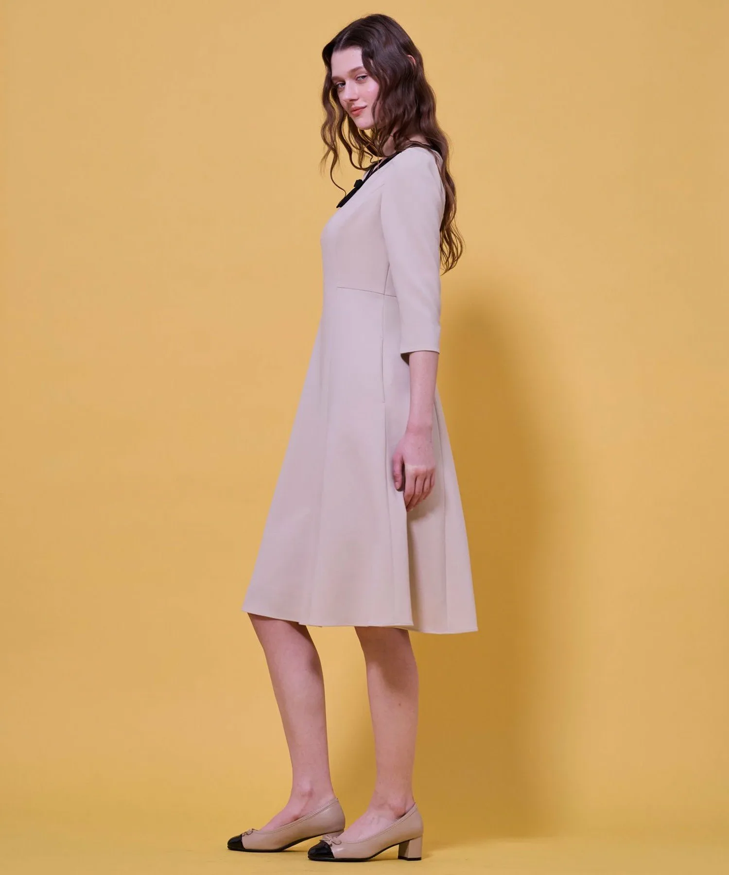 Глубокий вырез и контрастная лента создают классический, но очаровательный образ. Силуэт, расширяющийся от талии до подола, создает чистое впечатление, выражая при этом женственную мягкость. Рукава три четверти сочетают в себе формальность и женственность.