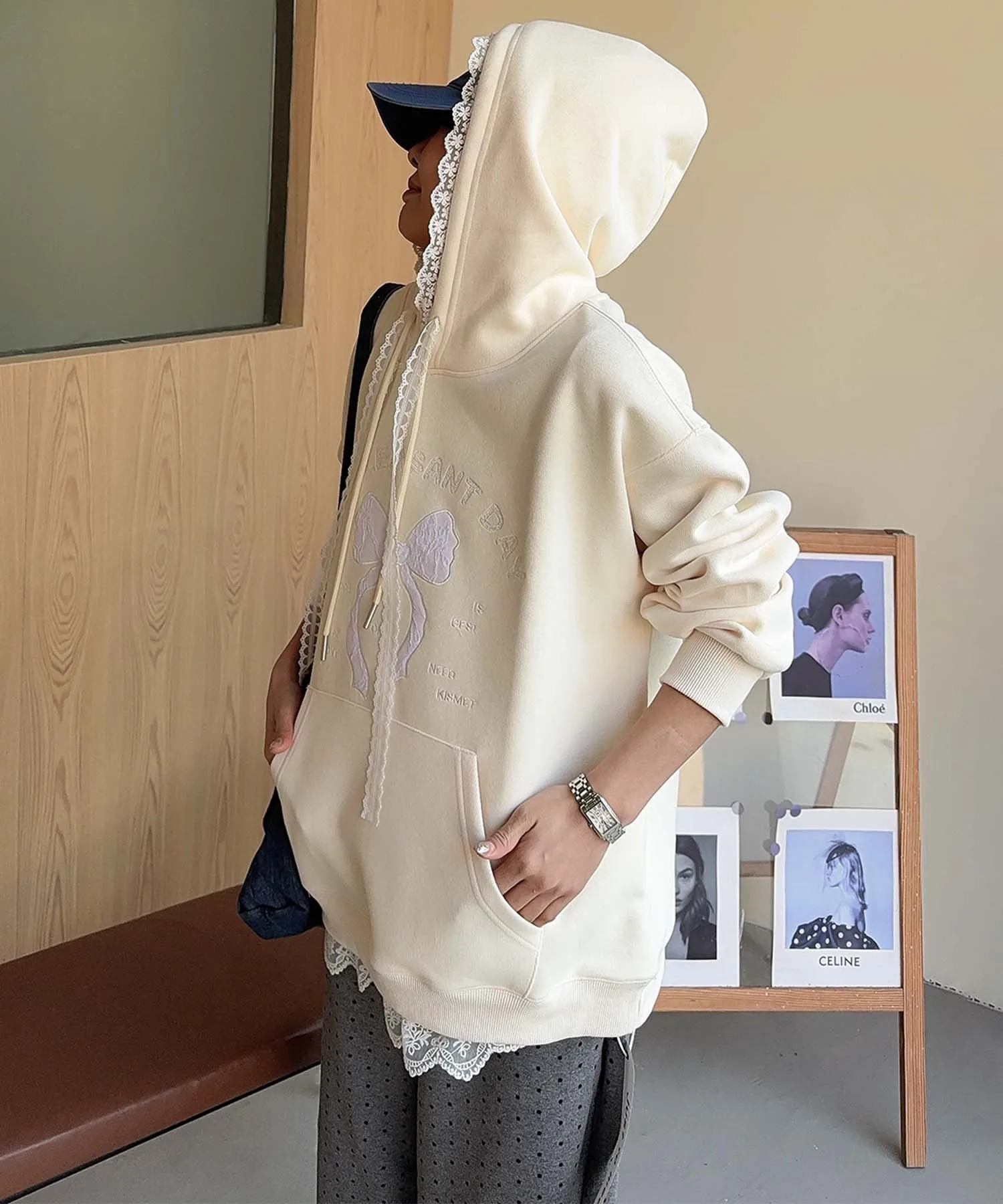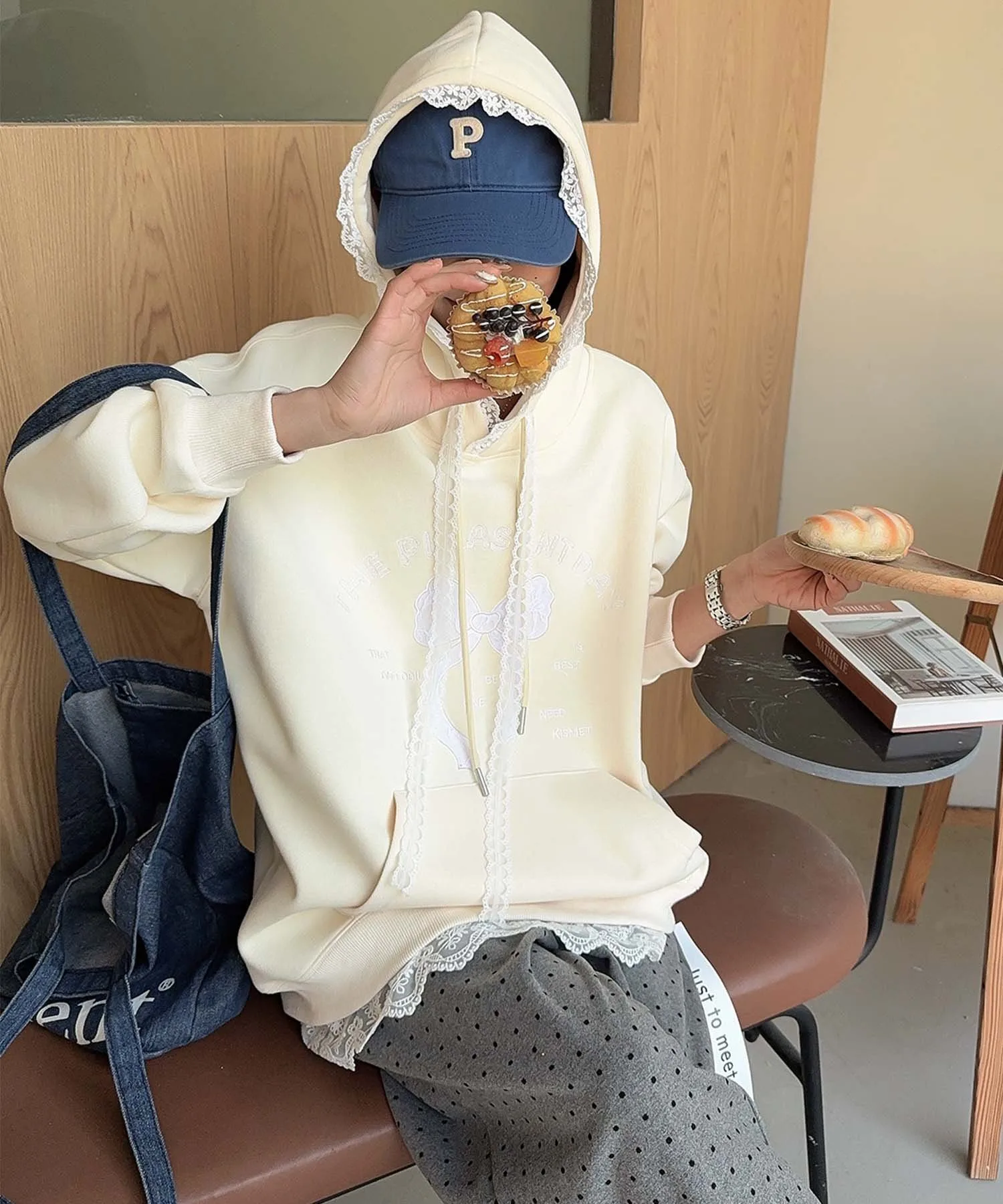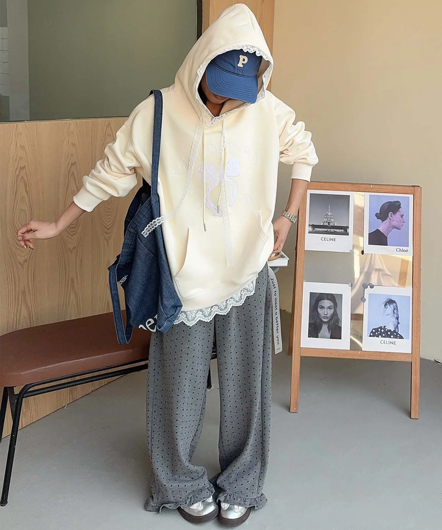 Эта толстовка украшена принтом в виде лент и оборками на капюшоне. Ее повседневный дизайн и светлый цвет создают ощущение "пушистой" вещи. Она имеет простой принт спереди и отличный дизайн с капюшоном. Это повседневный стиль, который подойдет для ежедневного ношения.