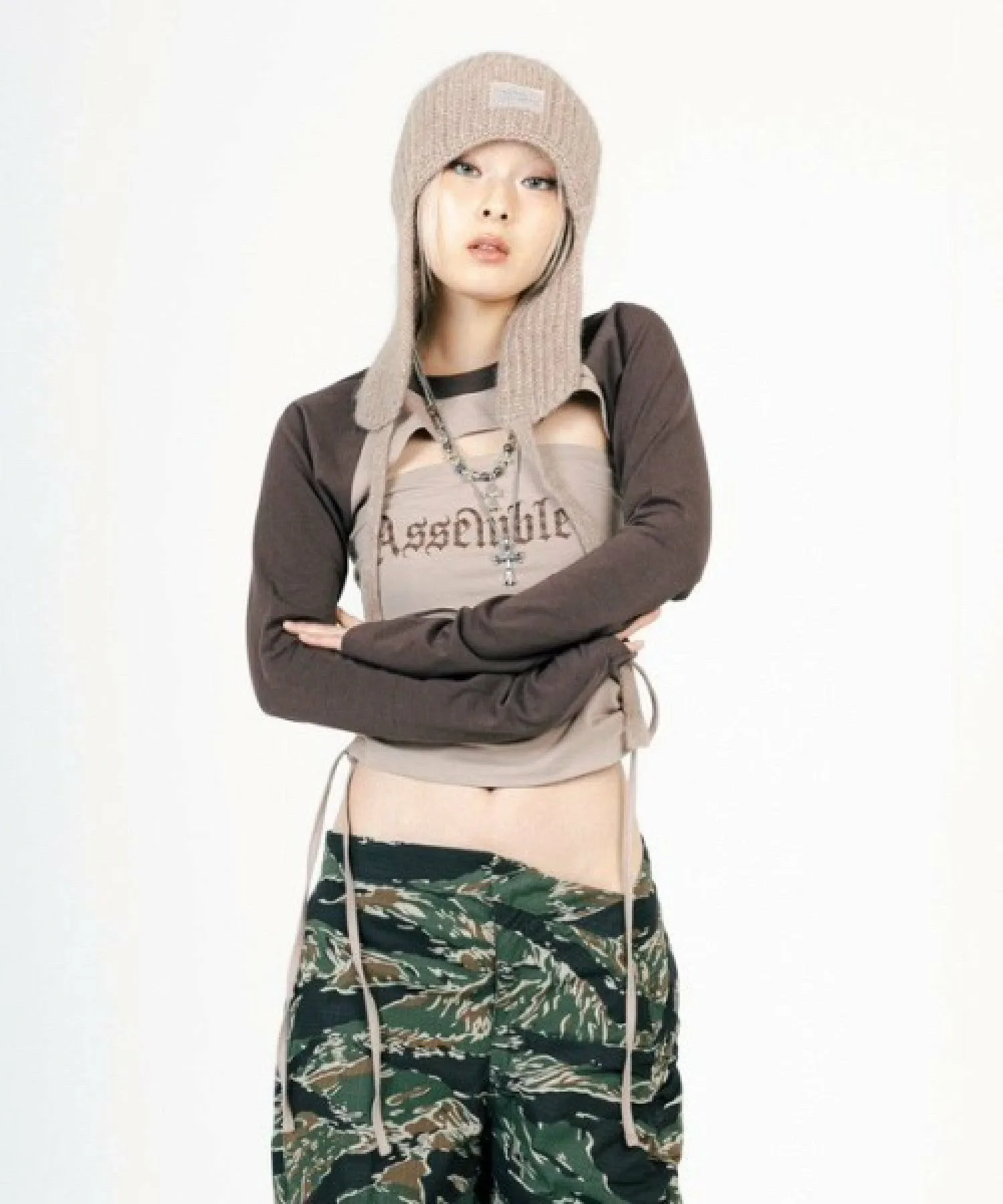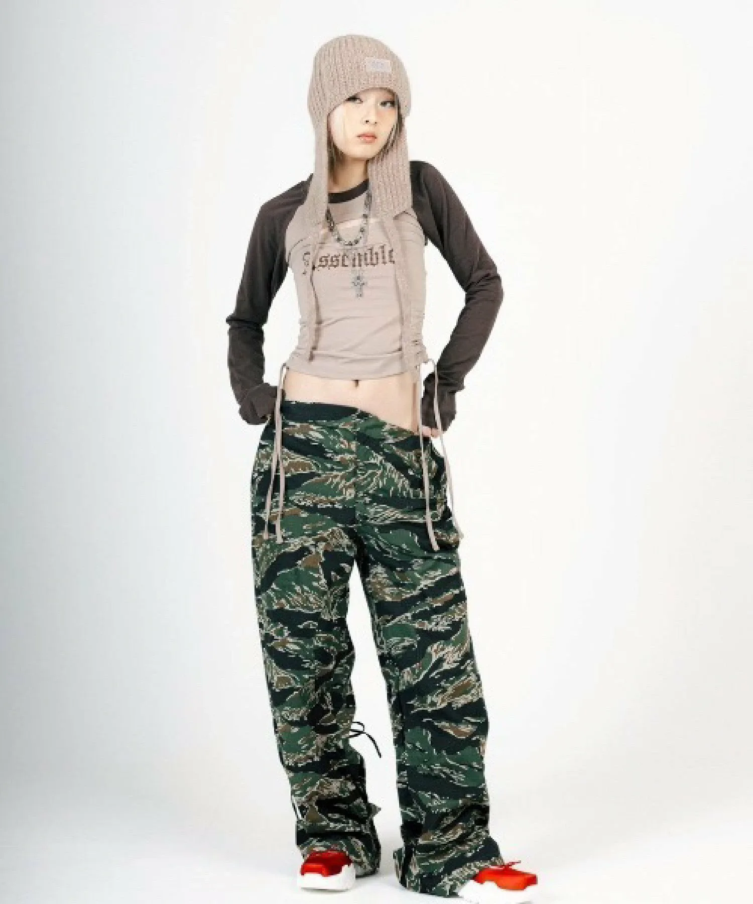 Он сочетается с различными вариантами низа, такими как объемные брюки-карго, джинсы, мини-юбки и облегающие юбки.