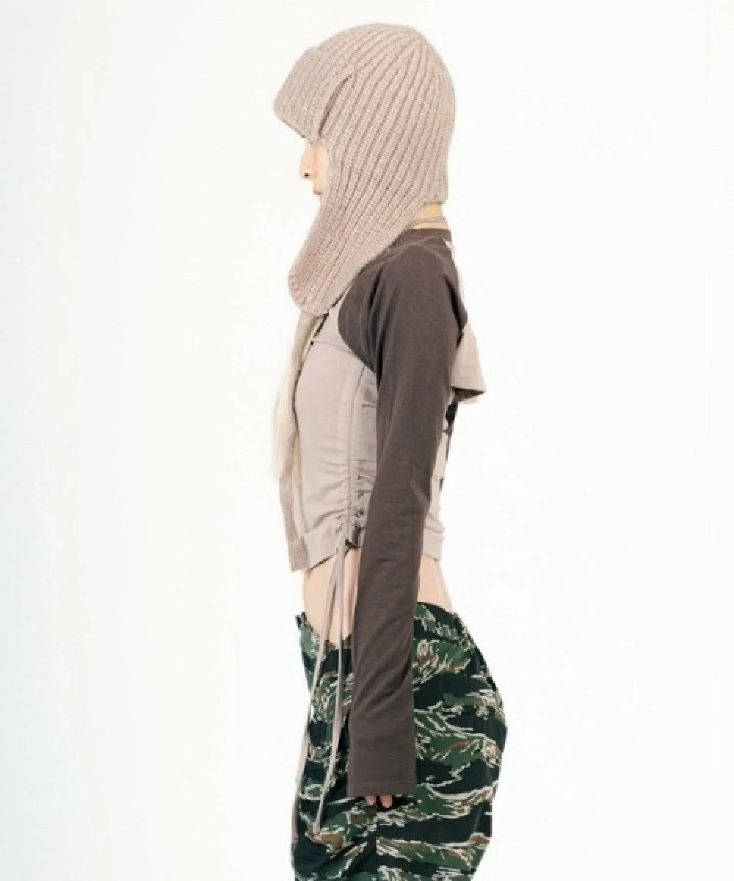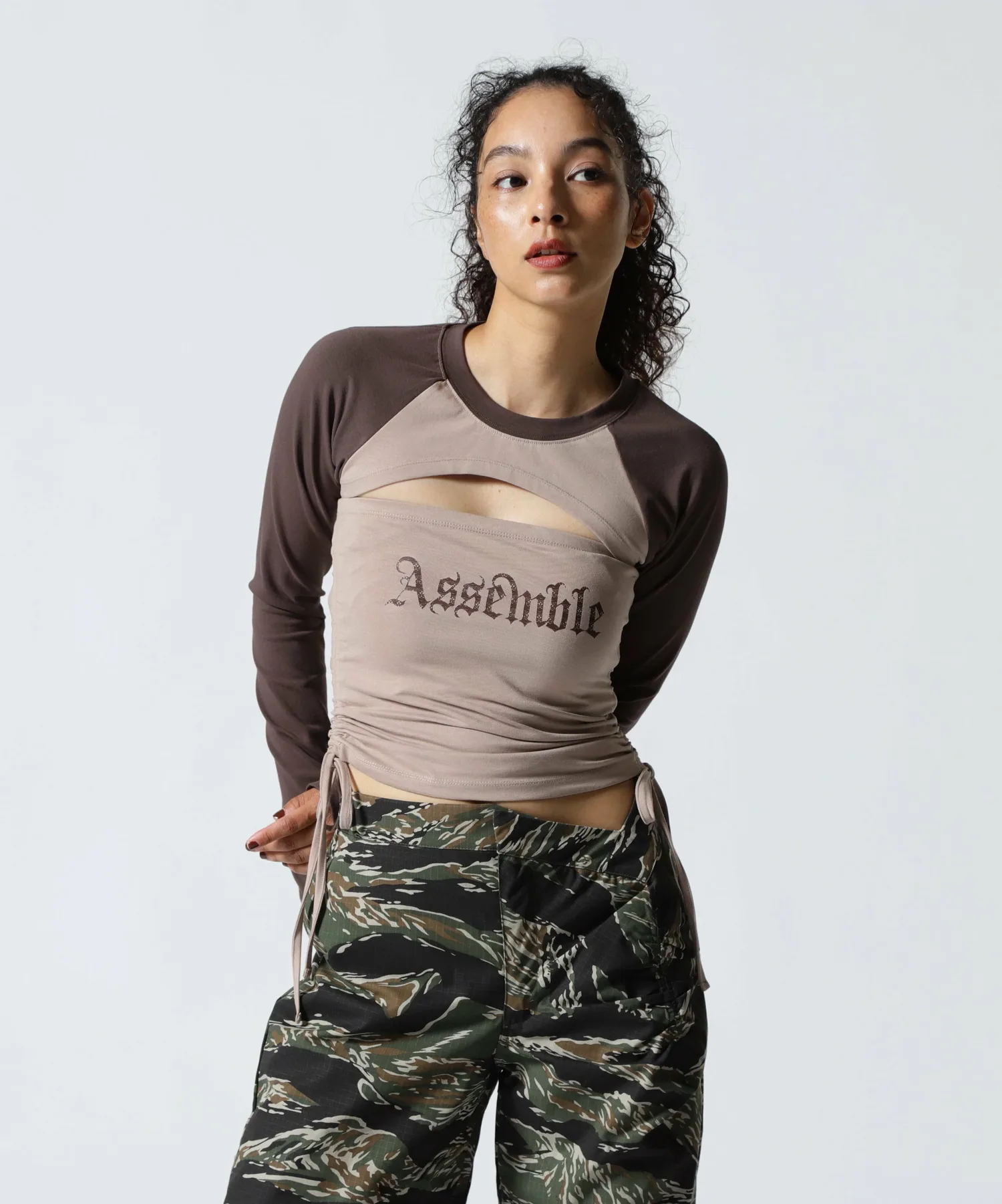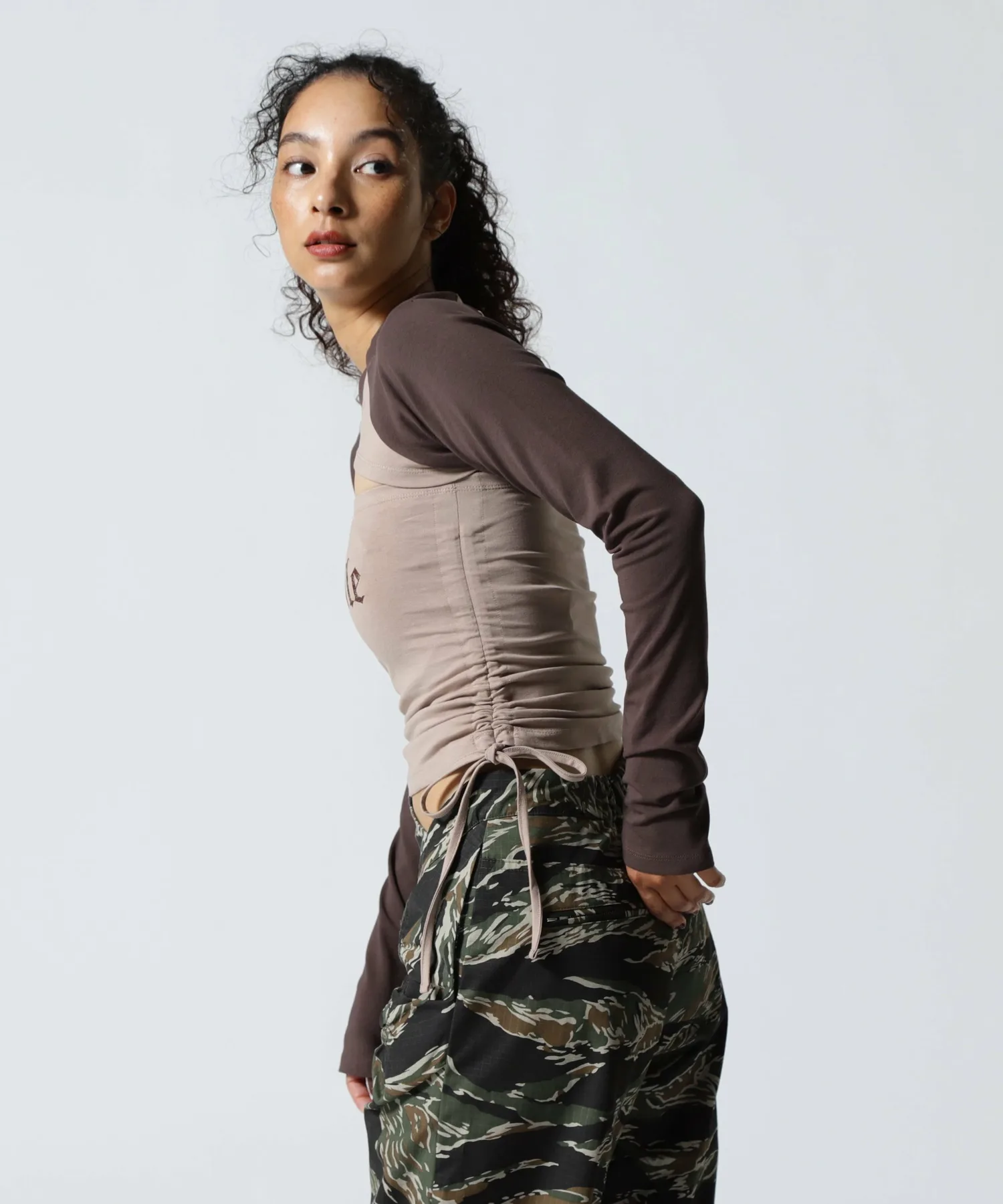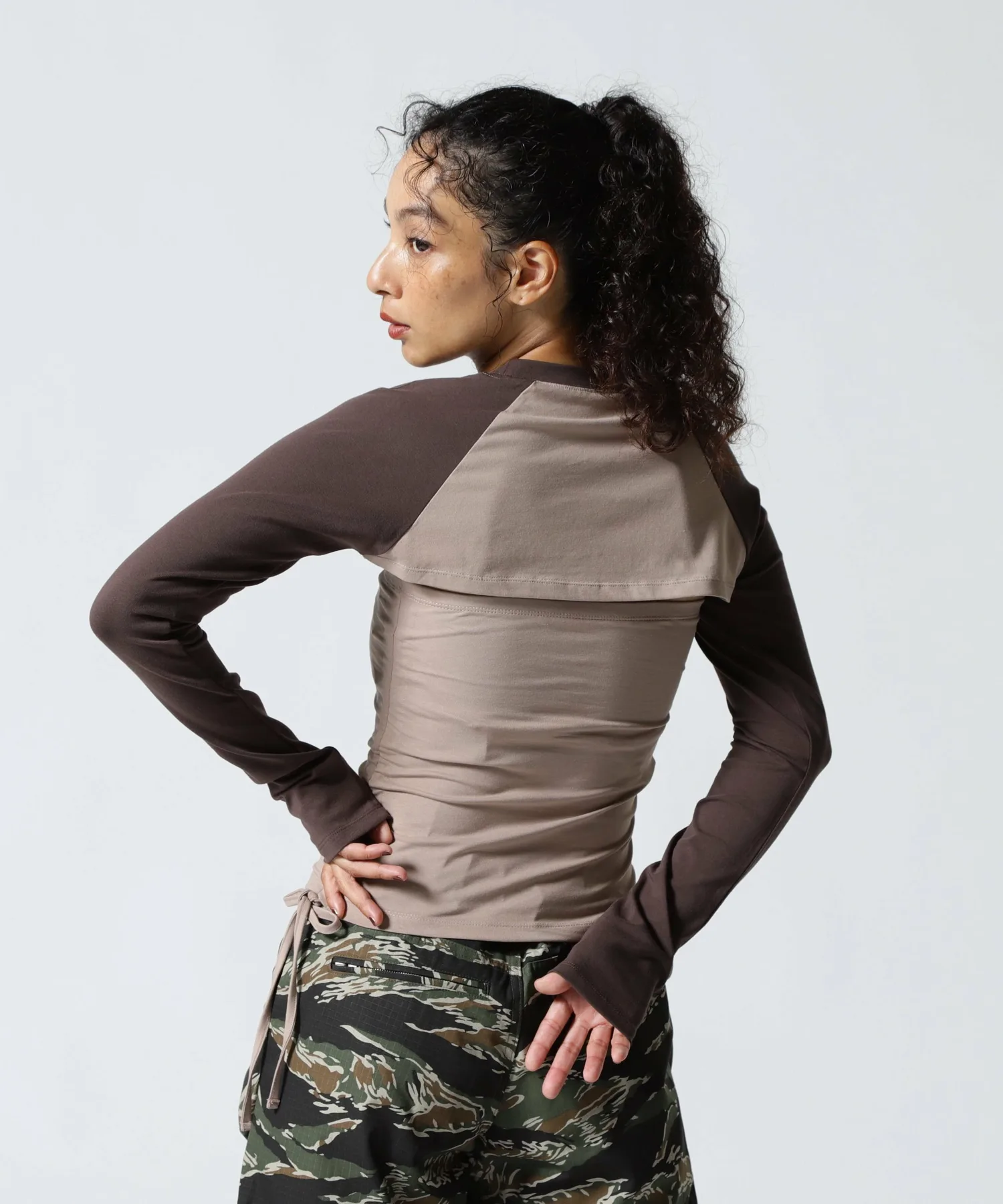 Затянув собранные с обеих сторон ленты, его можно носить как укороченным, так и только как топом без рукавов.