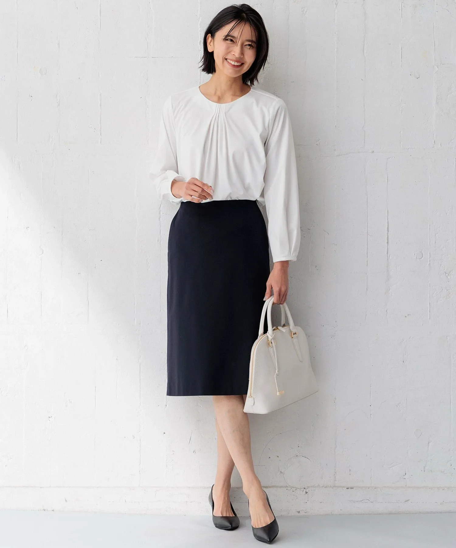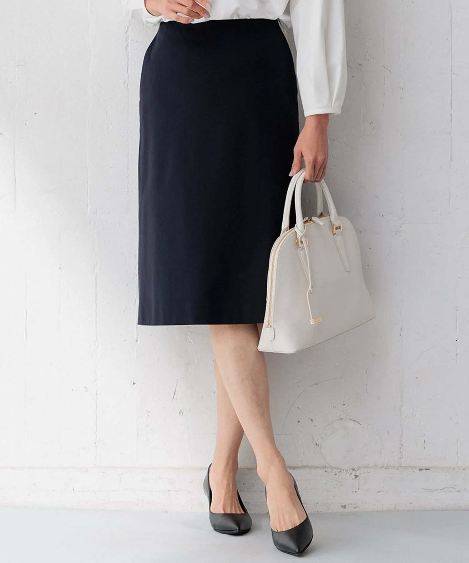 Эта юбка имеет красивый силуэт, идеально облегающий фигуру. Прямой крой не слишком обтягивающий, поэтому он не слишком подчеркивает ноги. Длина доходит до колен, а складки на заднем крае обеспечивают свободу движений и добавляют стильный акцент. Сочетайте ее с жакетом из той же серии для завершенного образа. Доступна в двух цветах: ярком и изысканном сером (#004) и чистом и элегантном темно-синем (#075).