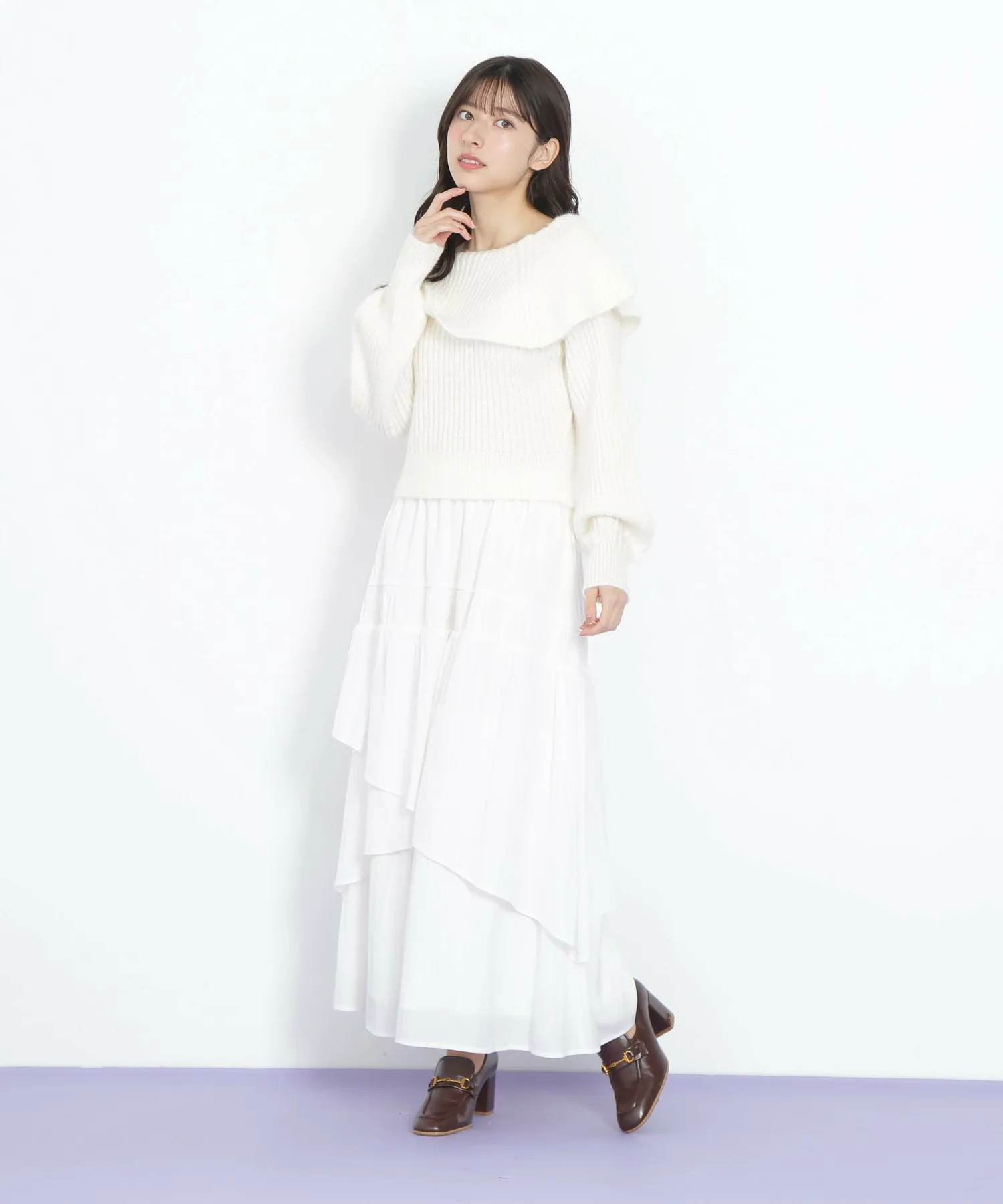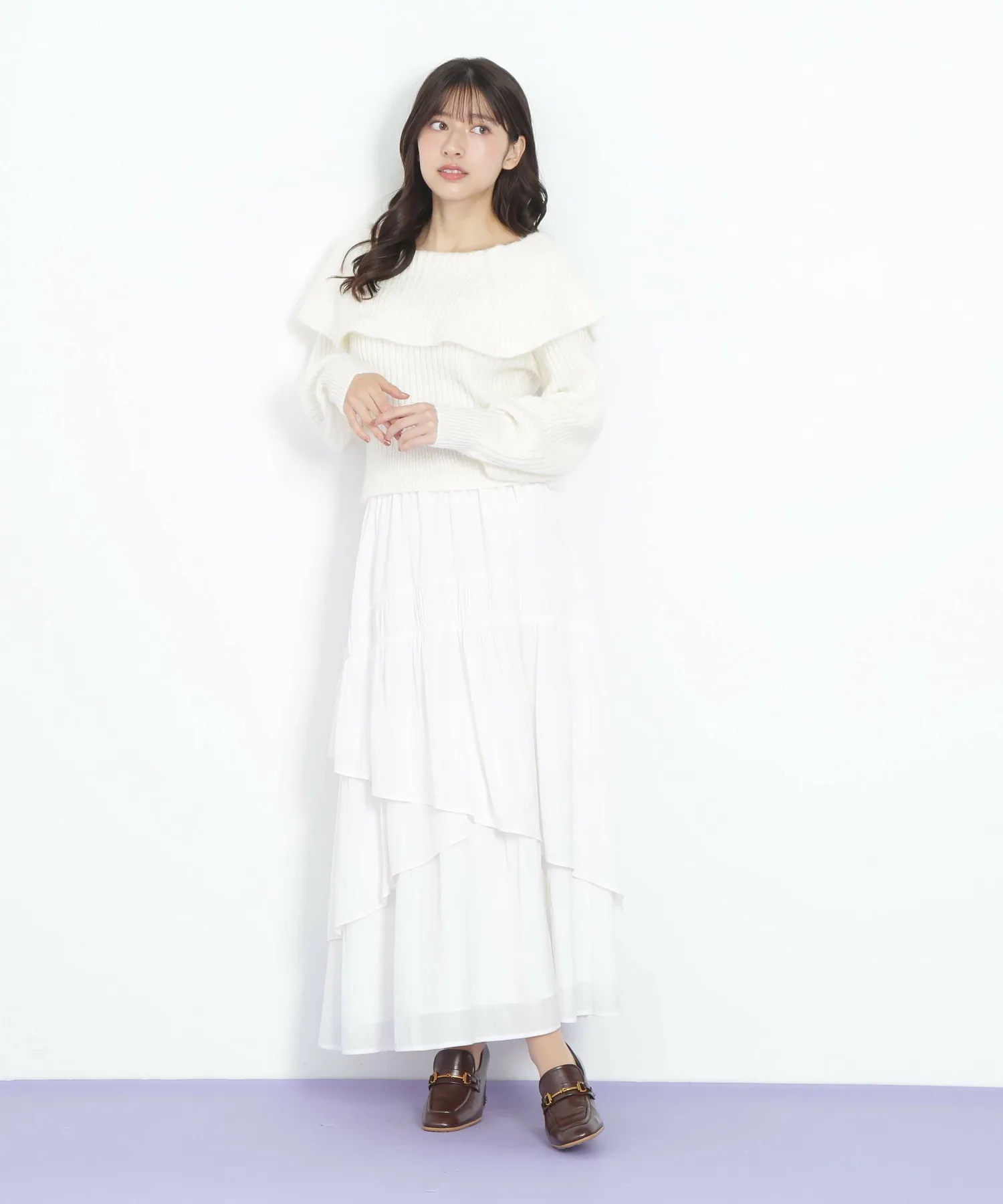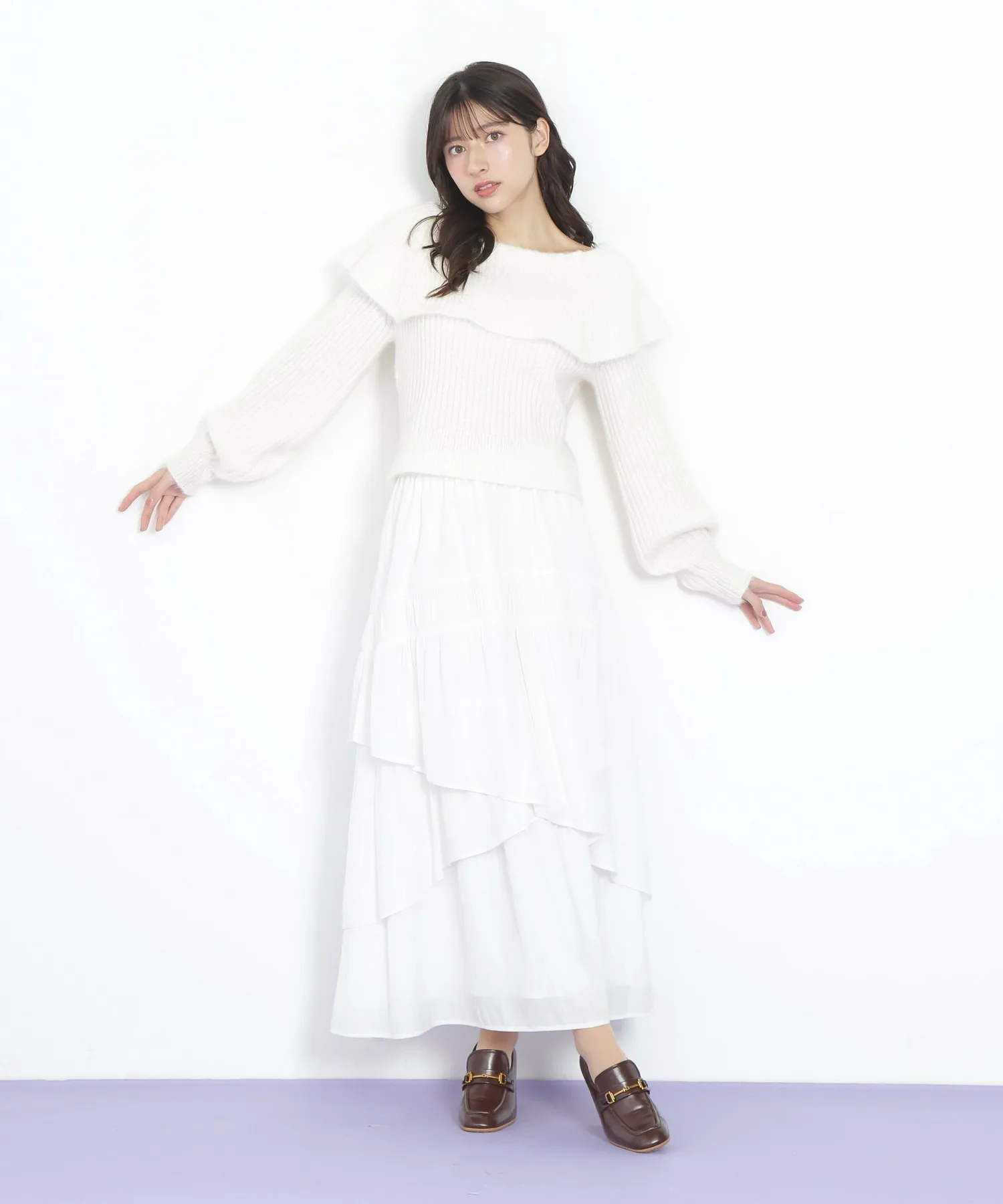 Главная деталь – большой вырез, напоминающий накидку. Слегка свободное, открытое декольте создает женственный образ.