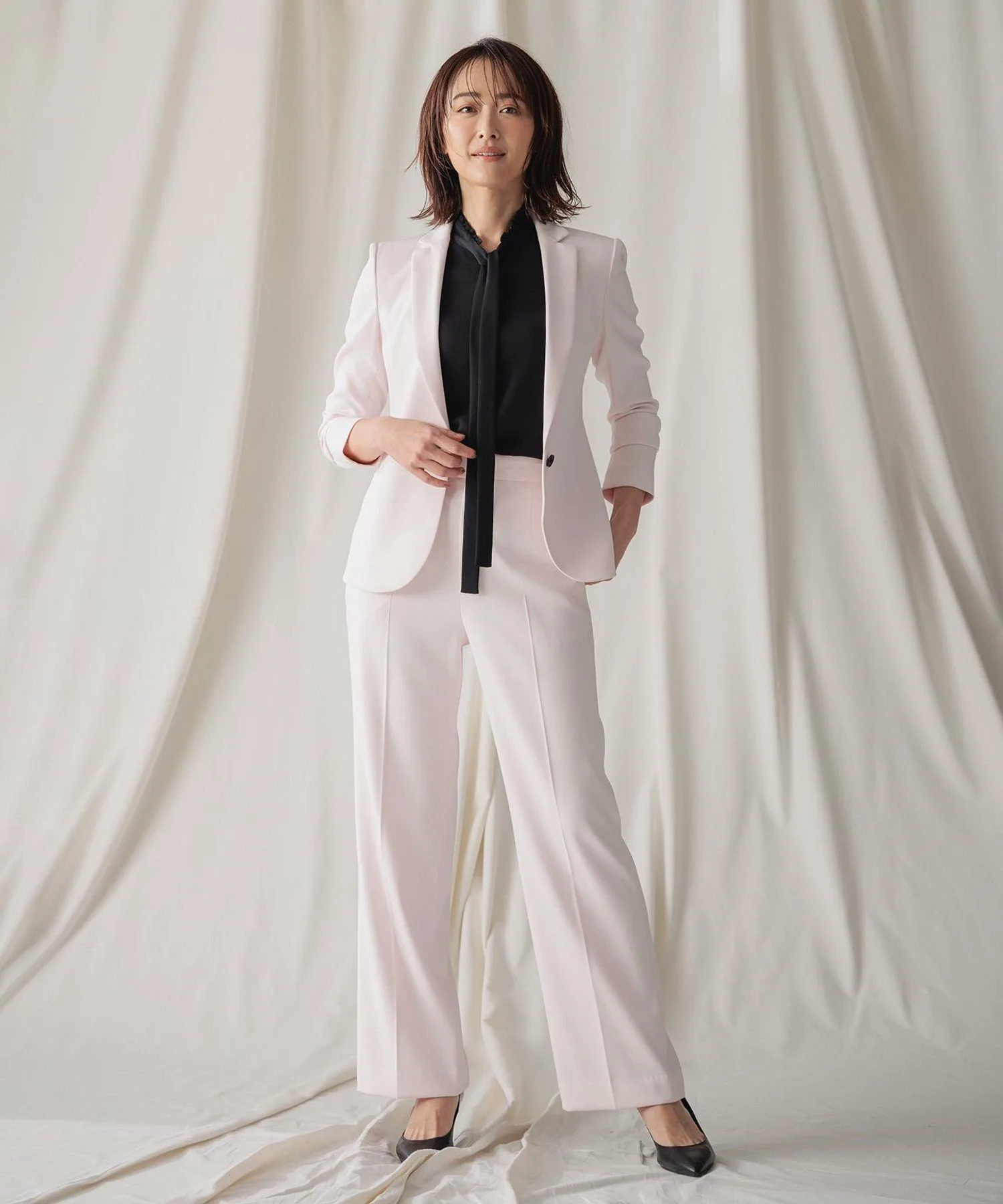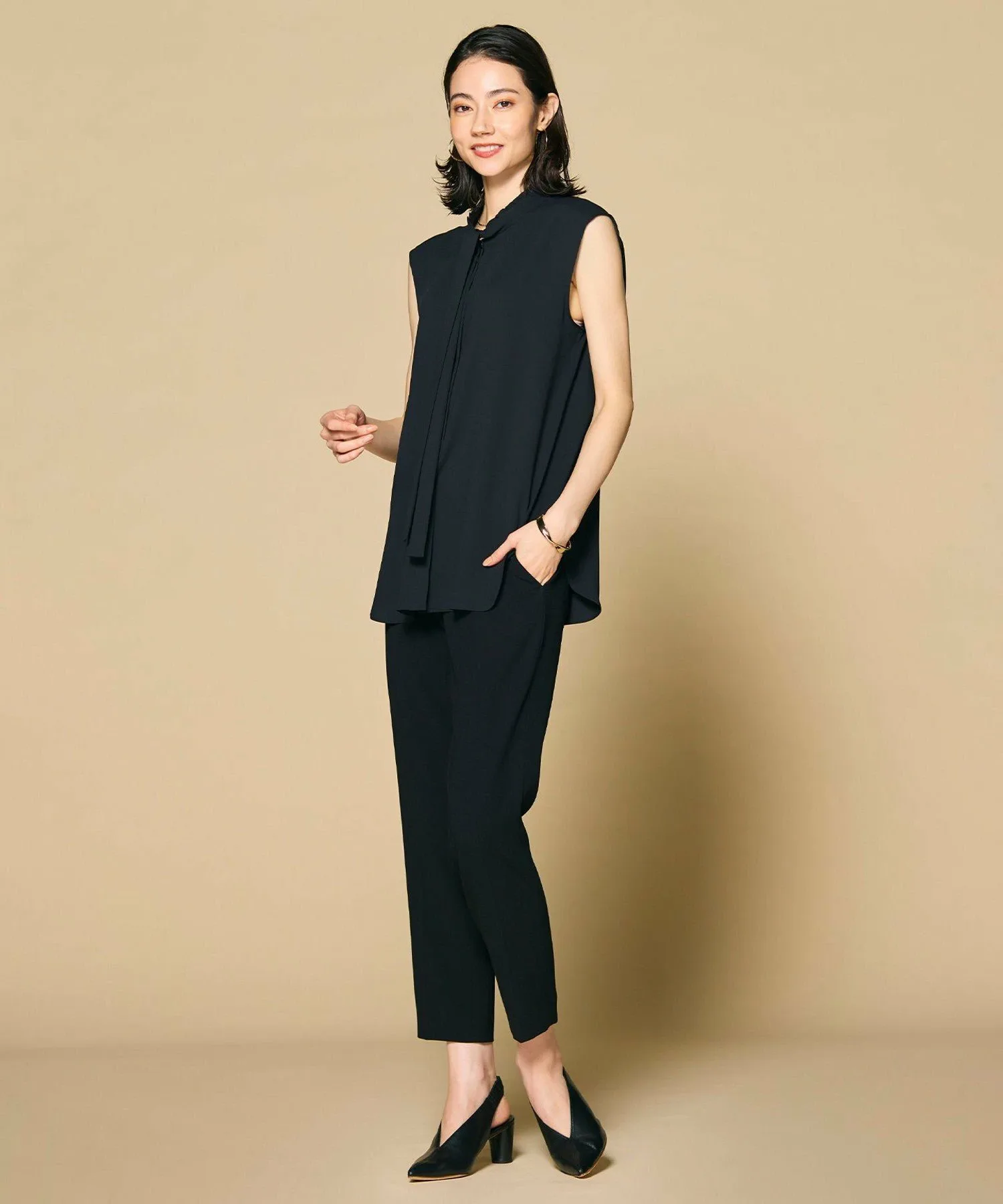 Блузка без рукавов с бантом бежевого цвета, украшенная мелкими оборками на вырезе горловины, — классический силуэт, любимый многими годами. Элегантная драпировка подчеркнута деталями, напоминающими рубашку, чтобы блузка не выглядела слишком приторной. Эту вещь легко носить как самостоятельно, так и под жакетом. Она подходит для работы, офиса или даже для торжественных случаев, таких как церемонии, и является отличной блузкой, которая остается прохладной и стильной даже в жаркую погоду.
