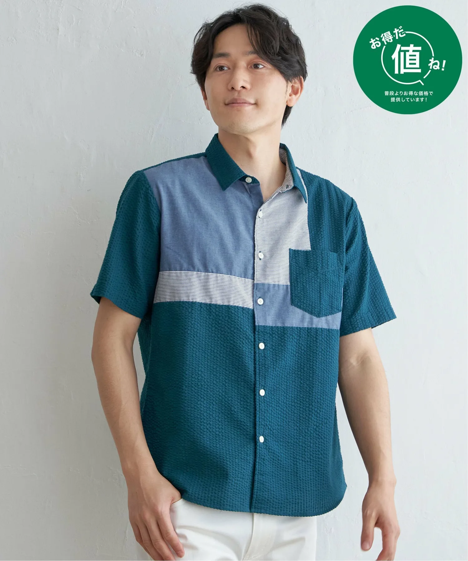 Футболка с обычным воротником и вставкой на корпусе из разных материалов.