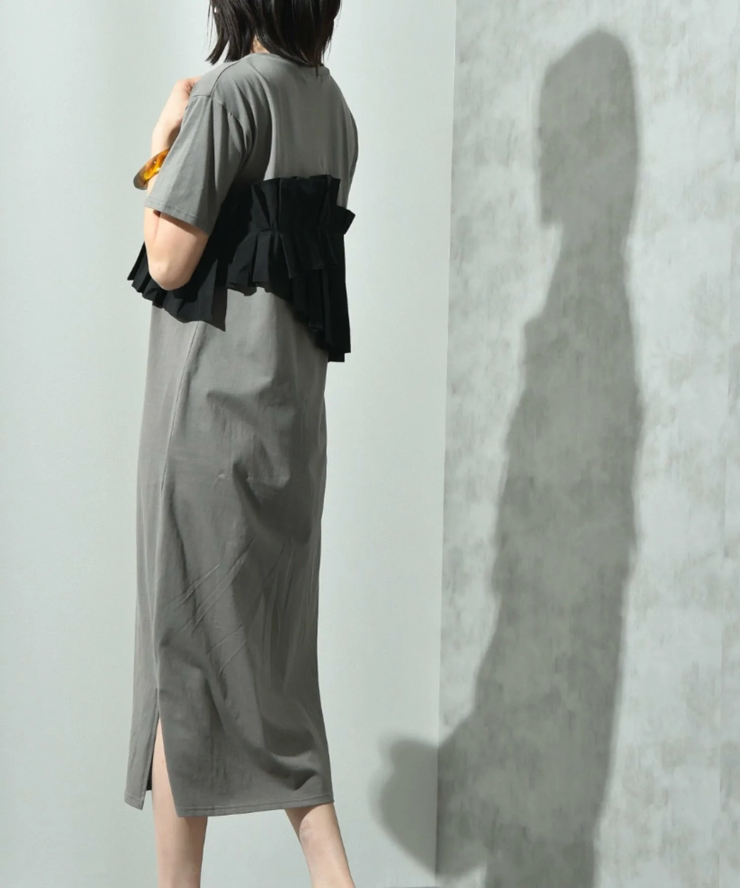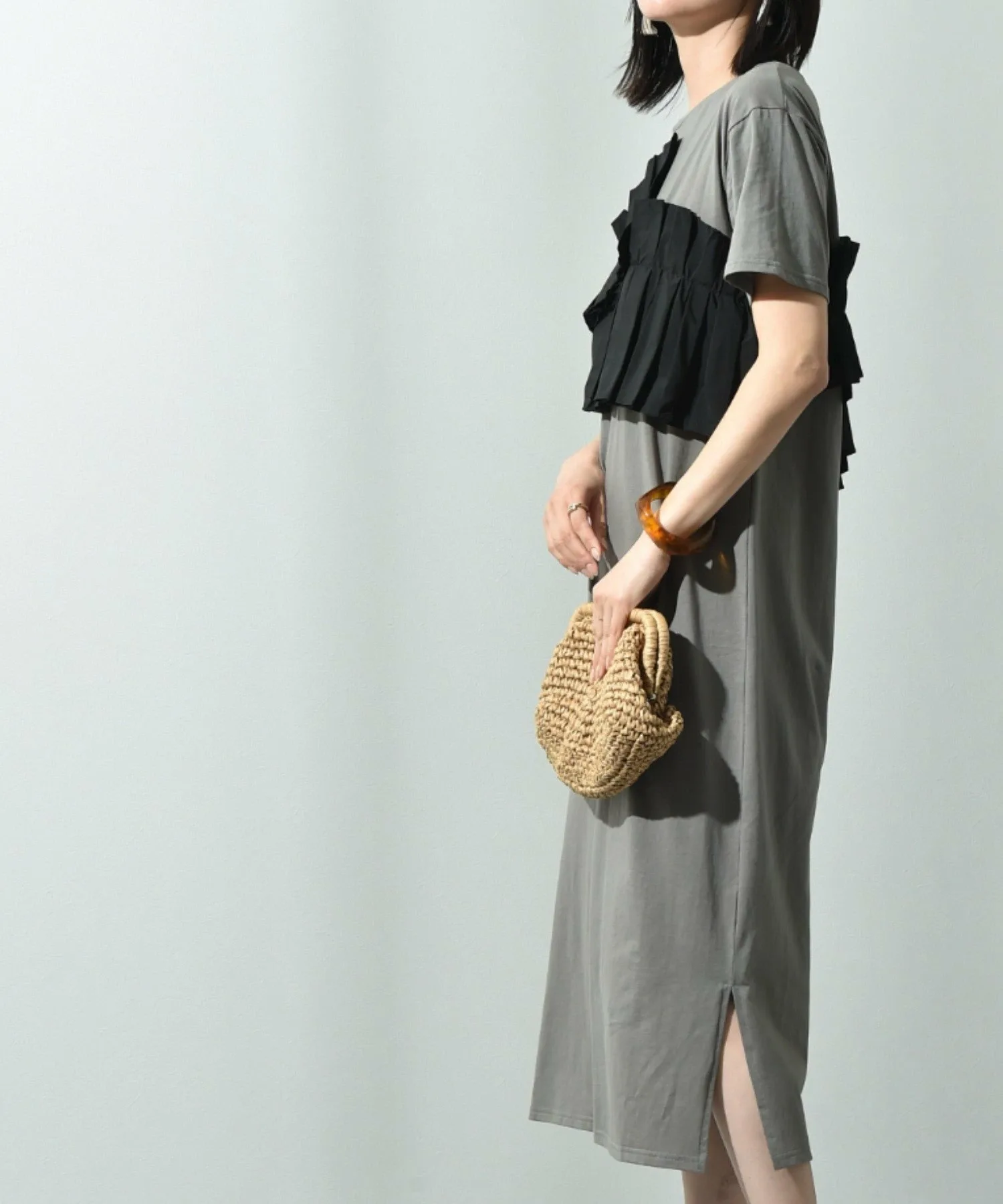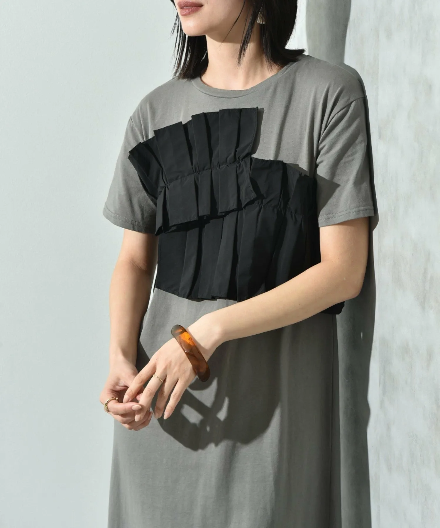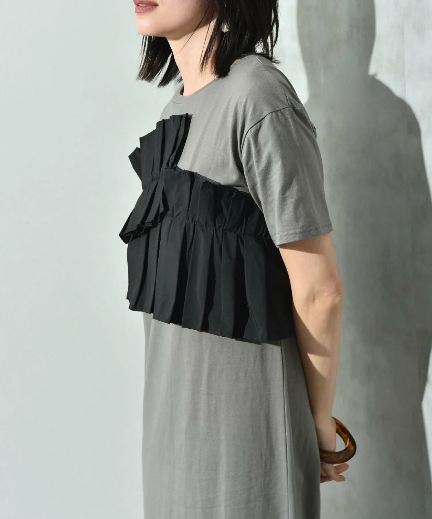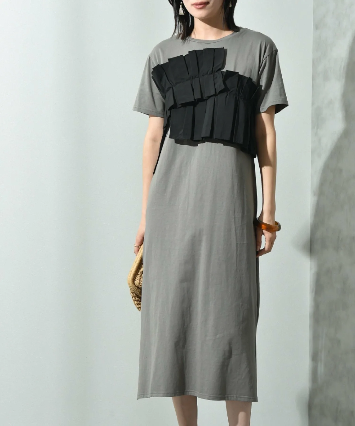 Это платье имеет свободный силуэт, который легко носить. Женственный плиссированный дизайн и использование различных материалов делают его модным даже в одиночку. Длина не слишком большая, что делает это платье рекомендуемым, поскольку оно излучает зрелую атмосферу, несмотря на свой модный дизайн. Добавьте крупное ожерелье или серьги, чтобы добавить нотку гламура. ◎