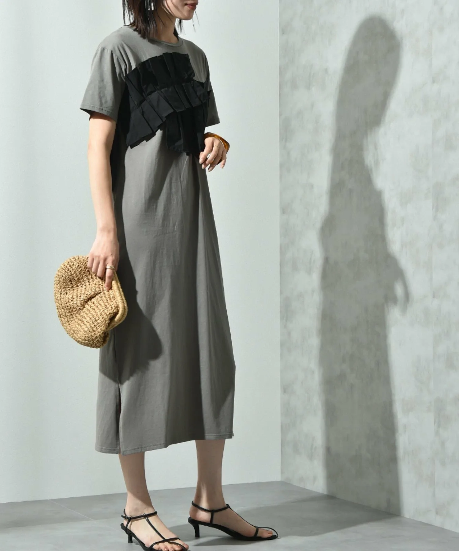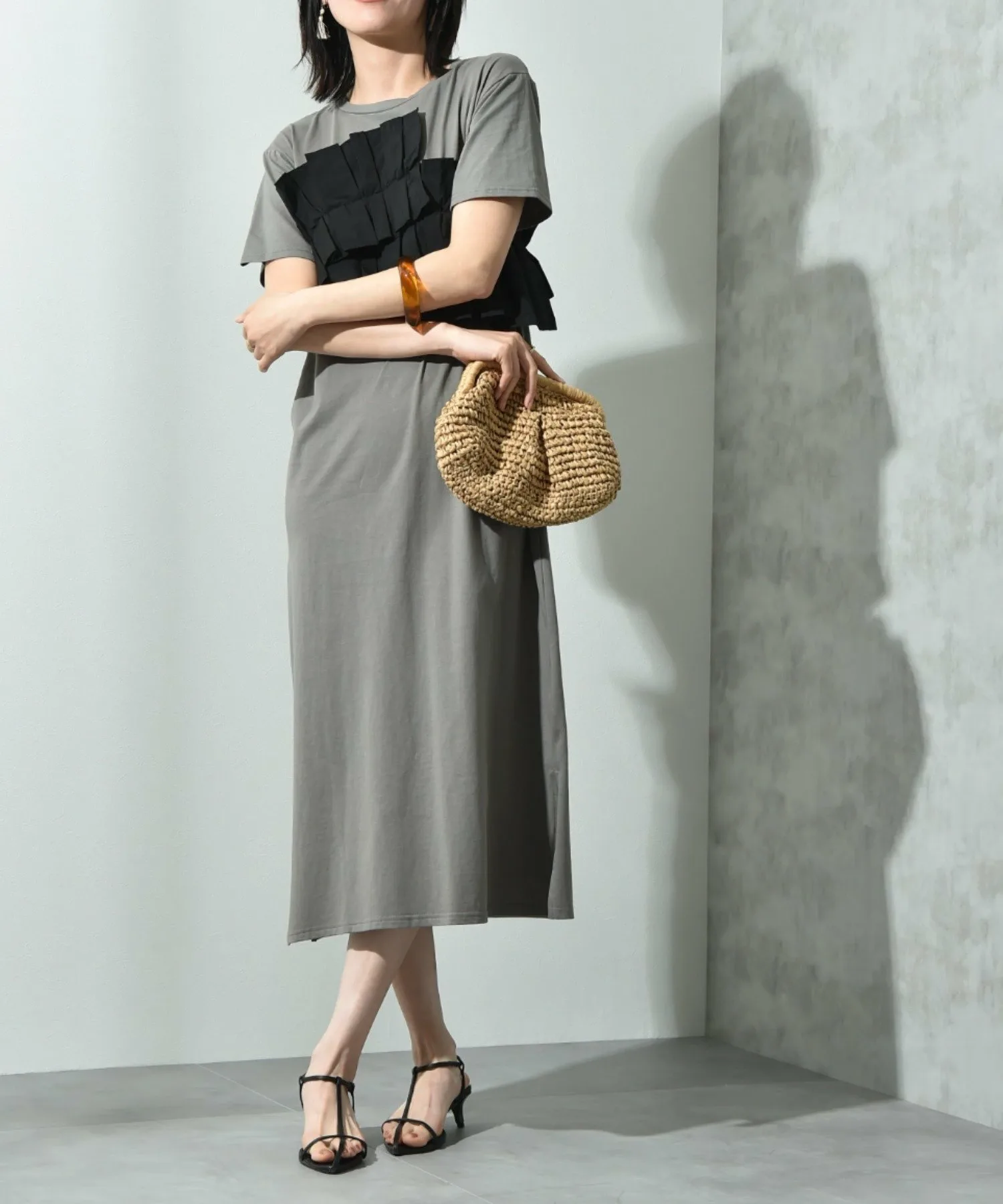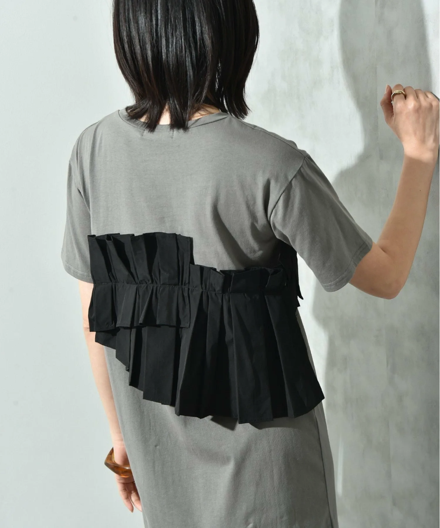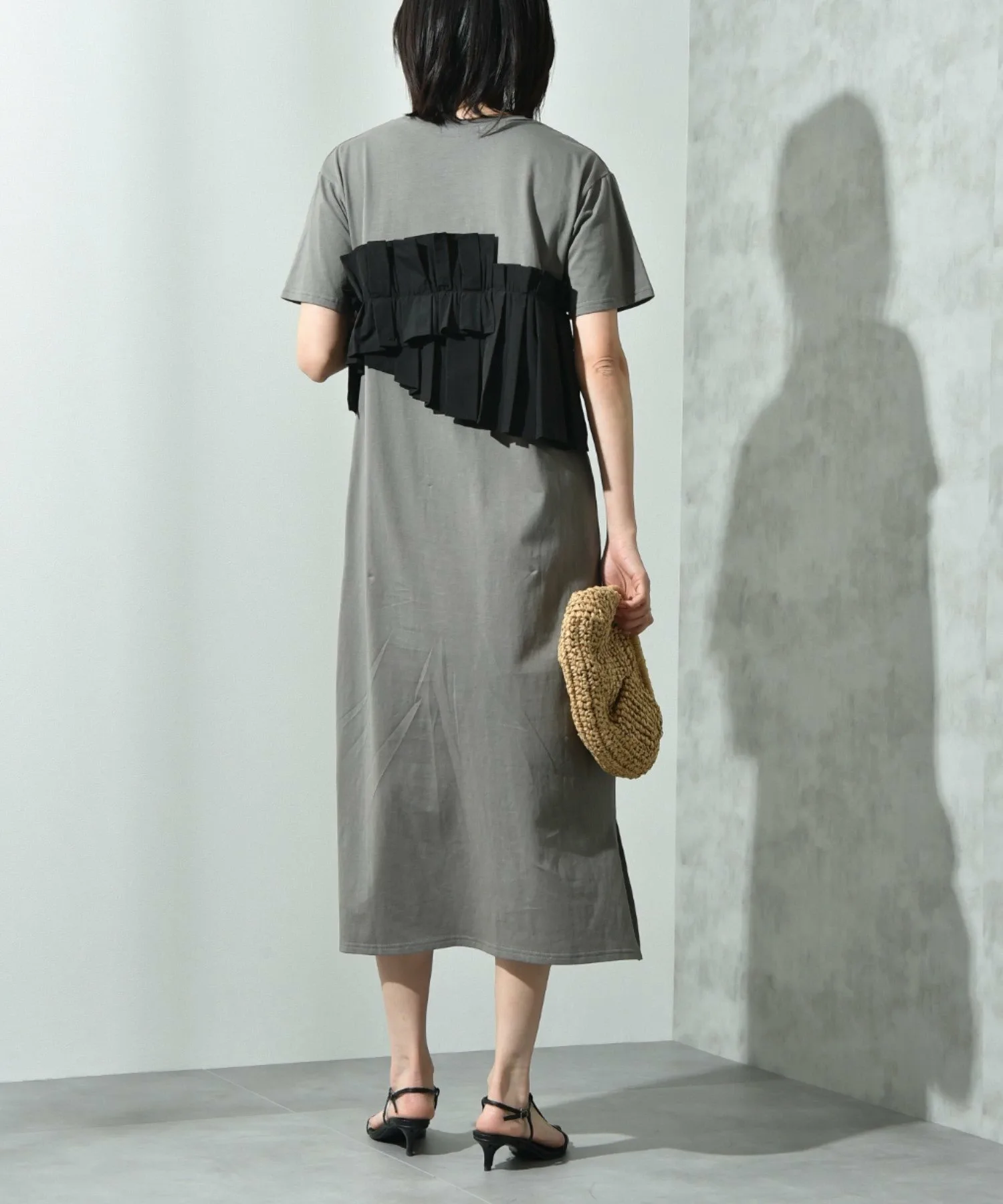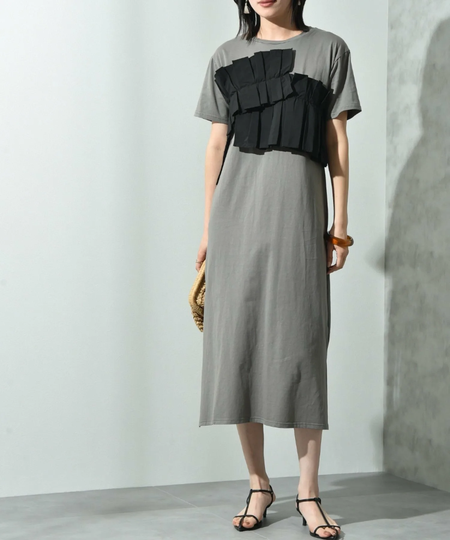 Это платье имеет свободный силуэт, который легко носить. Женственный плиссированный дизайн и использование различных материалов делают его модным даже в одиночку. Длина не слишком большая, что делает это платье рекомендуемым, поскольку оно излучает зрелую атмосферу, несмотря на свой модный дизайн. Добавьте крупное ожерелье или серьги, чтобы добавить нотку гламура. ◎