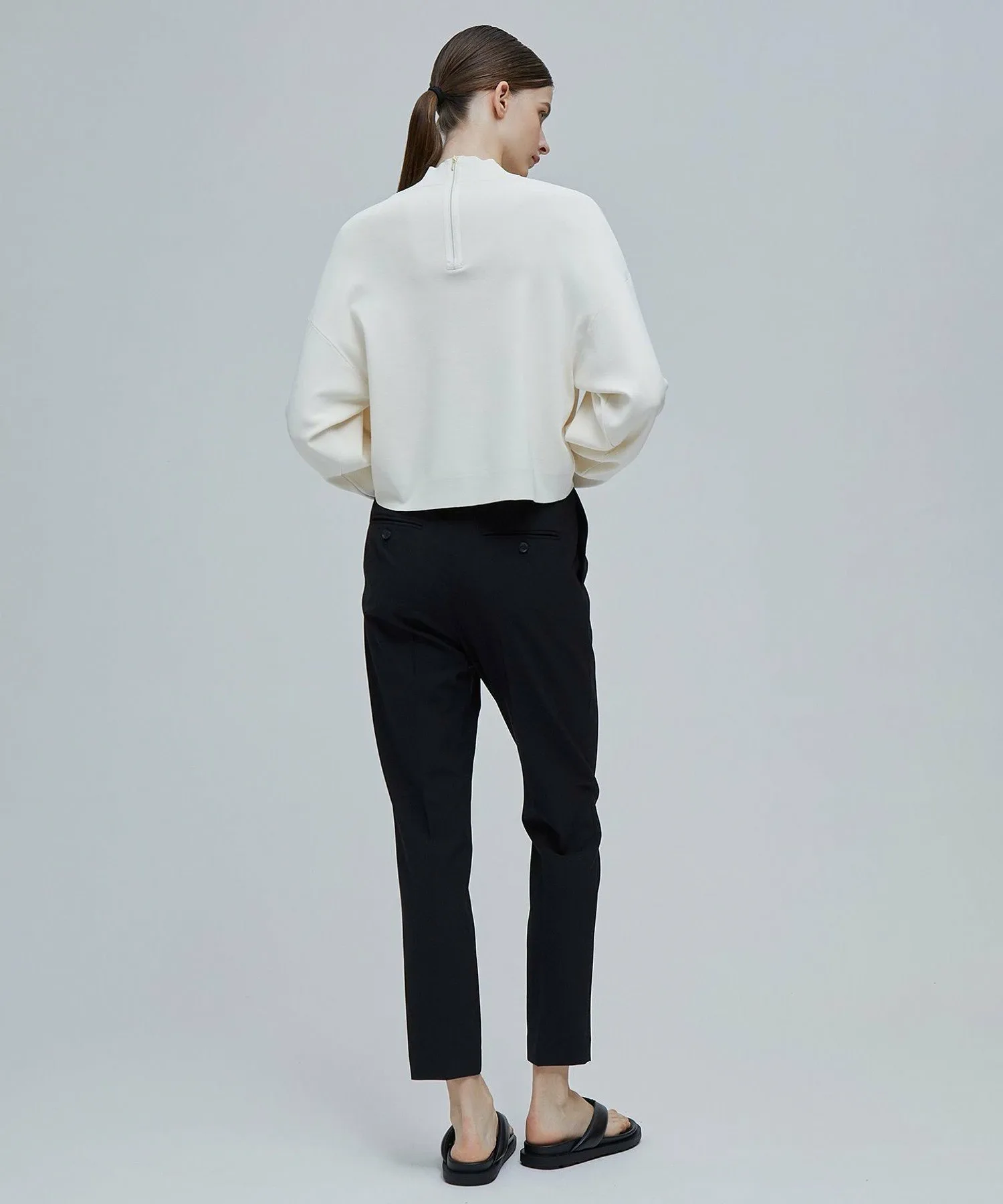 Легкий, эластичный в двух направлениях материал, удобный в носке. Несмотря на то, что он изготовлен из шерсти, он обладает шелковистым блеском, плотностью и мягкостью, приятной на ощупь текстурой. Его можно стирать дома, он обладает отличной эластичностью и приятной на ощупь гладкостью. Только брюки цвета экрю (цвет 002) имеют подкладку.