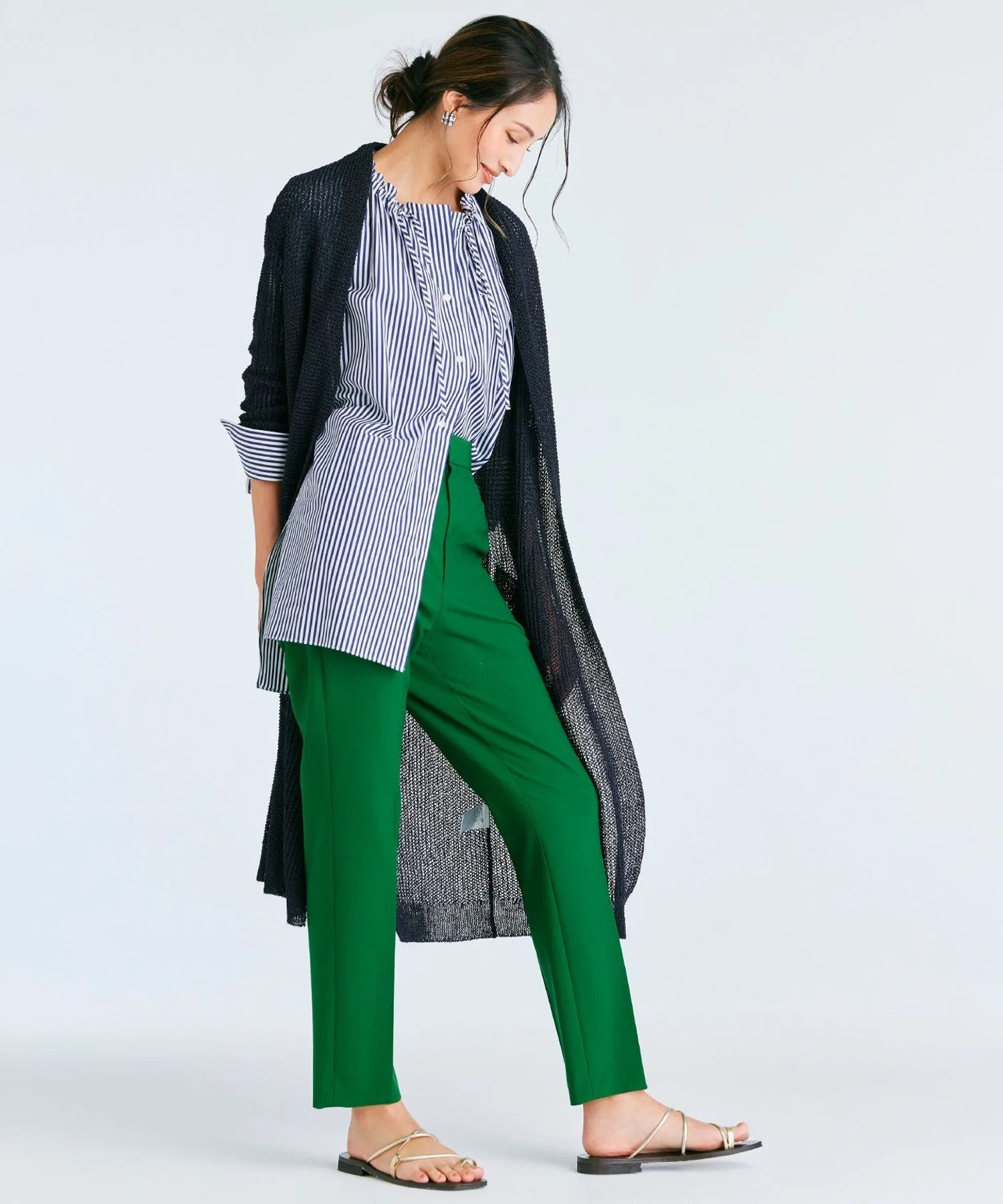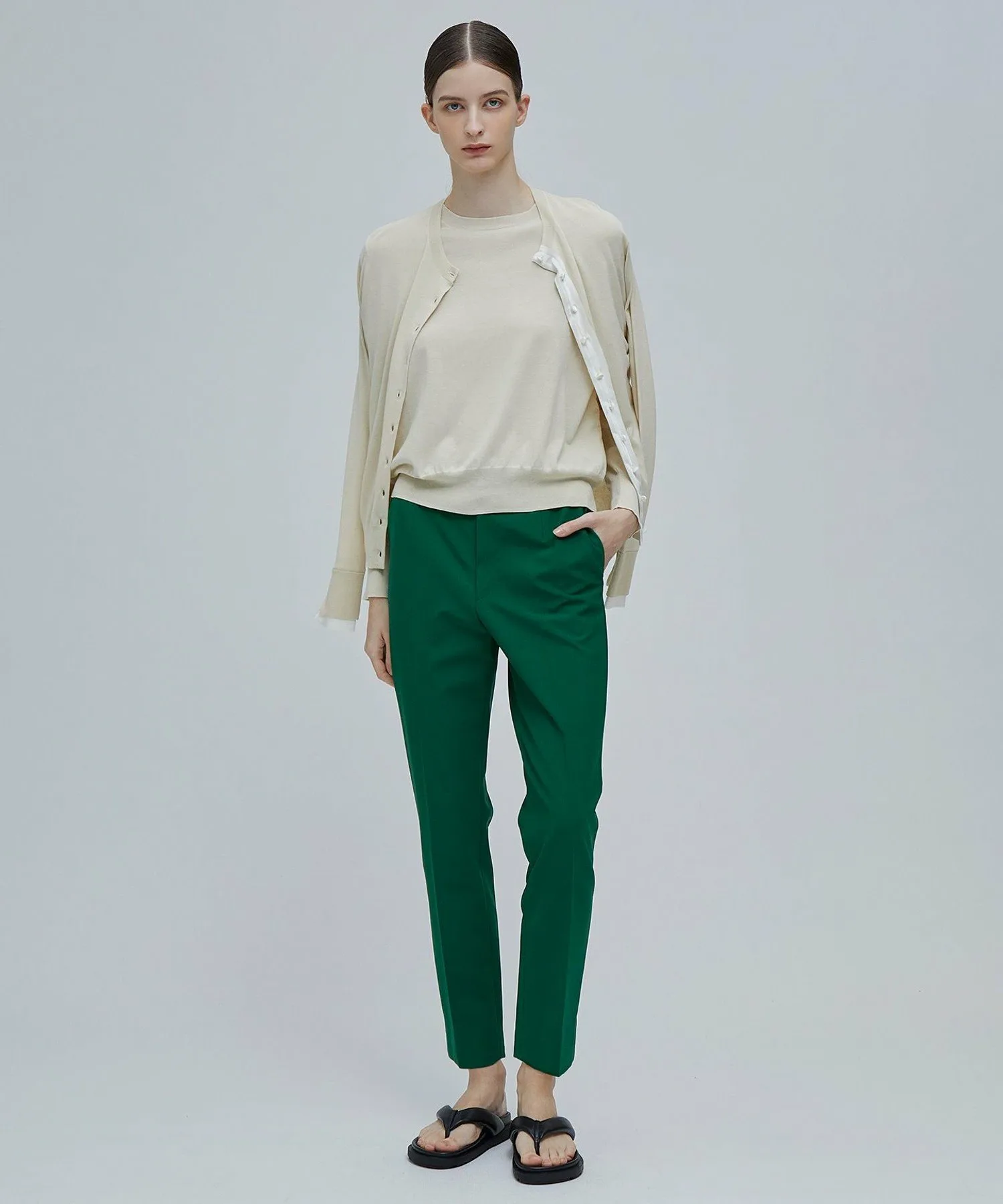 Легкий, эластичный в двух направлениях материал, удобный в носке. Несмотря на то, что он изготовлен из шерсти, он обладает шелковистым блеском, плотностью и мягкостью, приятной на ощупь текстурой. Его можно стирать дома, он обладает отличной эластичностью и приятной на ощупь гладкостью. Только брюки цвета экрю (цвет 002) имеют подкладку.