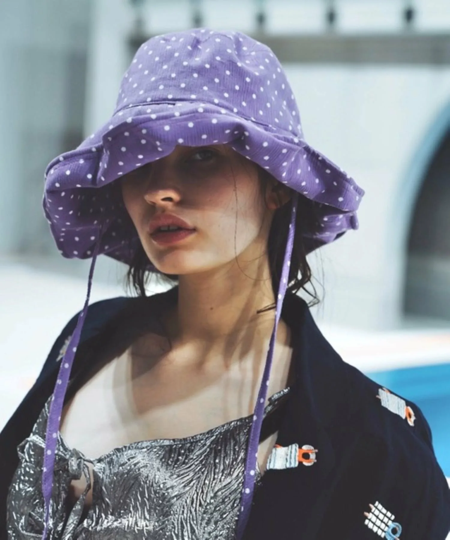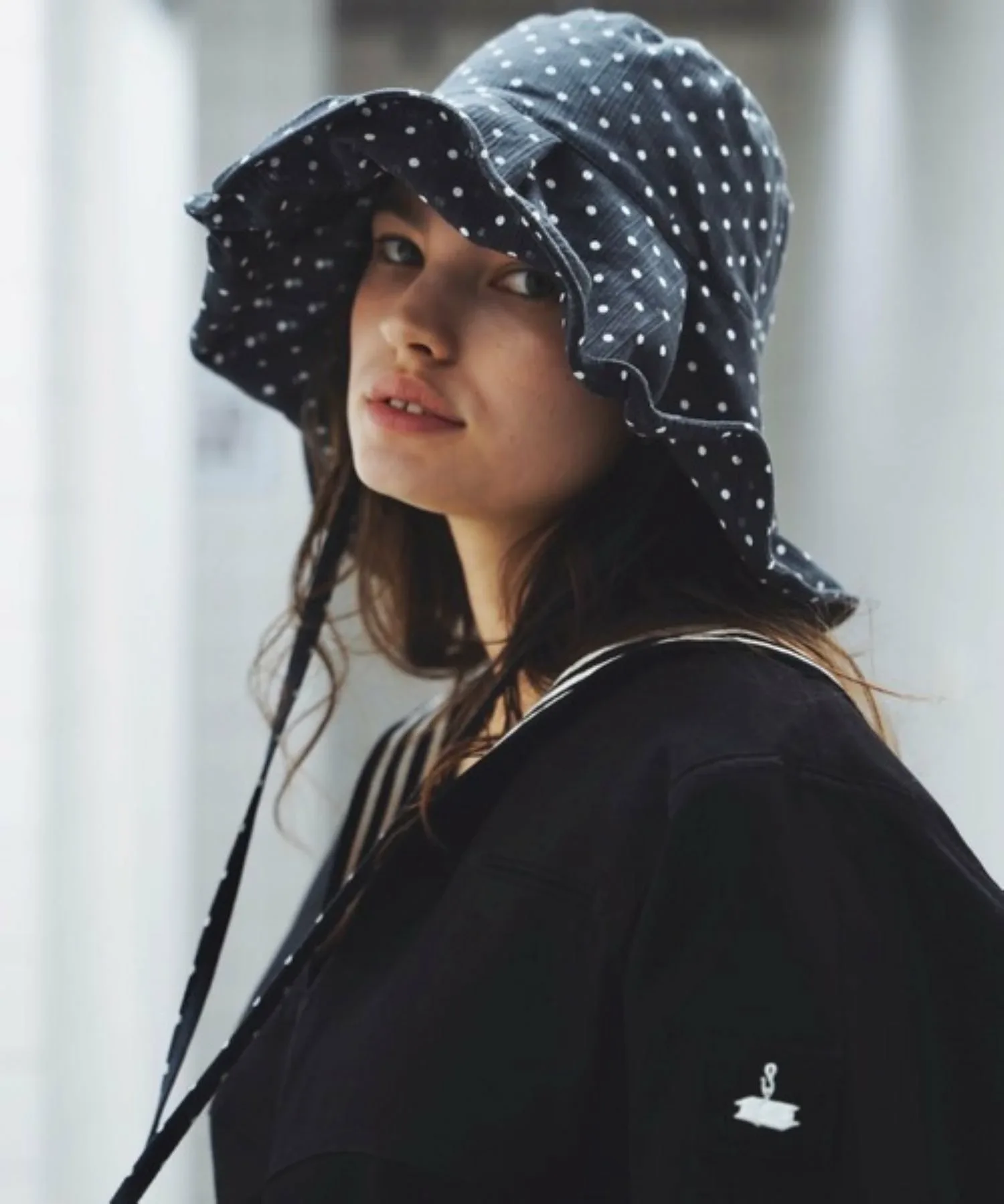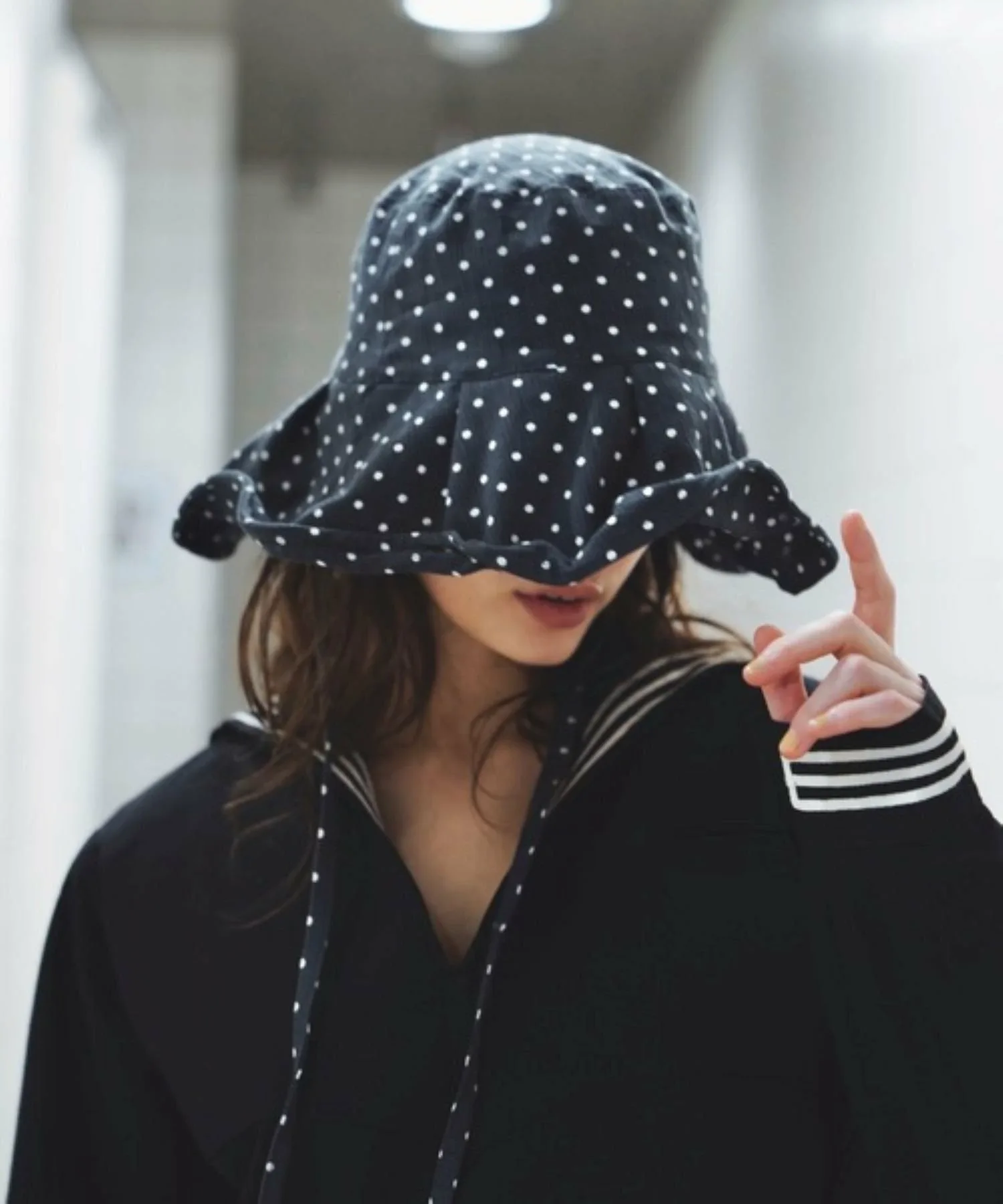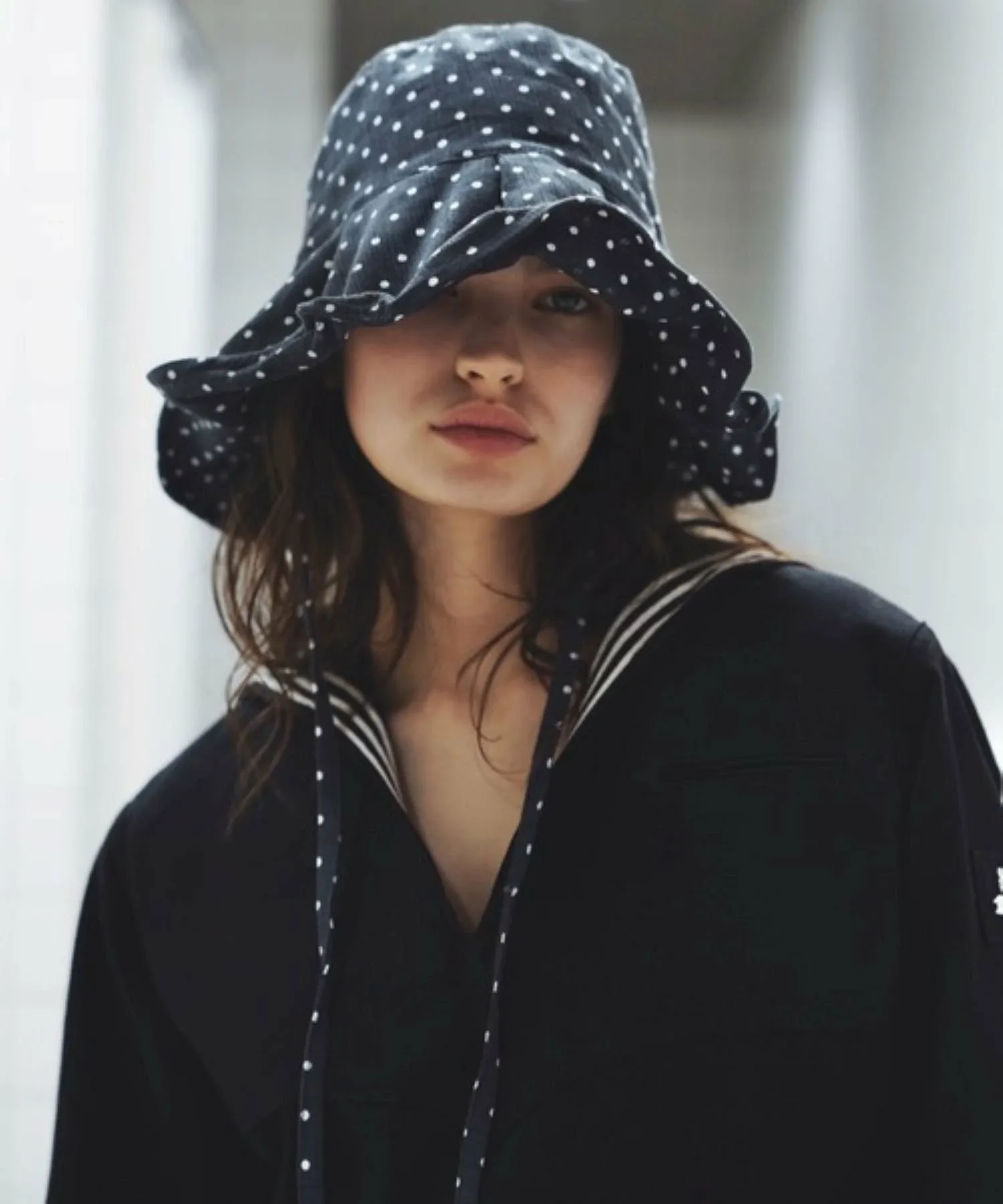Эта солнцезащитная шляпа в горошек изготовлена из традиционной японской ткани «Такасима чидзими», которая обеспечивает ощущение прохлады.