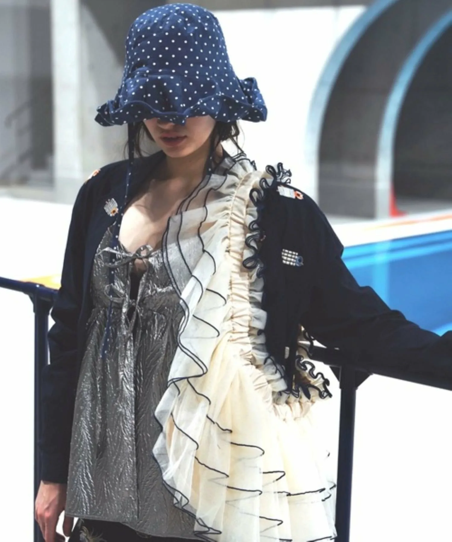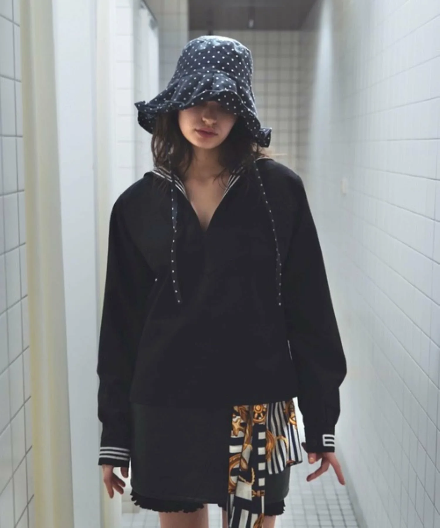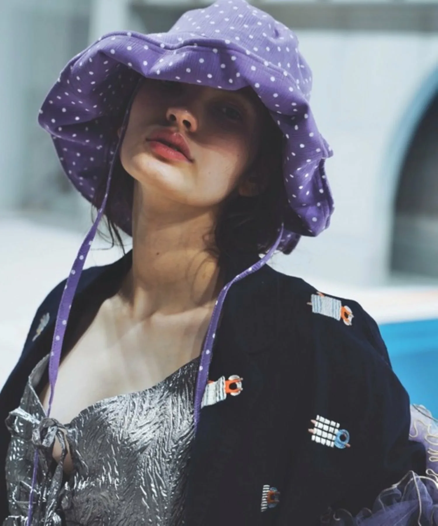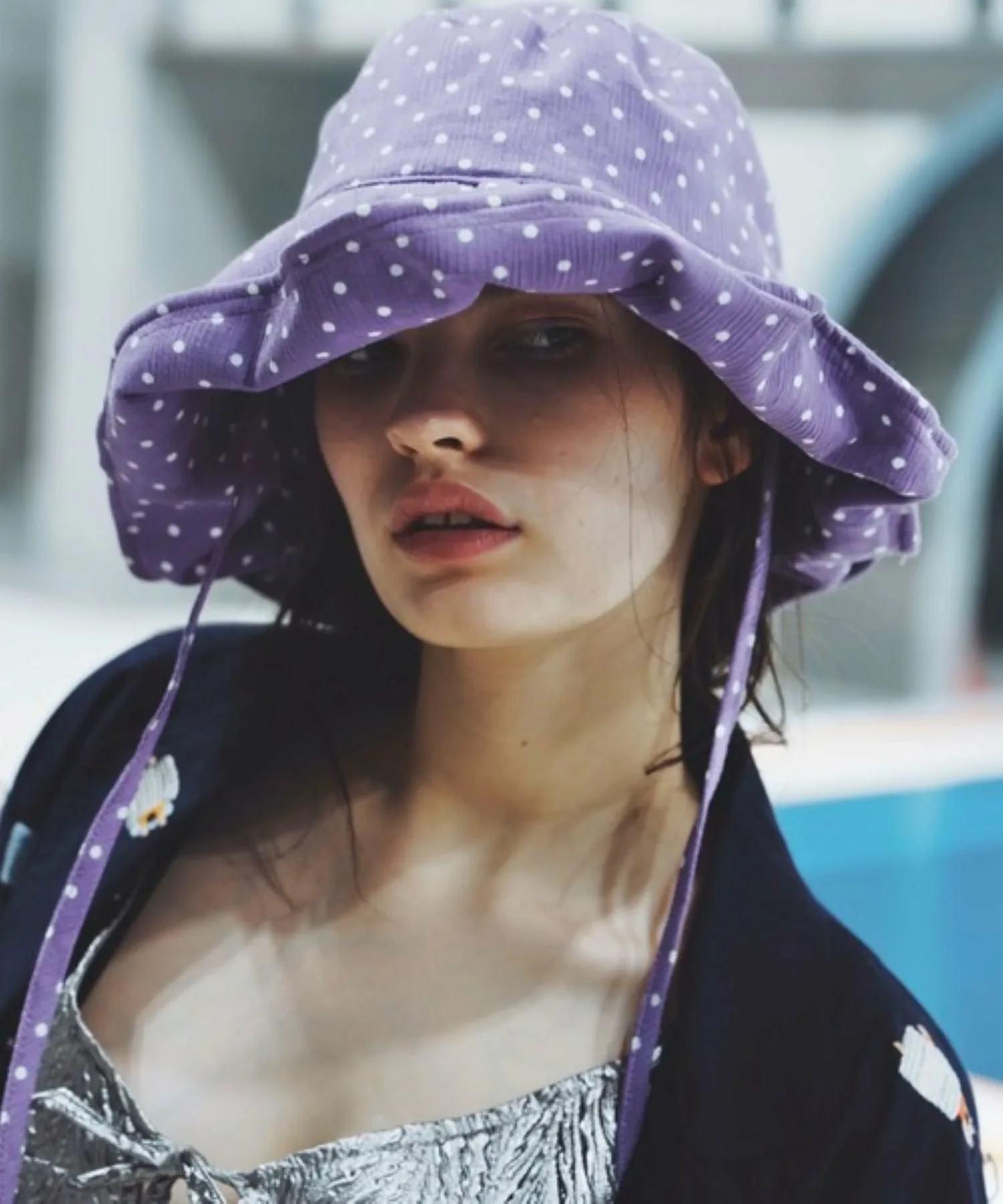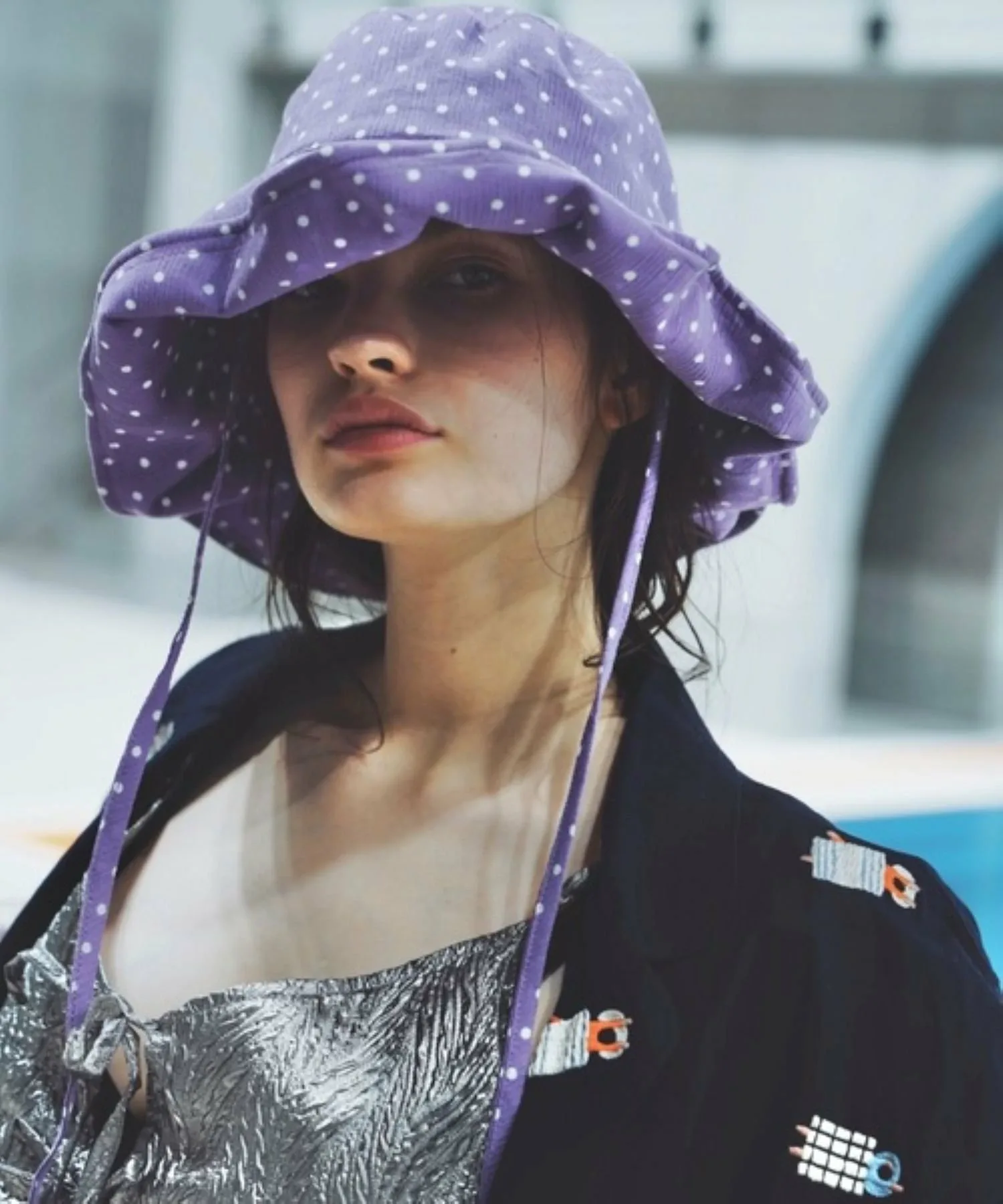 Эта солнцезащитная шляпа в горошек изготовлена из традиционной японской ткани «Такасима чидзими», которая обеспечивает ощущение прохлады.