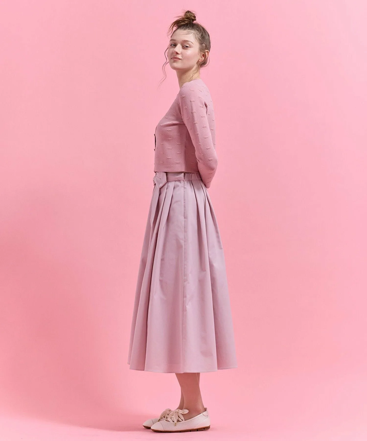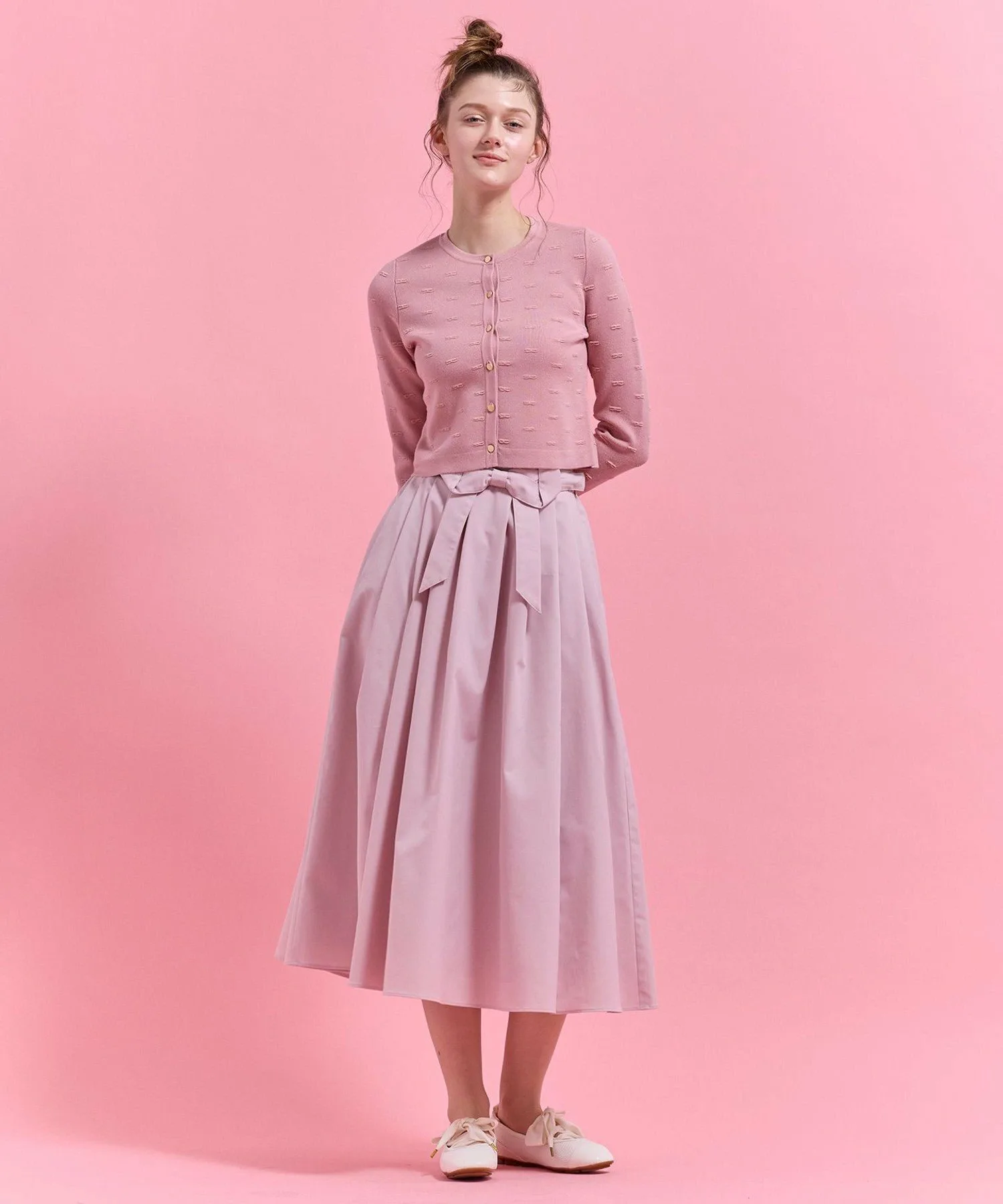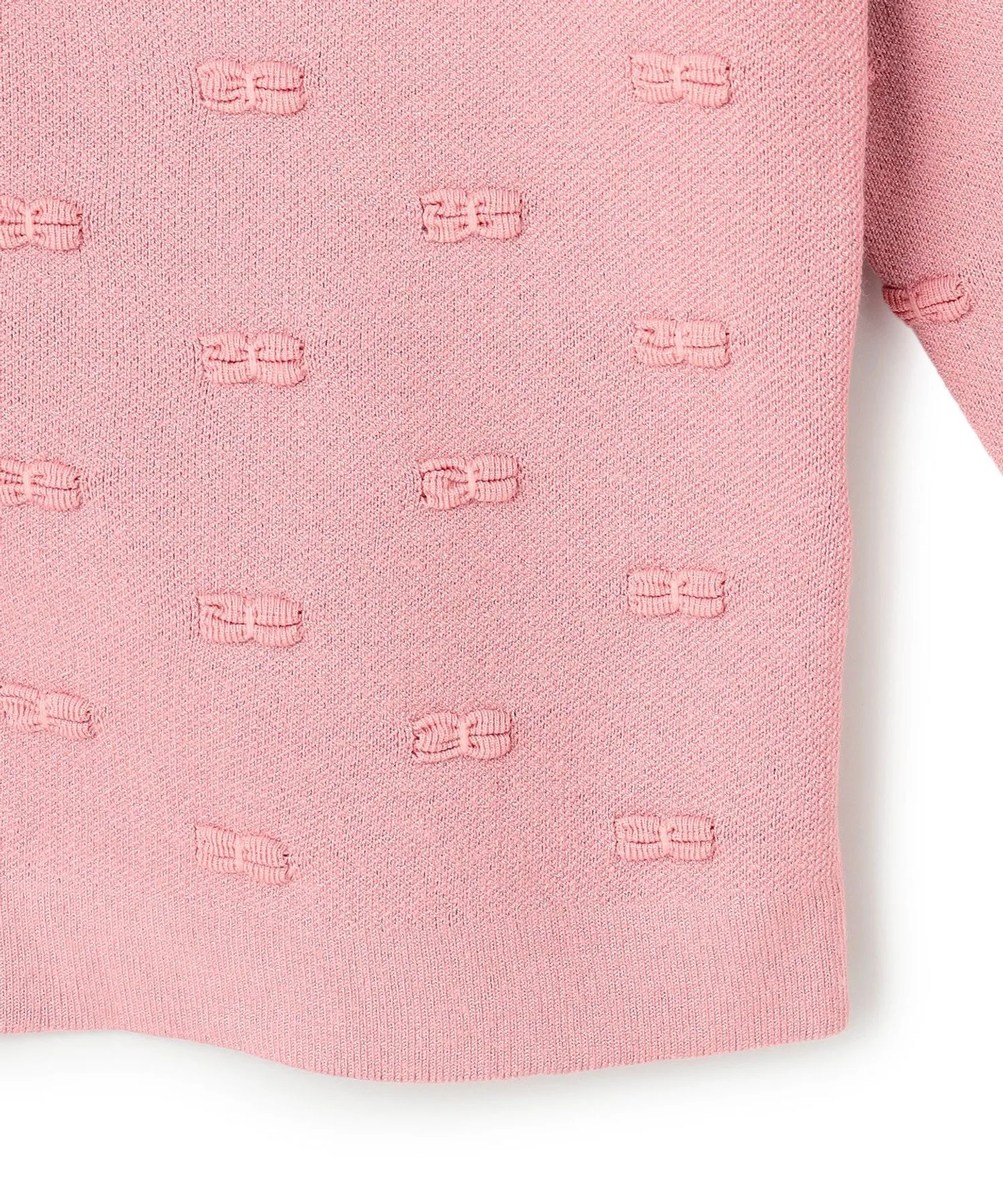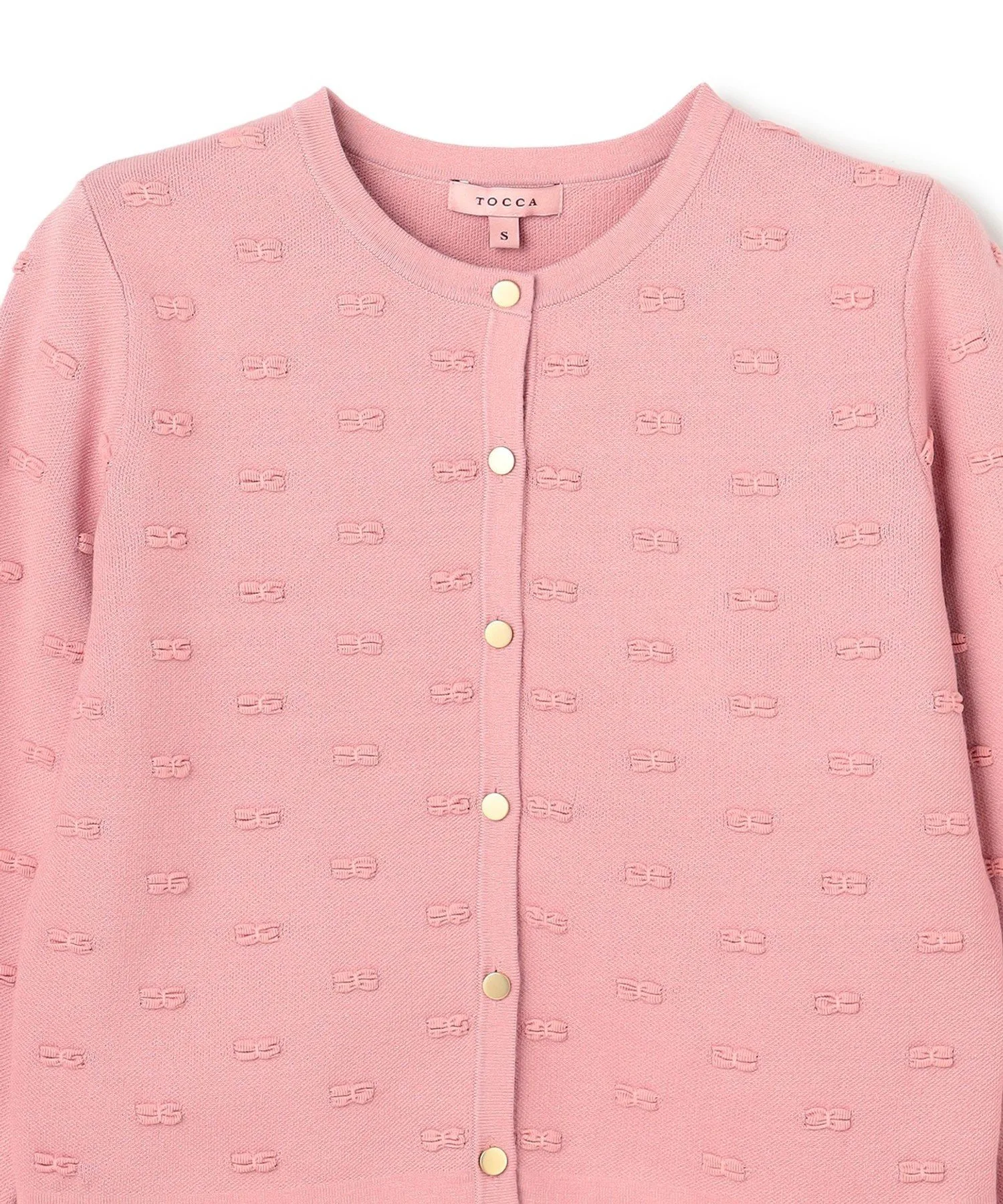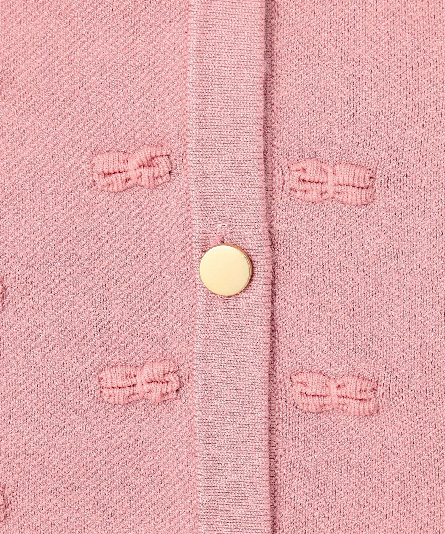 Игривый, привлекательный кардиган с ленточным мотивом по всей поверхности. Простой круглый вырез и золотые пуговицы спереди придают ему классический вид.