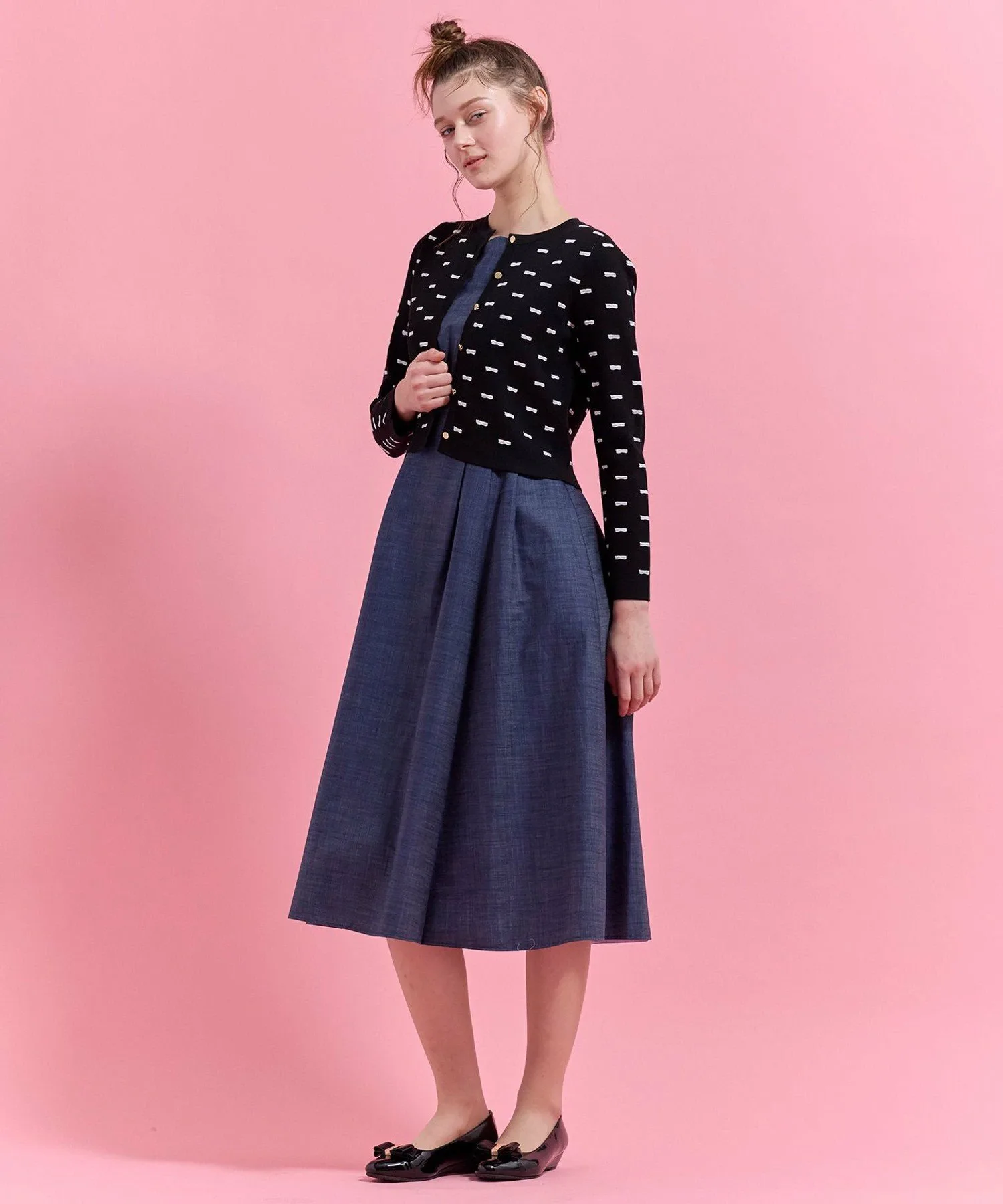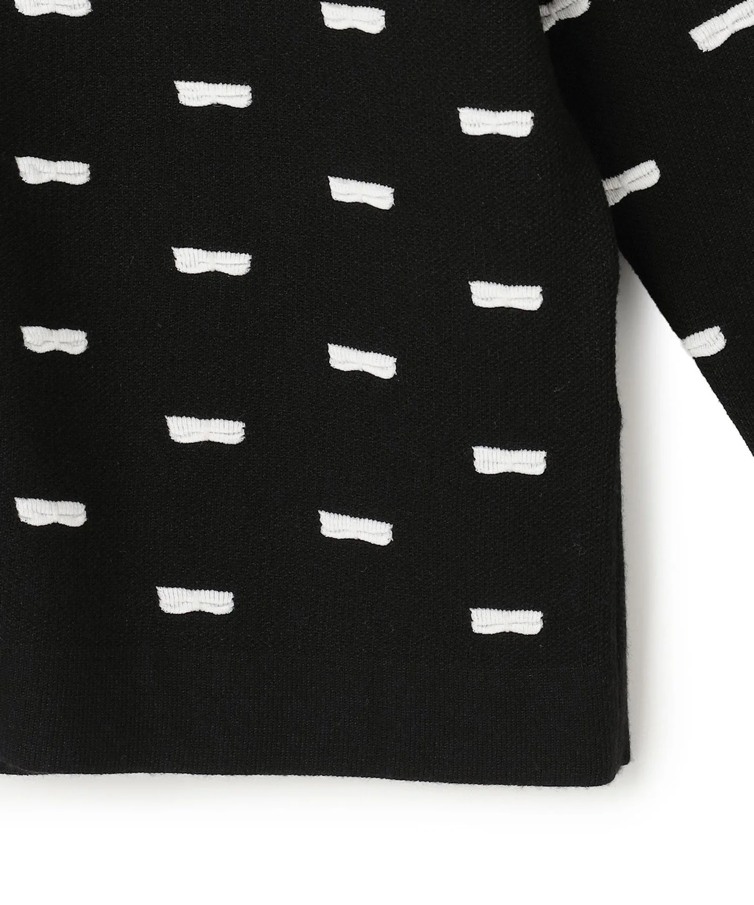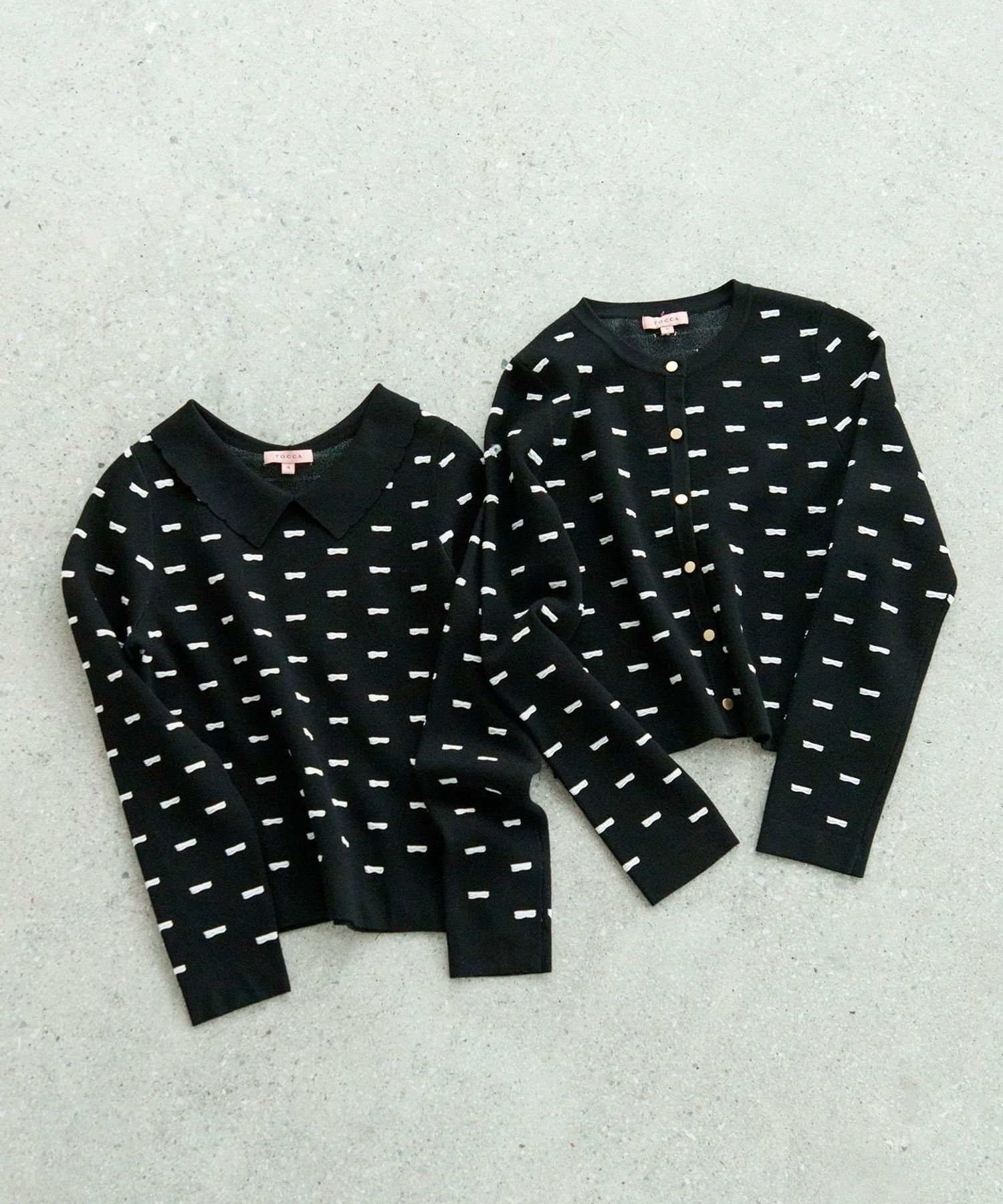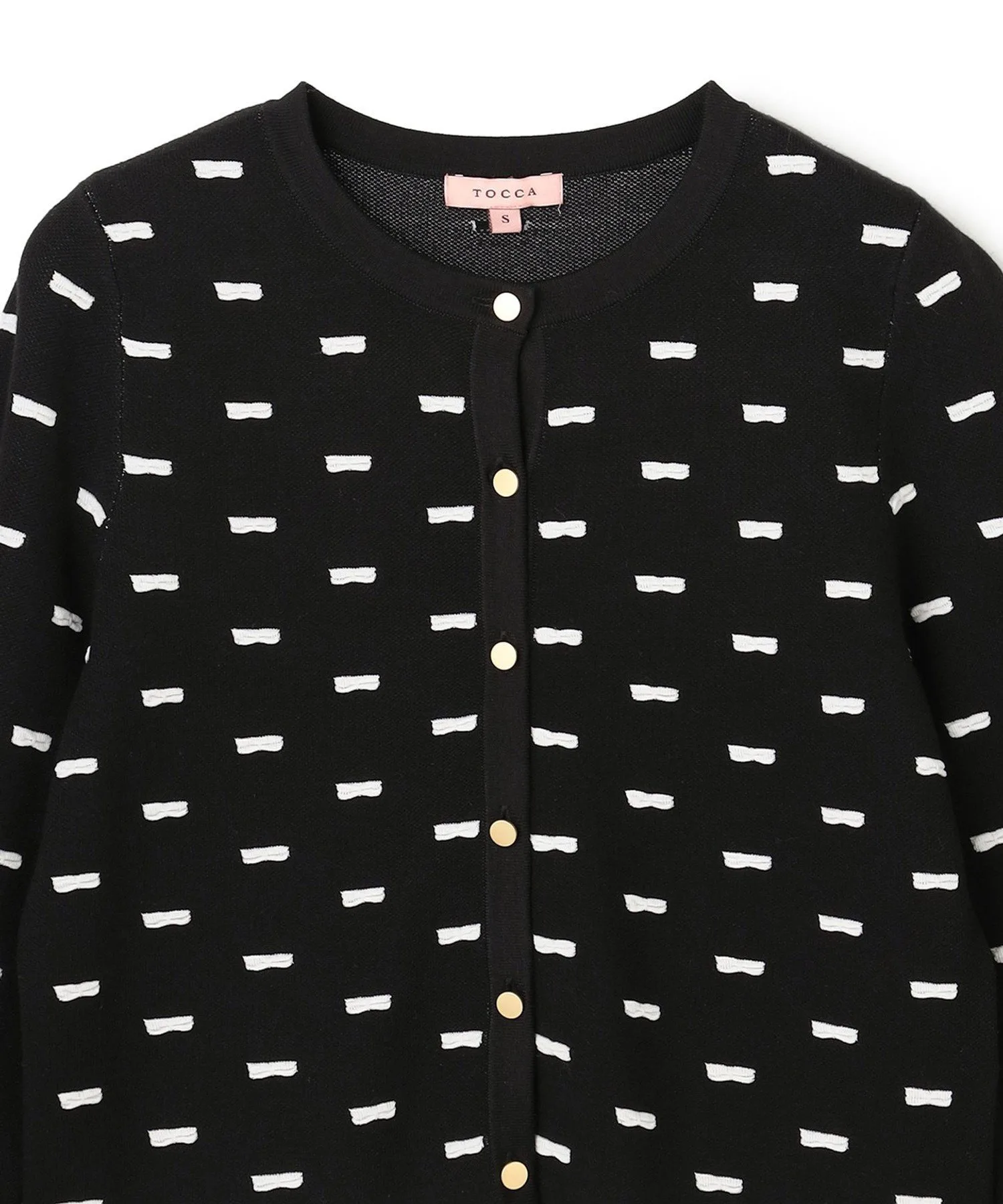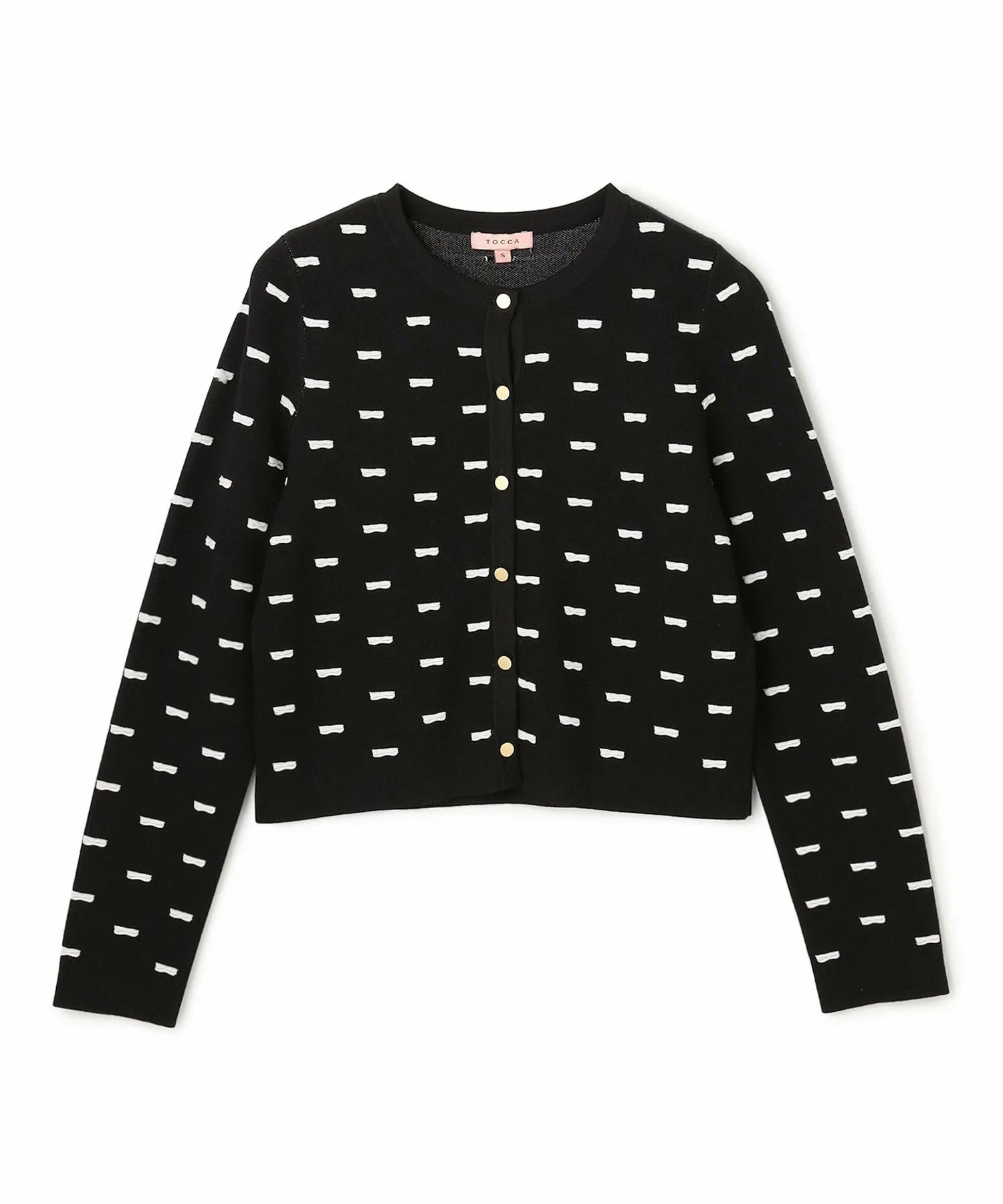 Игривый, привлекательный кардиган с ленточным мотивом по всей поверхности. Простой круглый вырез и золотые пуговицы спереди придают ему классический вид.