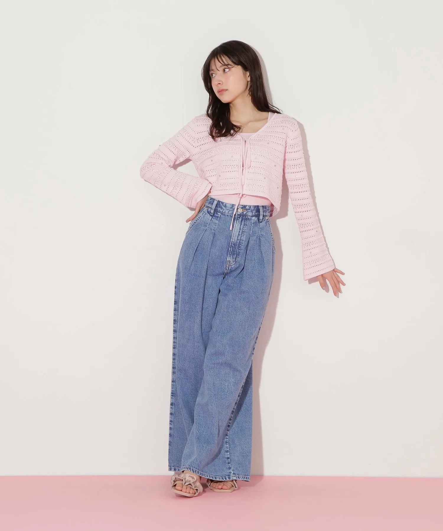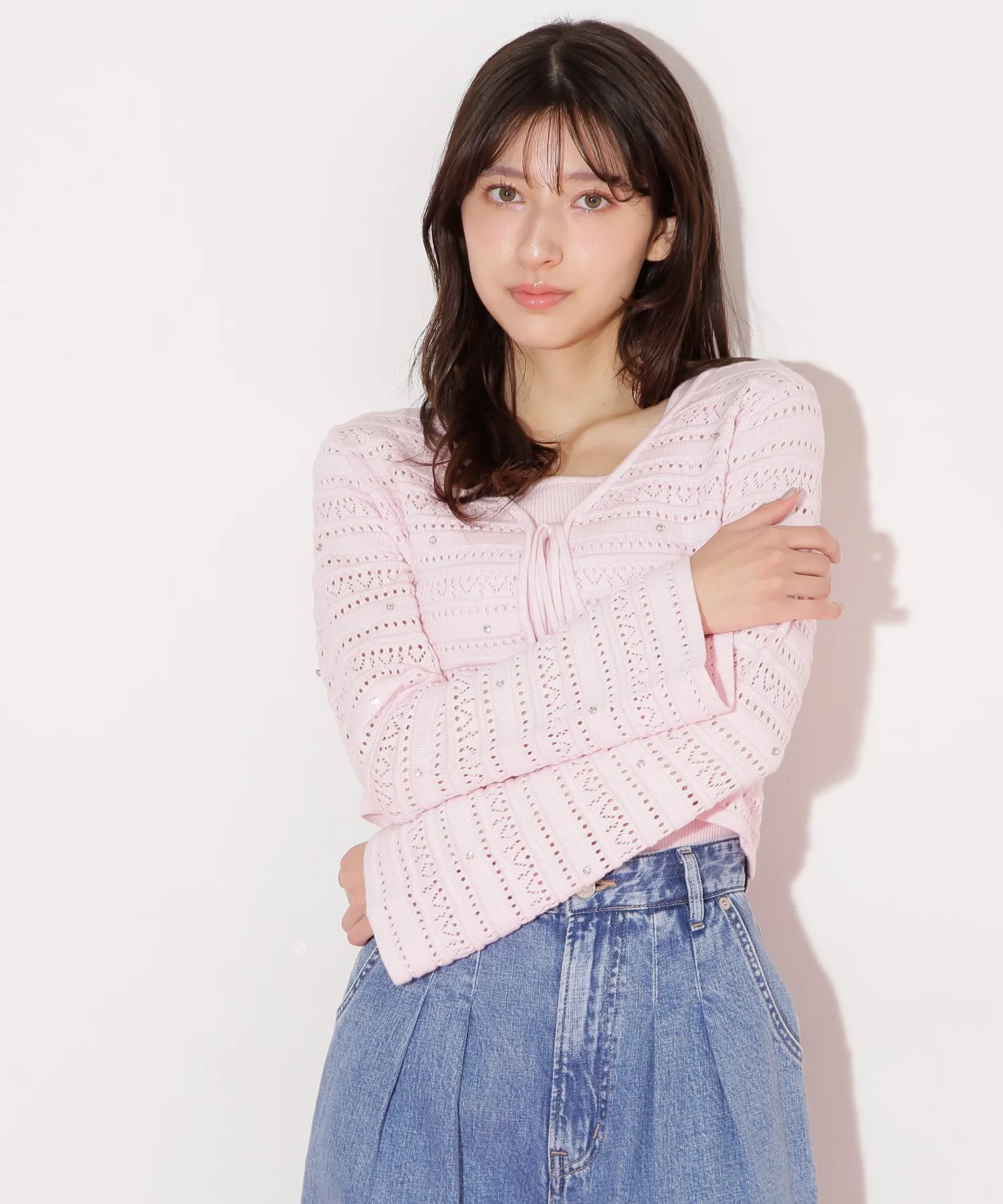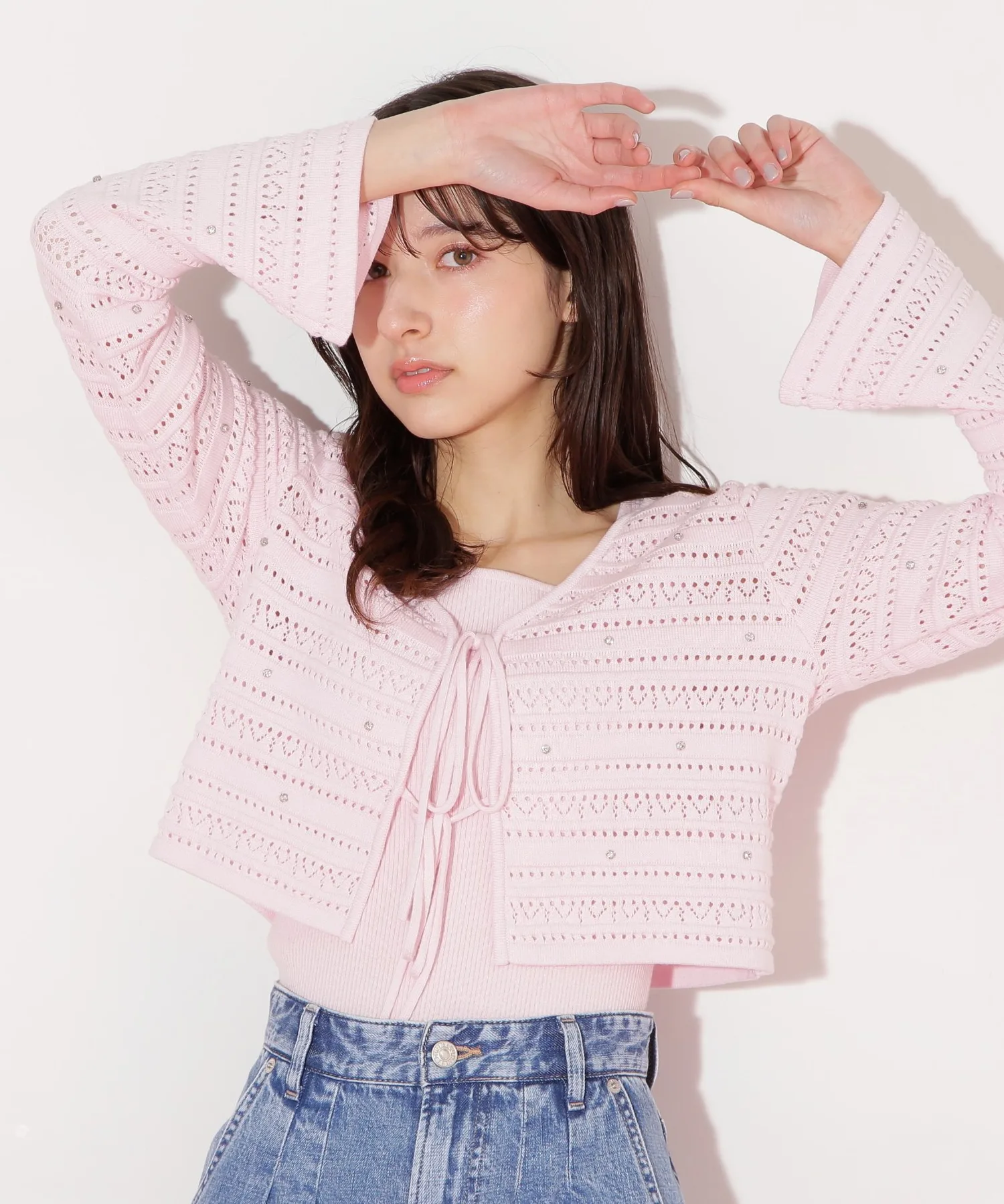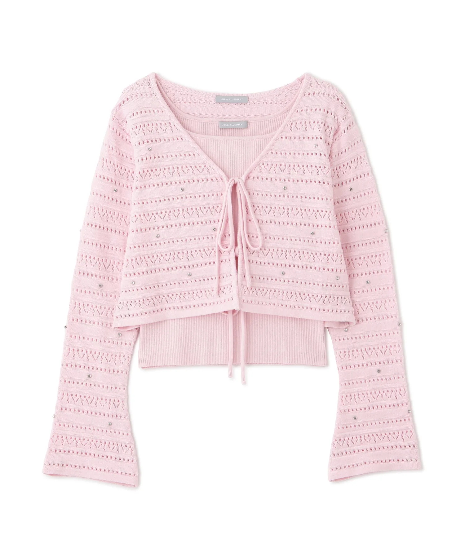 Этот комплект из кардигана и майки украшен лентой спереди. Нежная ажурная вязка дополнена деталями, напоминающими драгоценные камни, что добавляет гламура и элегантности. Умеренная прозрачность создает легкий, женственный образ. Их можно носить как стильный комплект, так и по отдельности. Этот универсальный комплект создает утонченный, девичий образ и рекомендуется для сочетания с джинсами или юбкой. *Цвета могут выглядеть по-разному в зависимости от условий освещения во время фотосъемки.