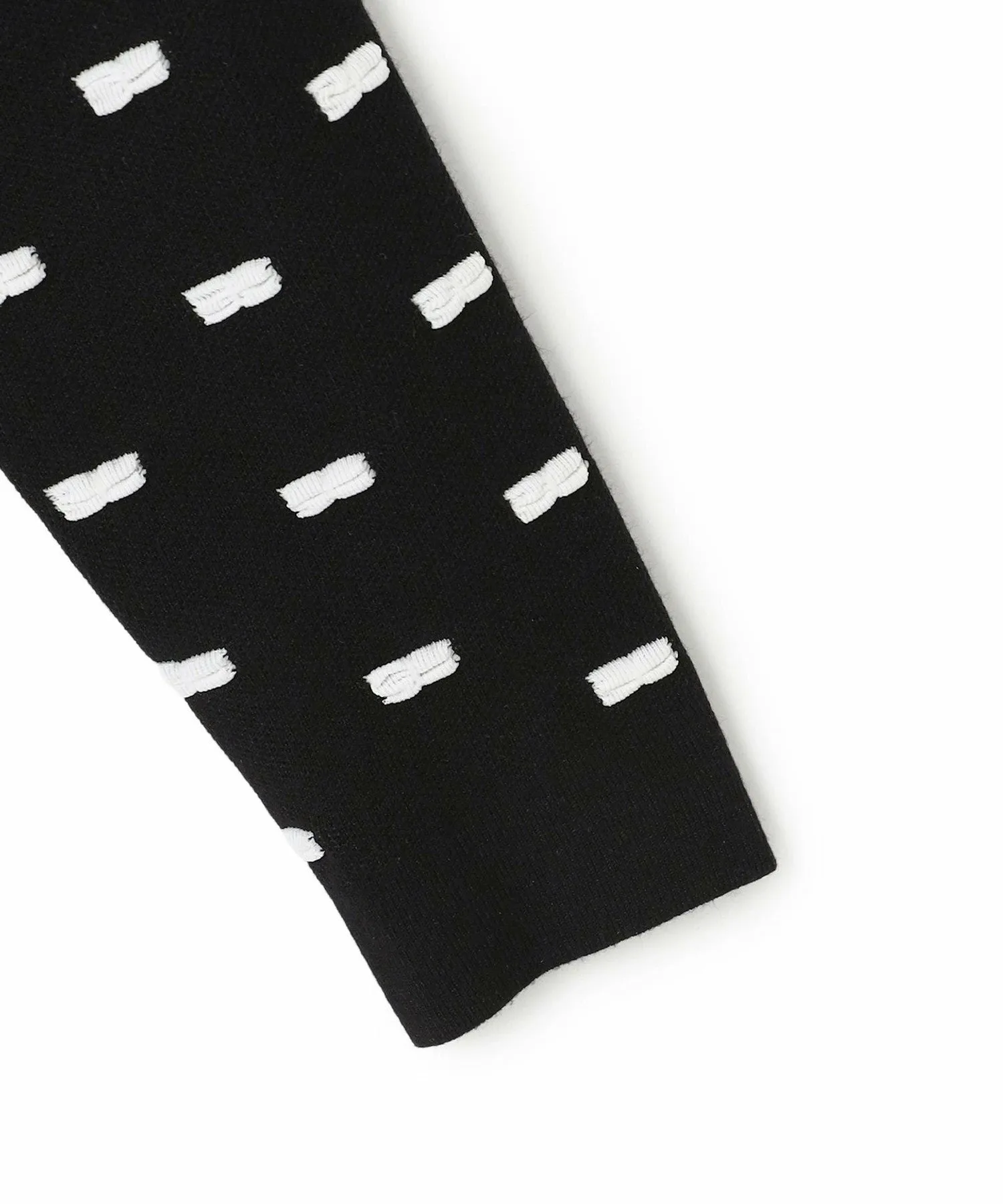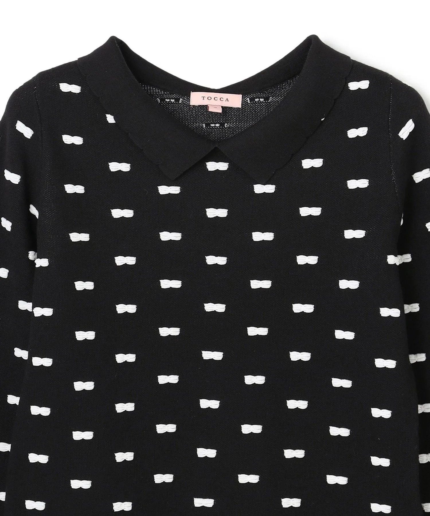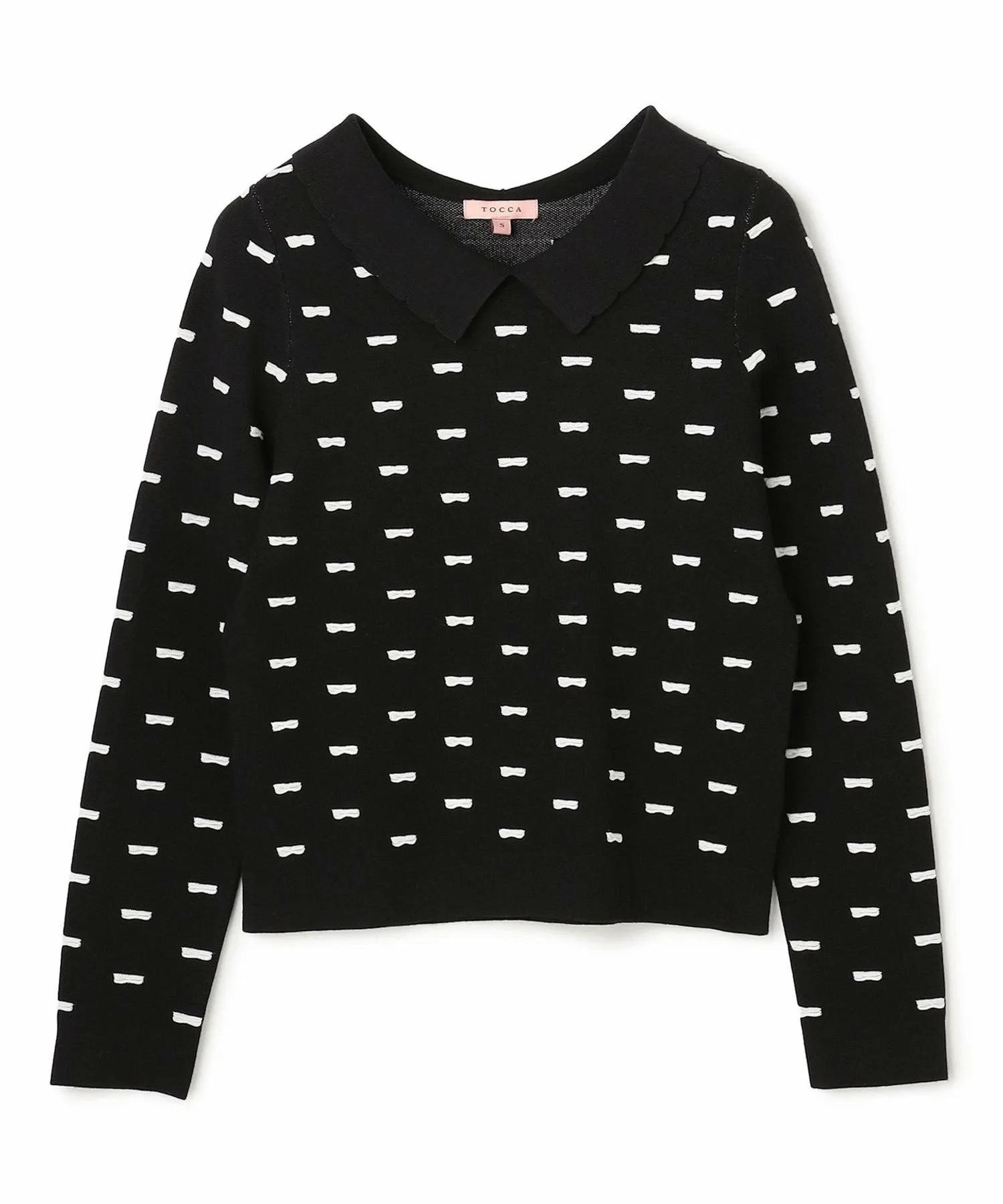 Этот пуловер украшен эффектным жаккардовым узором, напоминающим ряд маленьких ленточных мотивов. Его компактный силуэт и воротник добавляют элегантности и очарования. Тонкие линии на воротнике придают изделию нотку гламура. Этот топ — эффектная вещь, которая превратит простые брюки в милый образ в стиле TOCCA. Кардиган также доступен из того же материала.