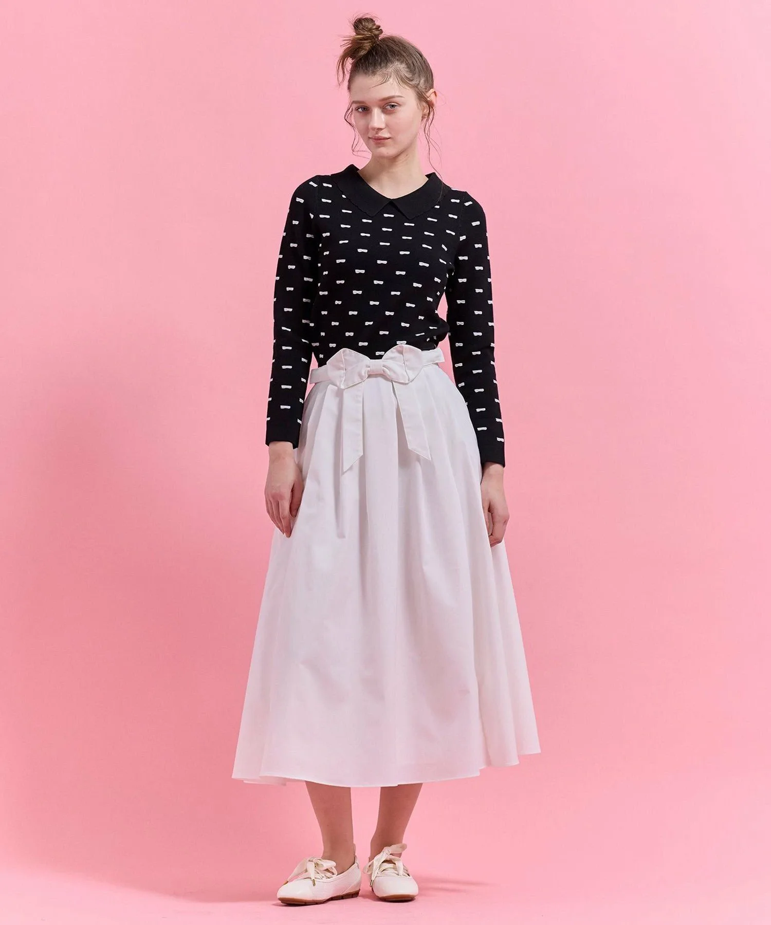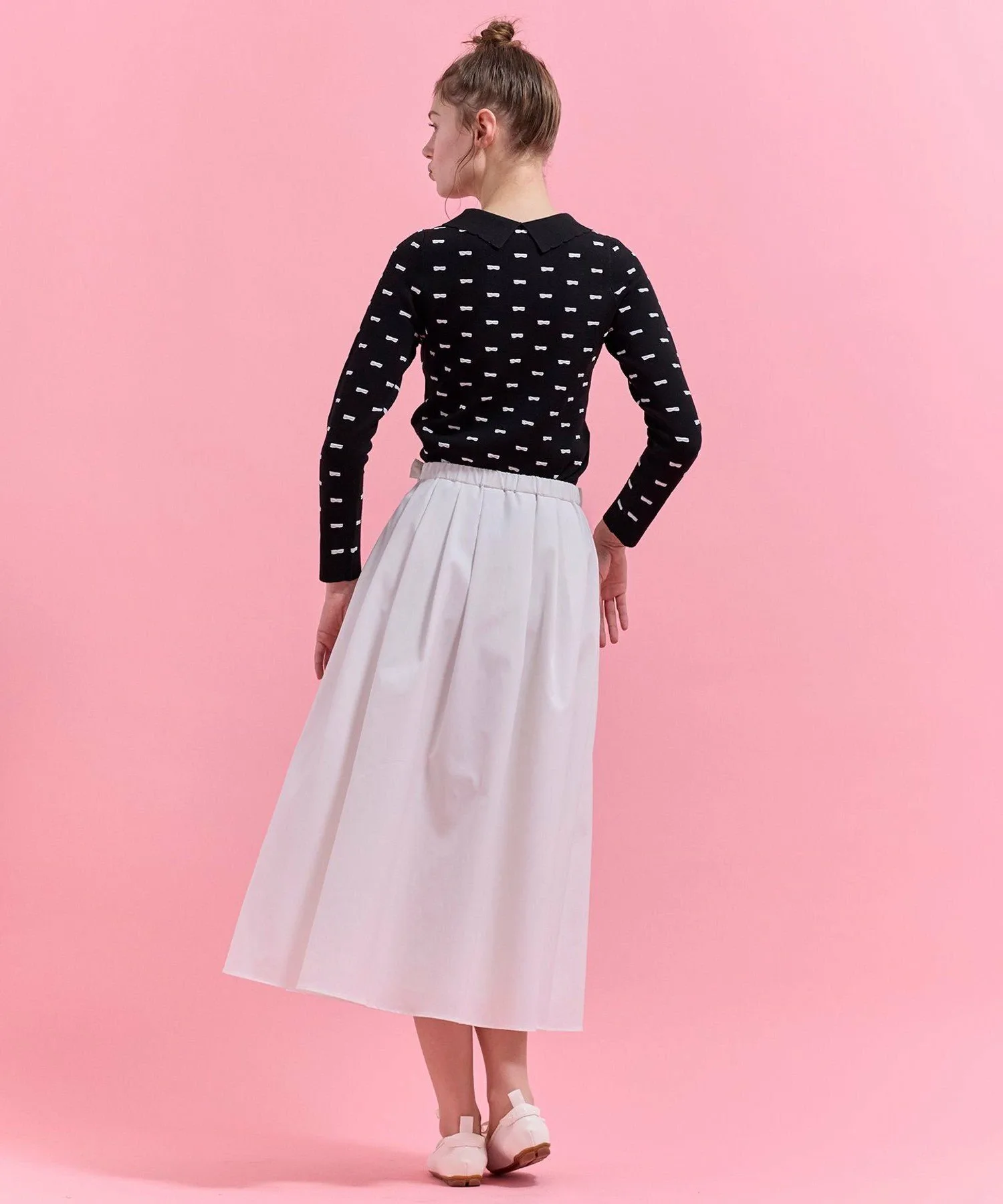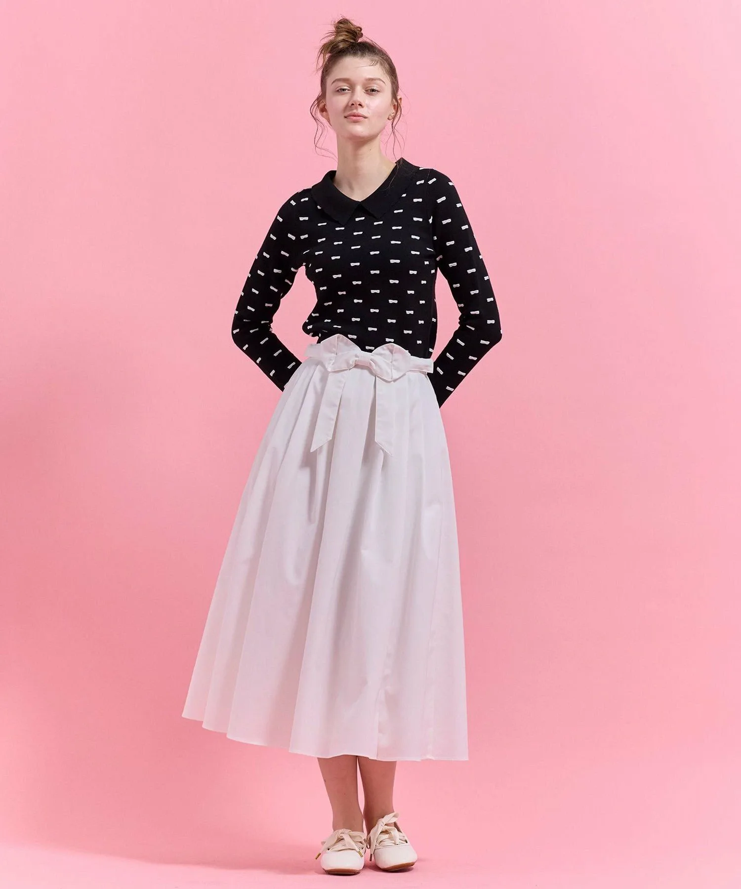 Этот пуловер украшен эффектным жаккардовым узором, напоминающим ряд маленьких ленточных мотивов. Его компактный силуэт и воротник добавляют элегантности и очарования. Тонкие линии на воротнике придают изделию нотку гламура. Этот топ — эффектная вещь, которая превратит простые брюки в милый образ в стиле TOCCA. Кардиган также доступен из того же материала.