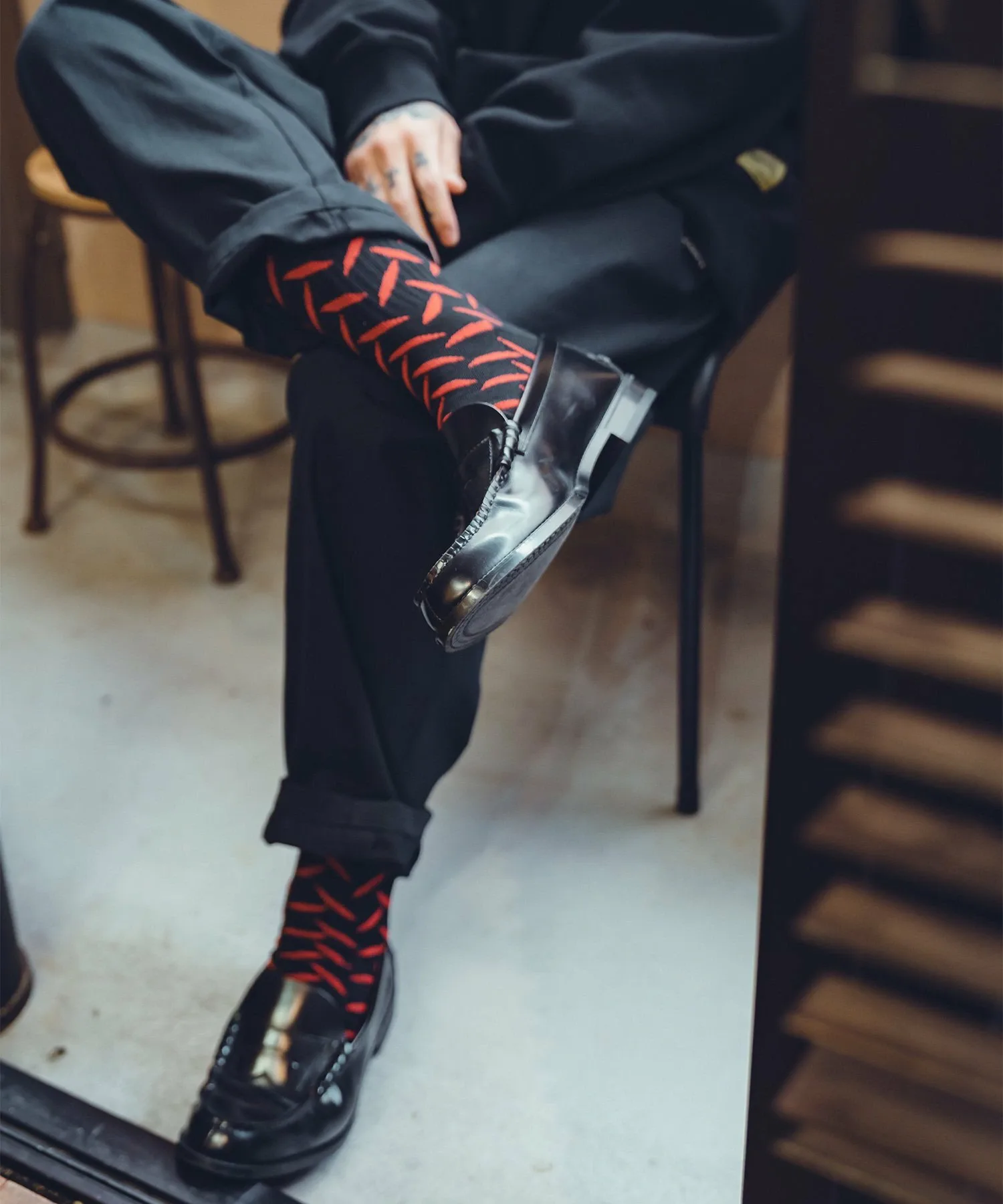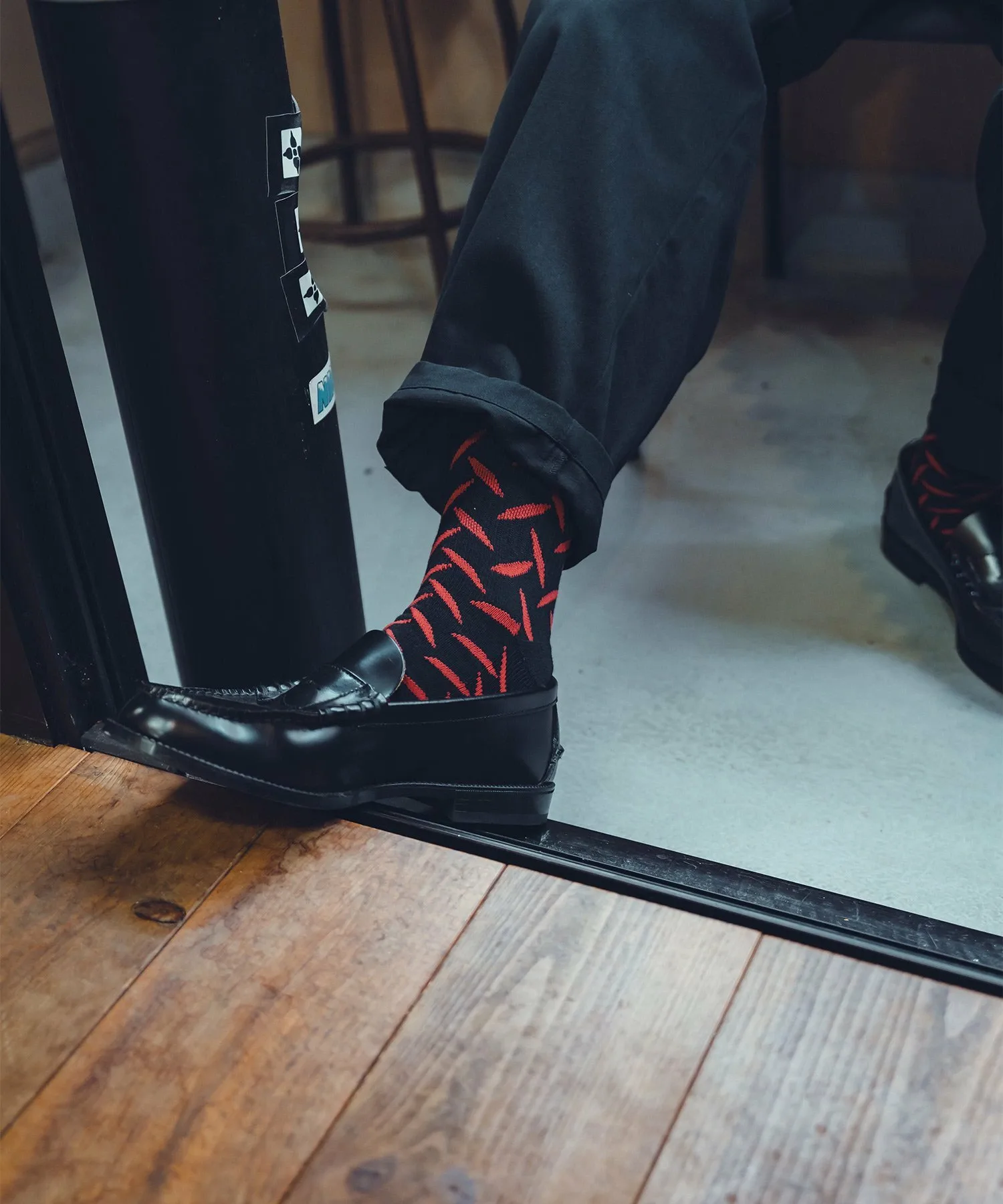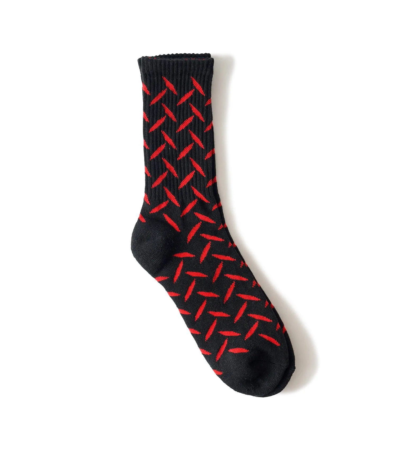 Вся ткань носков выполнена жаккардовым плетением с узором из полосатых стальных пластин (клетчатых пластин), используемых на строительных площадках и т. д.