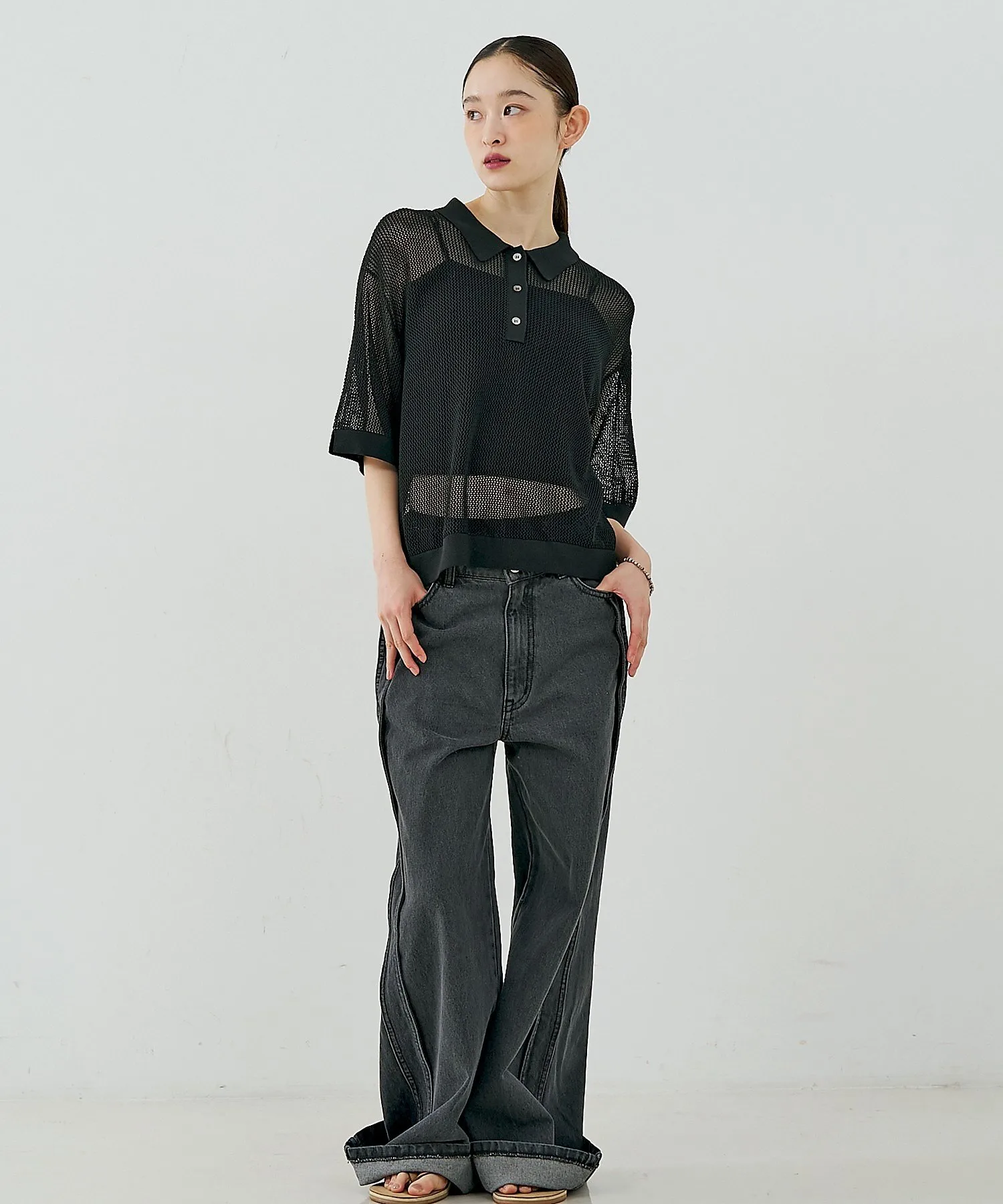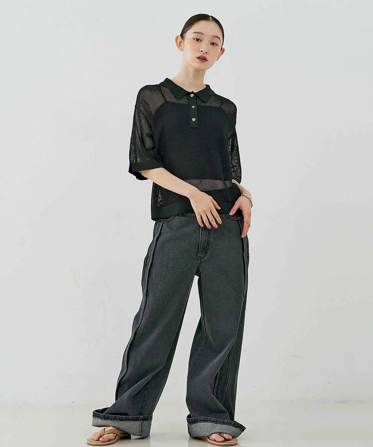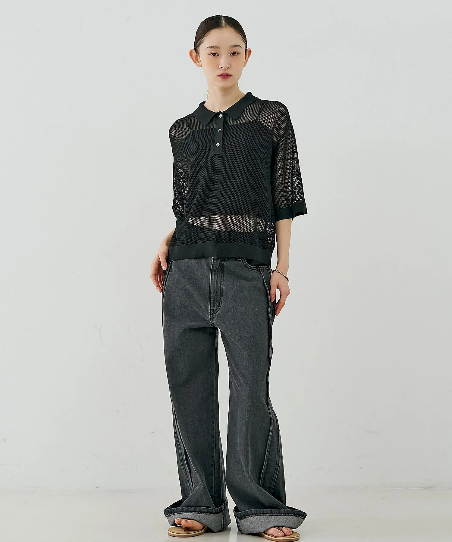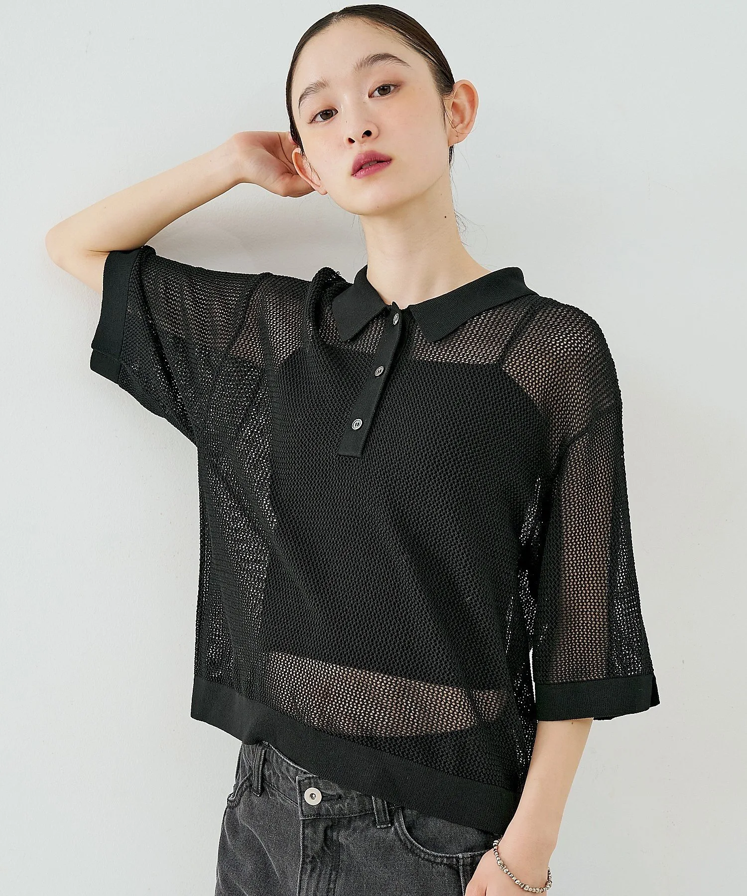 Поло из "легкой, прозрачной" ткани, сочетающее в себе ощущение прохлады и изысканный вид. Трикотажное поло NOMINE изготовлено из мягкой ткани, состоящей на 89% из вискозы и на 11% из нейлона, идеально подходящей для лета. Ключевая особенность – прозрачность легкой сетчатой ткани, позволяющая создавать разнообразные многослойные образы в зависимости от нижнего белья. Свободный, прямой силуэт (ширина 53 см, длина 52,5 см) и рукава средней длины (24,5 см) до локтей создают непринужденный, расслабленный образ. Доступно в четырех цветах: однотонный (фиолетовый/черный) и полосатый (светло-серый/коричневый), что делает его универсальным для самых разных случаев, от повседневных до официальных.