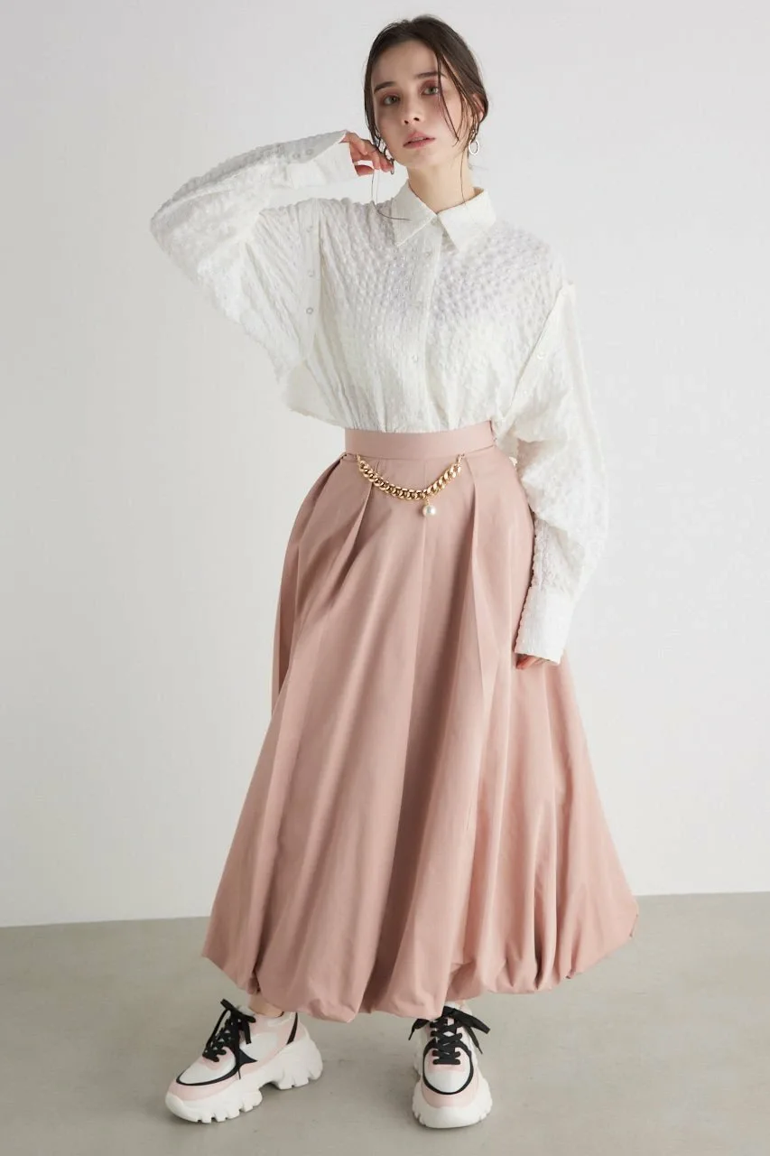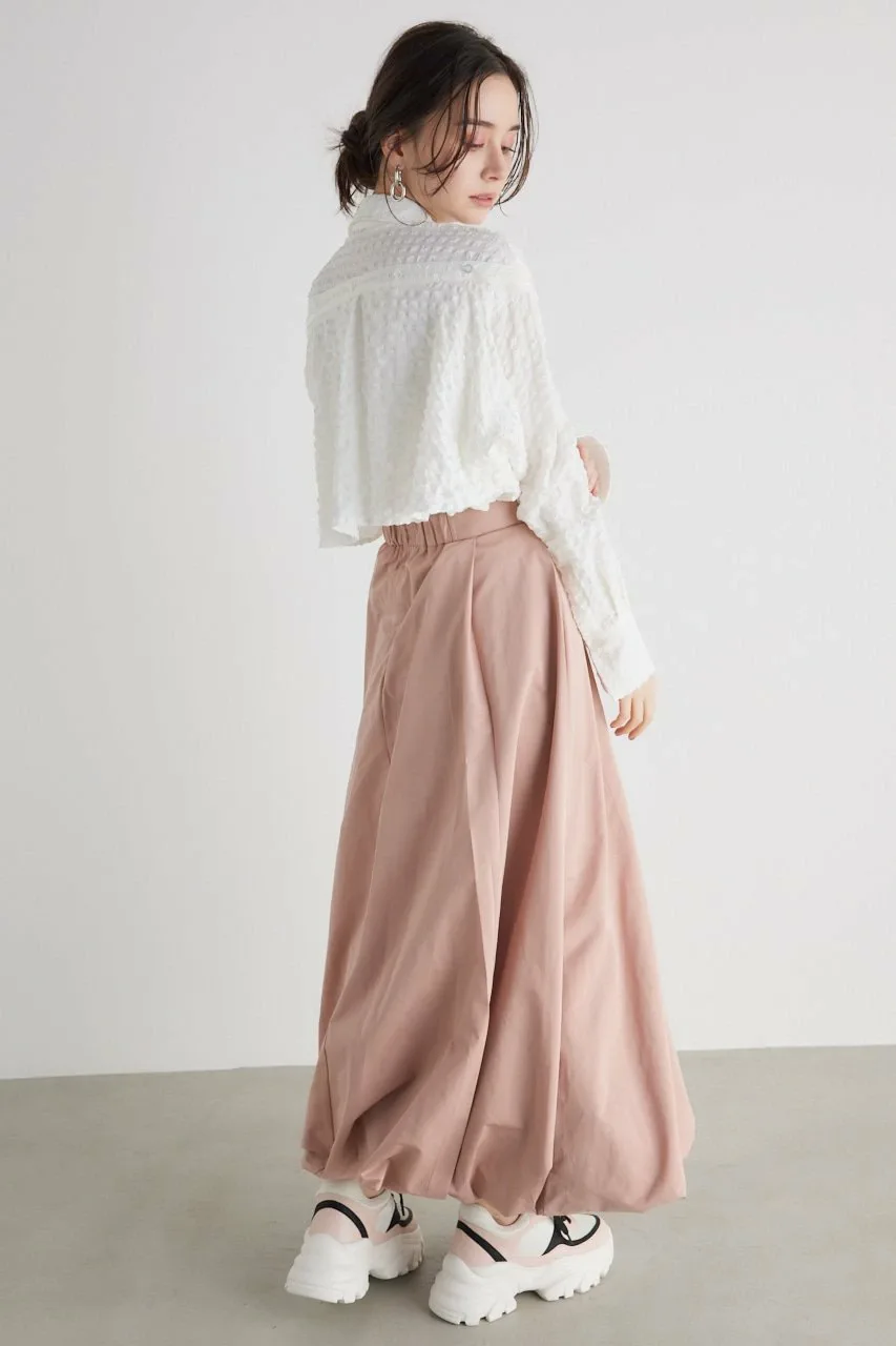 Расклешенная юбка с глубокими диагональными складками, расположенными случайным образом, создающими эффект «баллонного» подола.