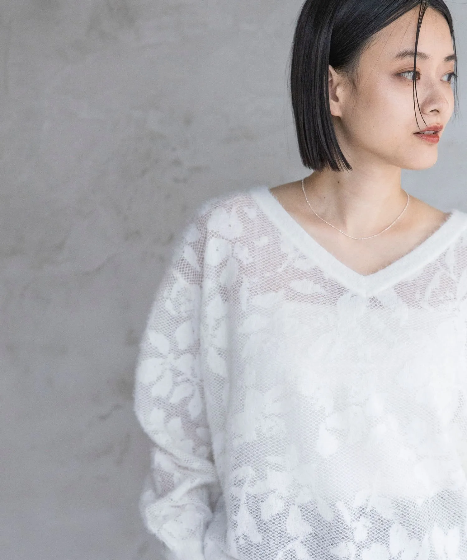Мы создали элегантный свободный пуловер с V-образным вырезом из прозрачного жаккардового трикотажа с длинным ворсом.