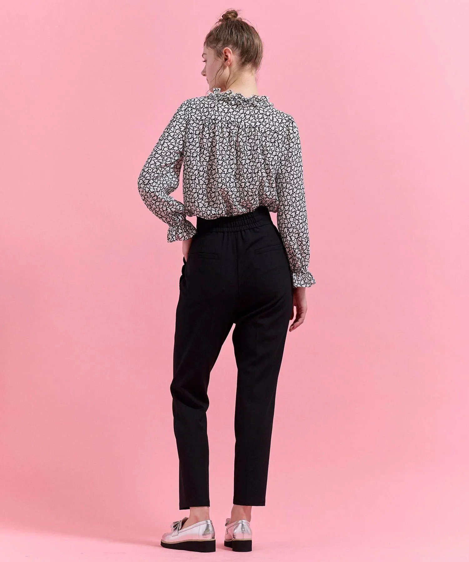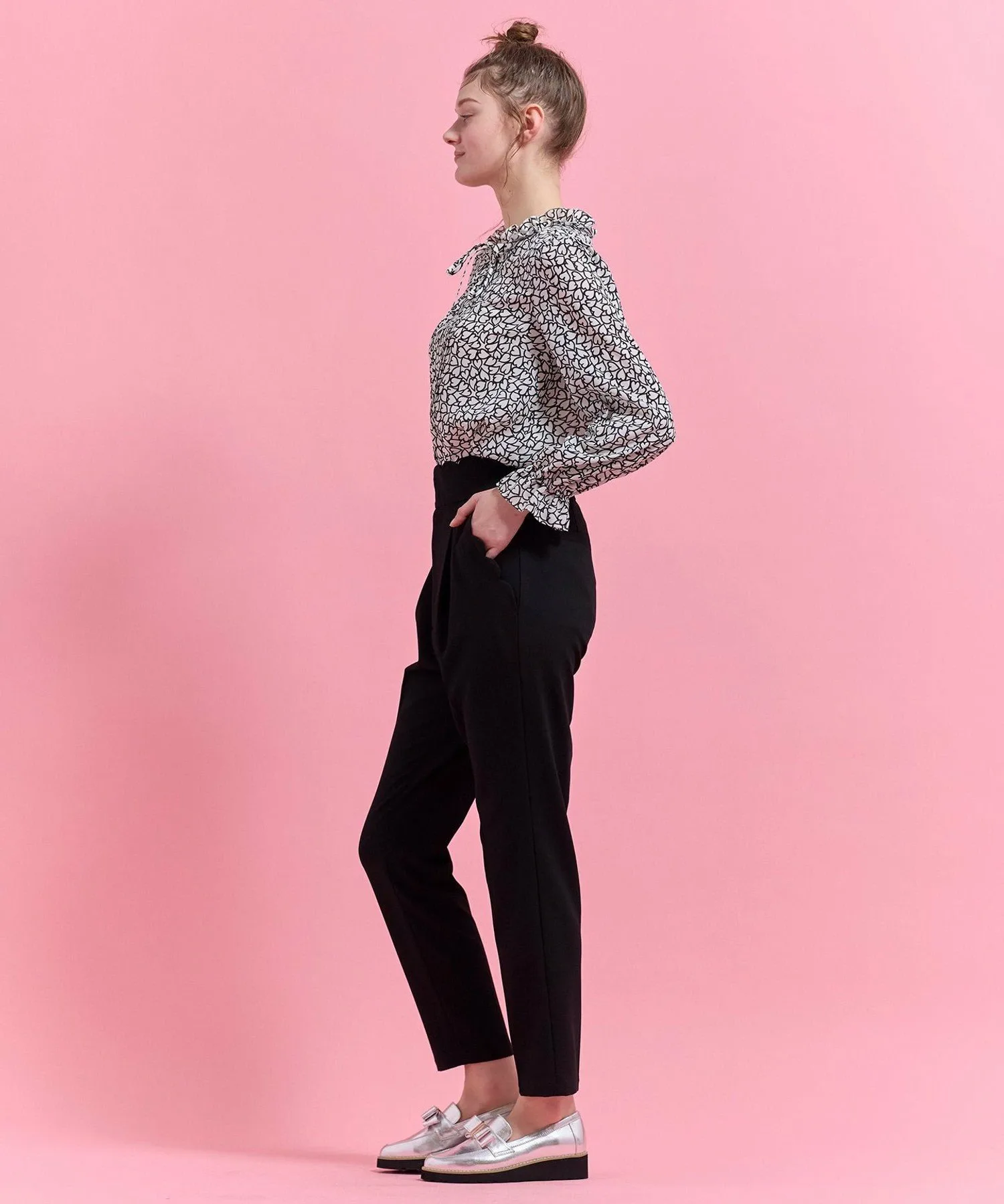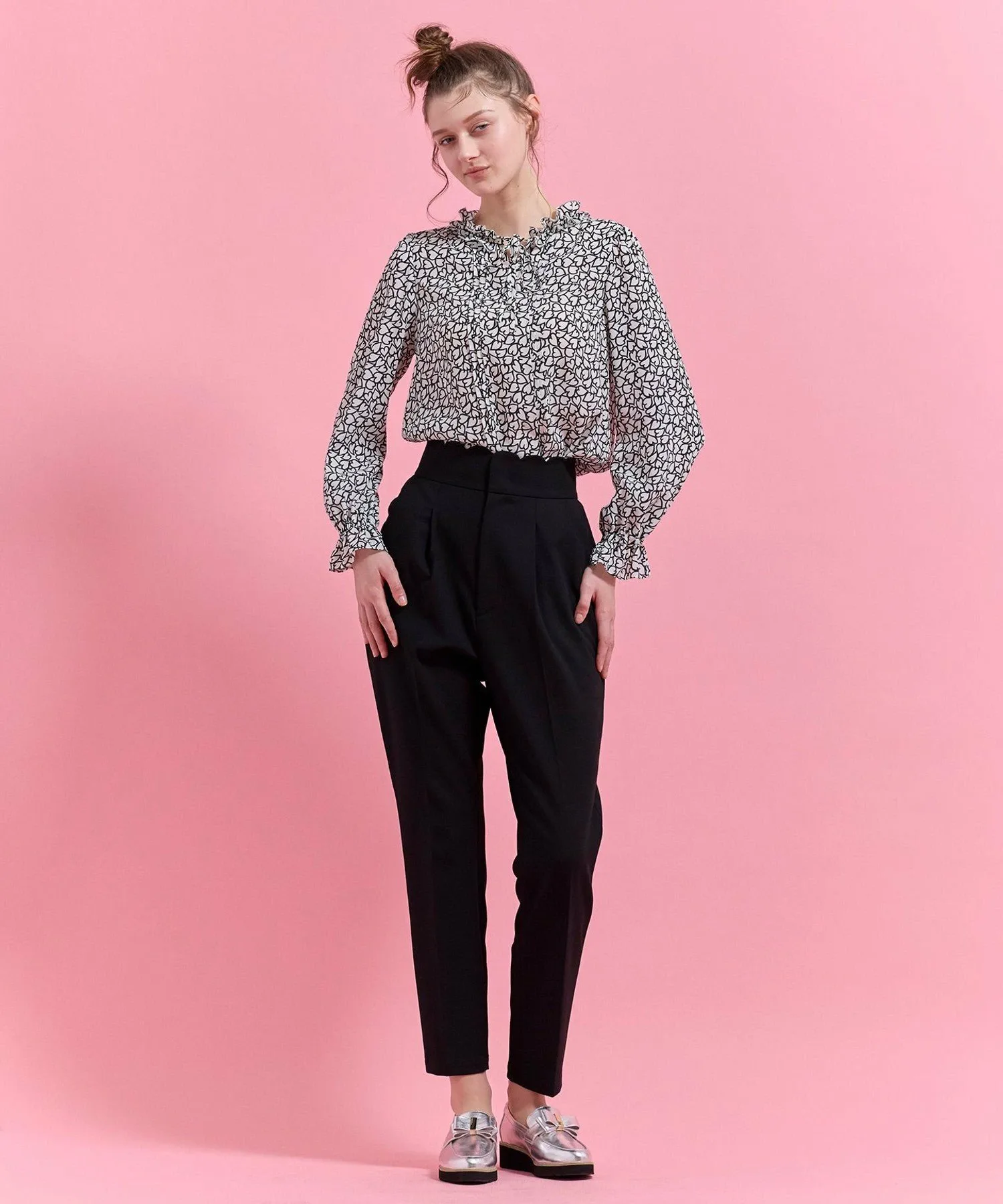 Эта великолепная блузка украшена привлекательным принтом в виде сердечек, геометрически соединенных цепочкой, и узором в виде сердечек, имеющим вечное значение.